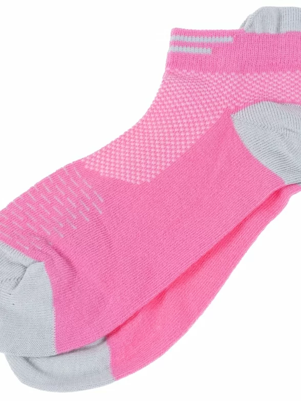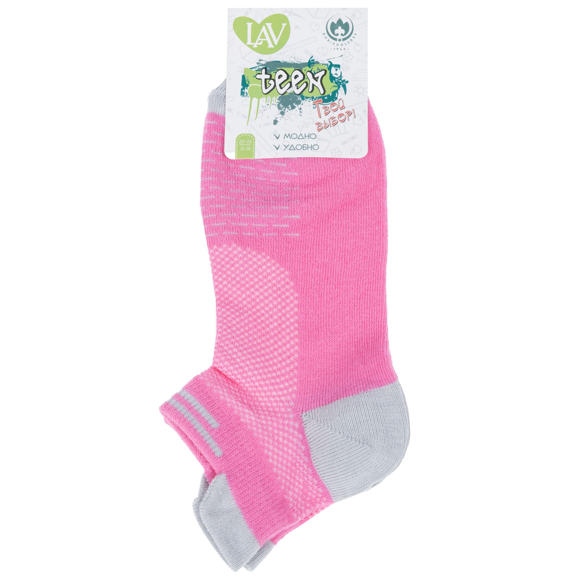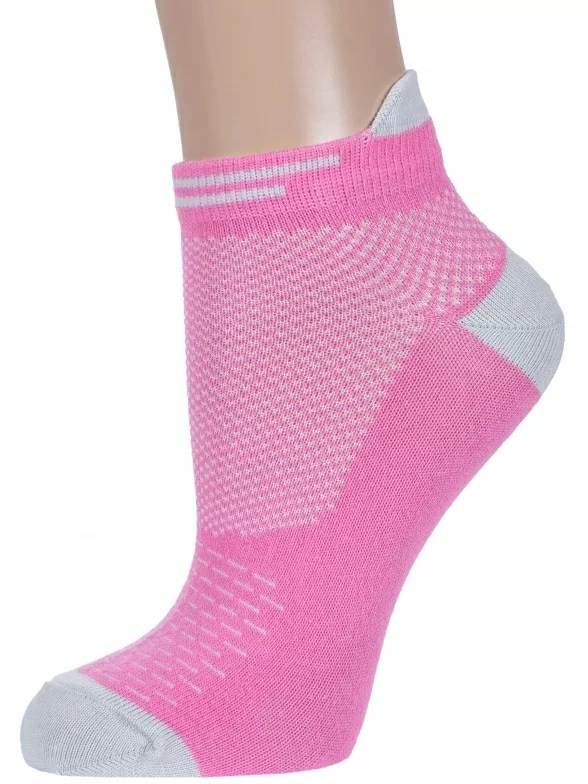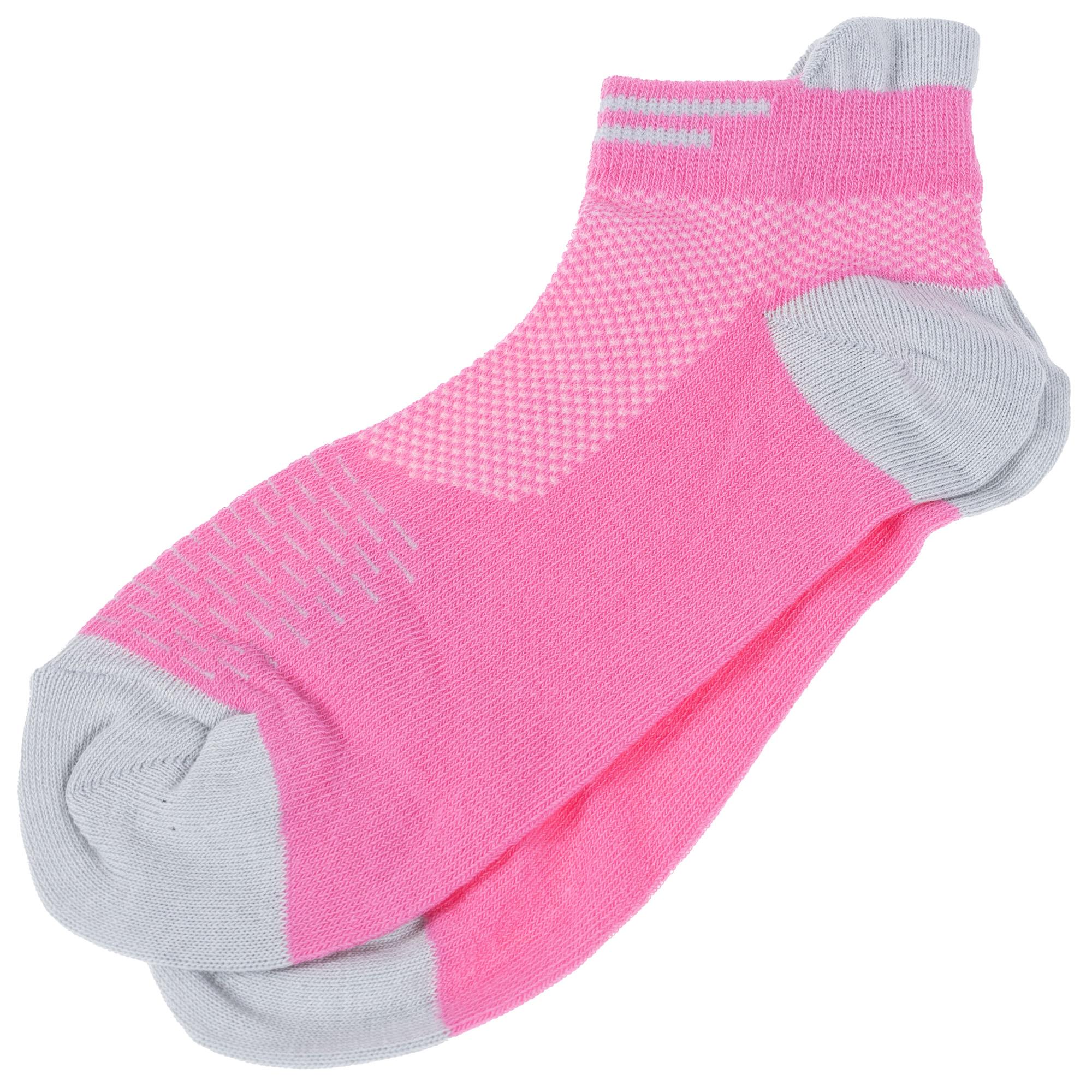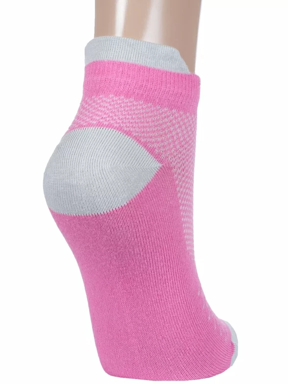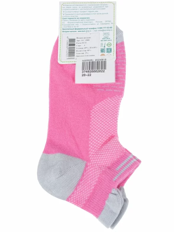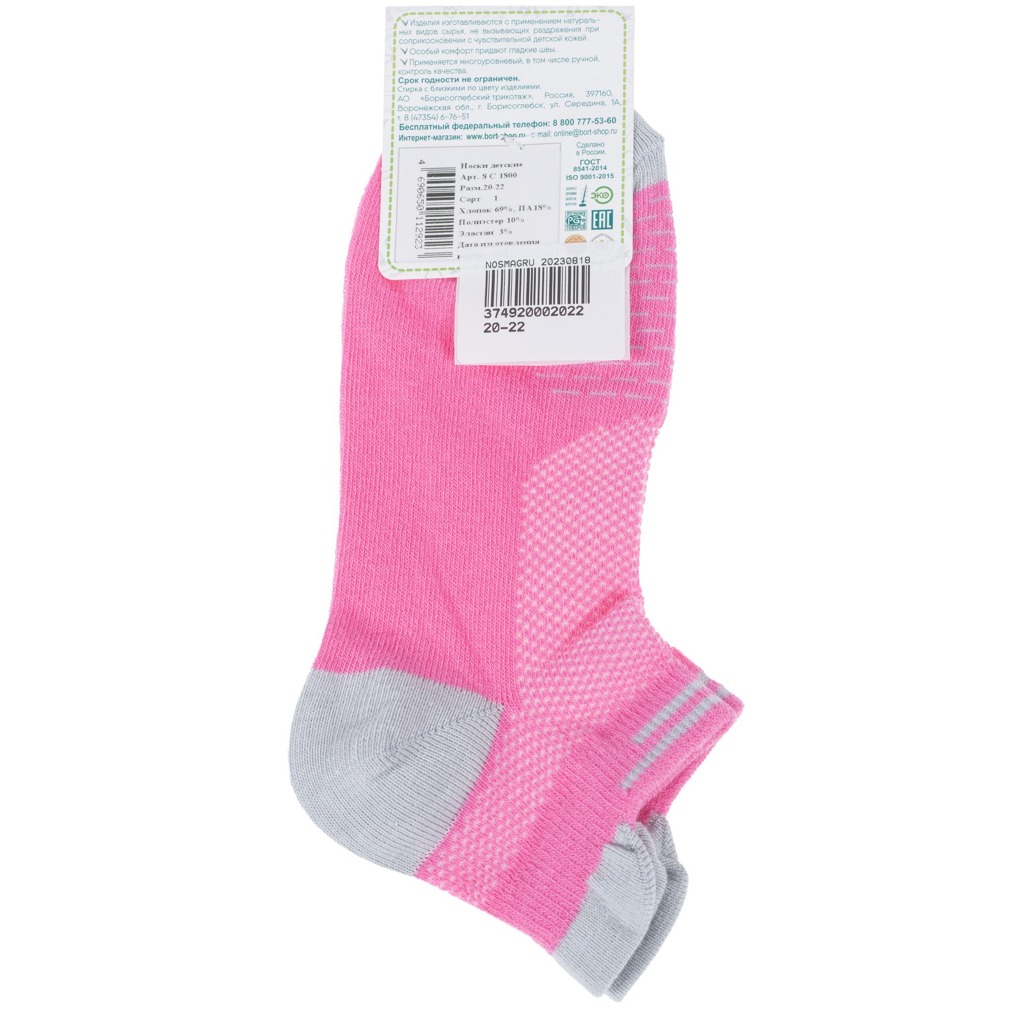 Круглогодичные короткие детские носки, цвет розовый, спортивные, в сеточку, ажурные, шов обычный (не бесшовные), принт (рисунок): полоски, мелкий принт, контрастные пятка / мысок / резинка, с узором, состав: 69% хлопок, 18% полиамид, 10% полиэстер, 3% эластан, арт. 8С1800. Производитель «АО Борисоглебский трикотаж, Воронежская обл, Россия» под брендом «Борисоглебский трикотаж».