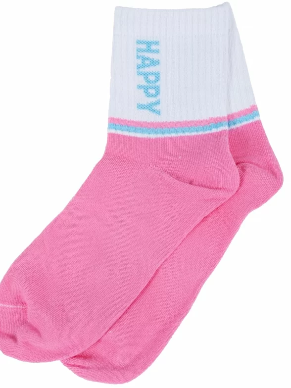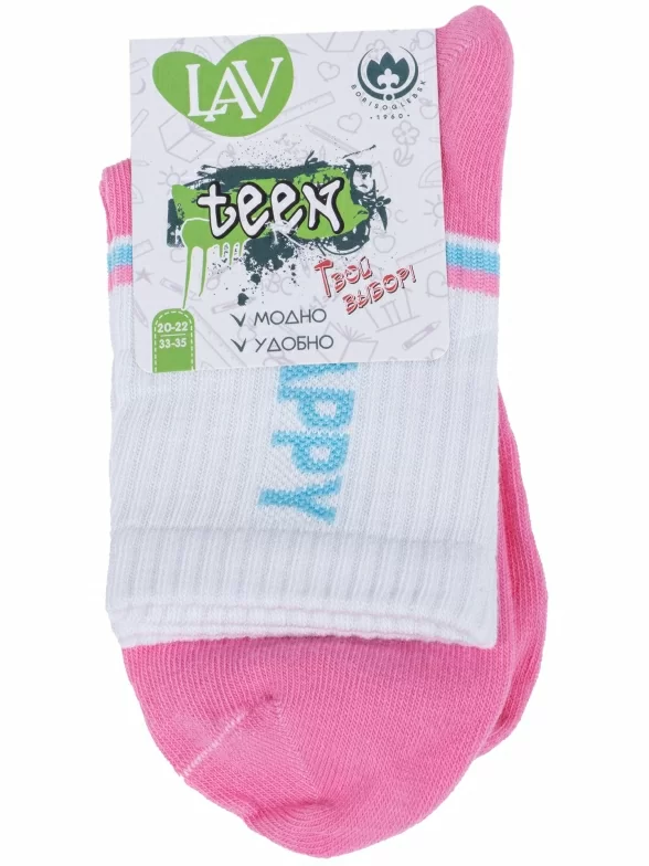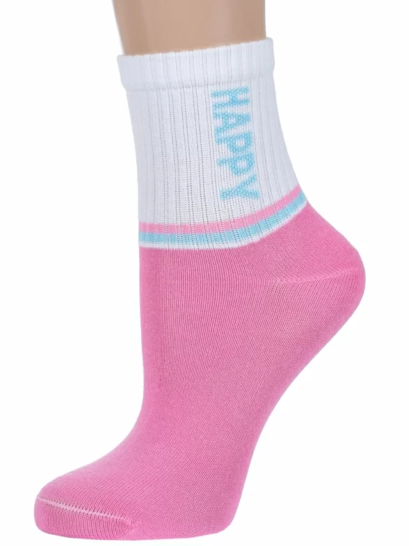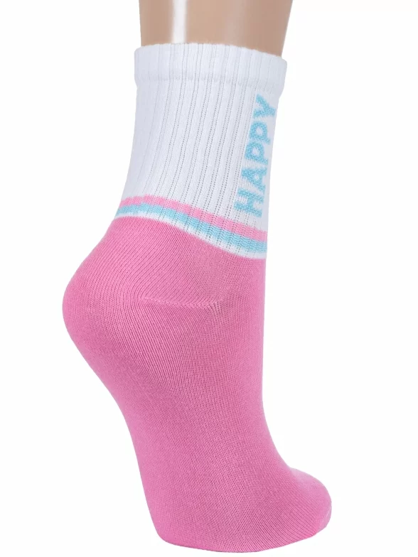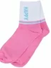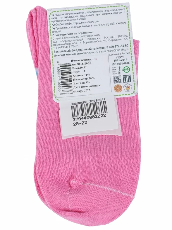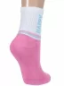Круглогодичные укороченные детские носки, цвет розовый, спортивные, повседневные, шов обычный (не бесшовные), принт (рисунок): надписи, контрастные пятка / мысок / резинка, с узором, состав: 71% хлопок, 26% полиэстер, 3% эластан, арт. 8СД1000/2. Производитель «АО Борисоглебский трикотаж, Воронежская обл, Россия» под брендом «Борисоглебский трикотаж».