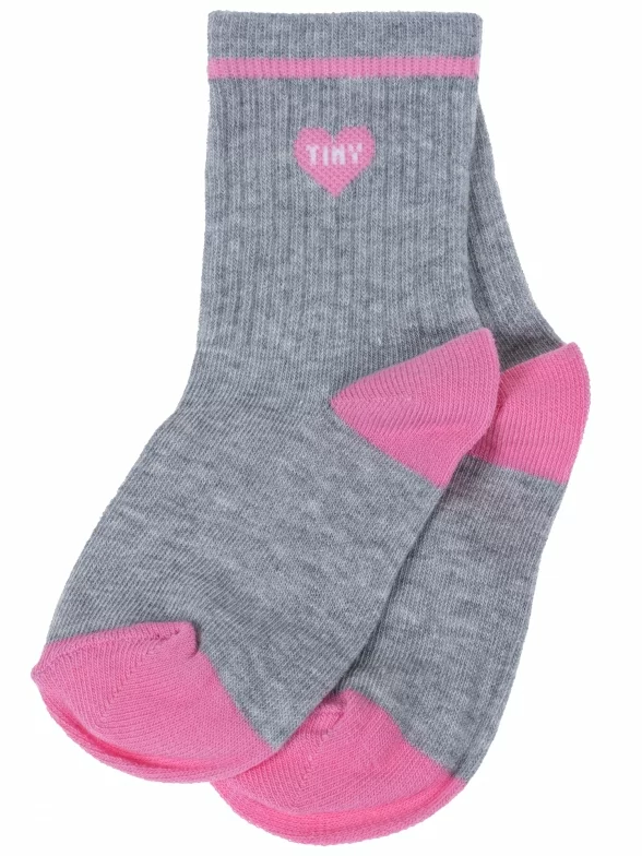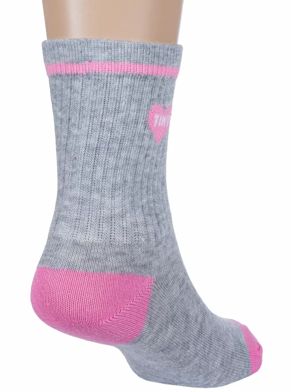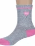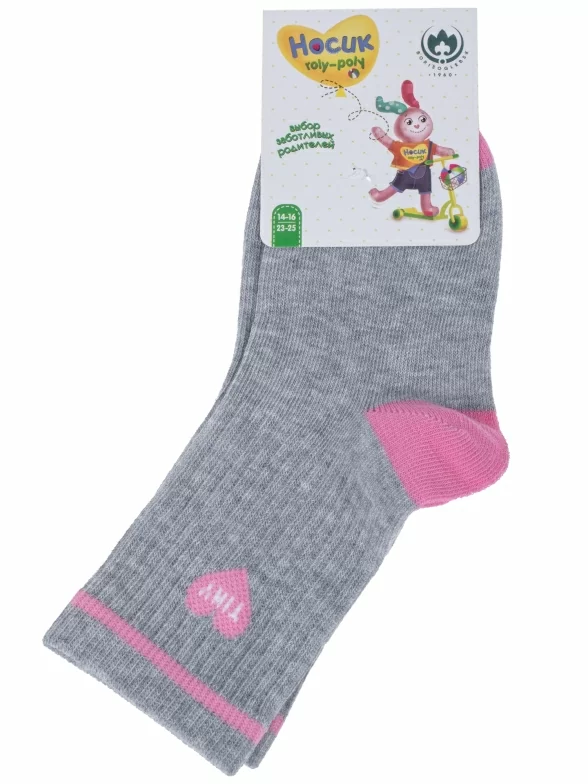 Круглогодичные средней длины детские носки, цвет серый, спортивные, шов обычный (не бесшовные), принт (рисунок): сердечки / поцелуи / любовь, контрастные пятка / мысок / резинка, в рубчик, с узором, состав: 75% хлопок, 22% полиамид, 3% эластан, арт. 8СД1001. Производитель «АО Борисоглебский трикотаж, Воронежская обл, Россия» под брендом «Борисоглебский трикотаж».