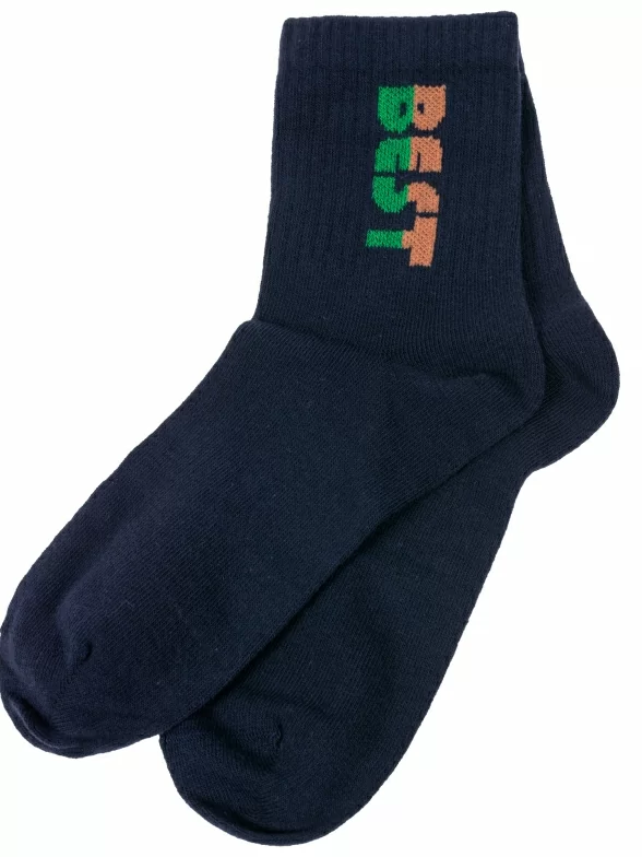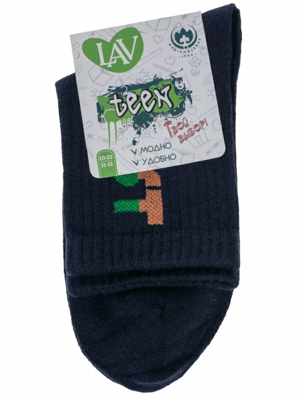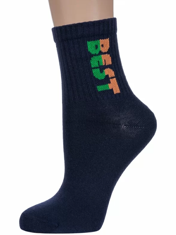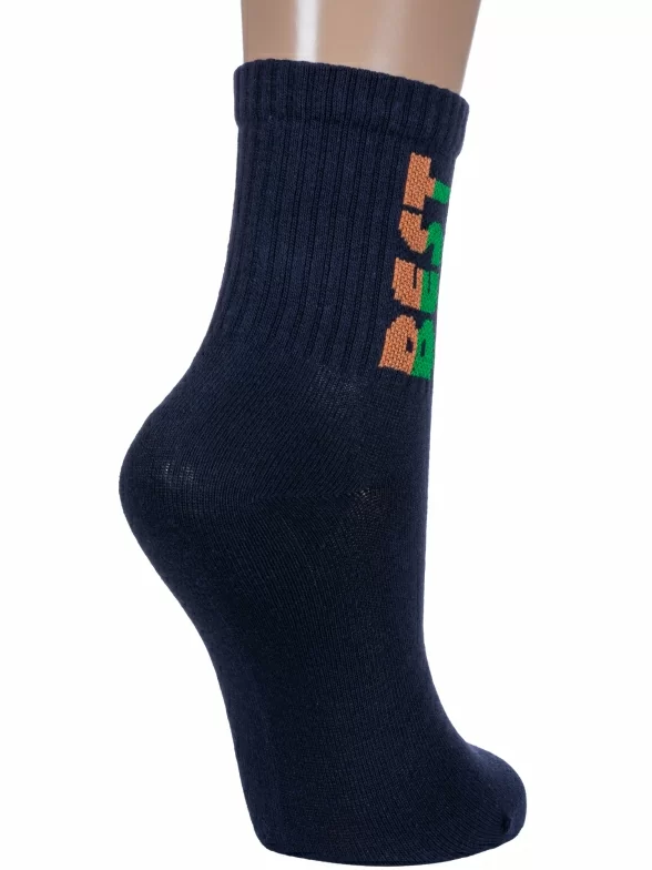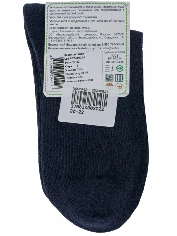 Круглогодичные укороченные детские носки, цвет темно-синий, спортивные, повседневные, шов кеттельный (бесшовная технология), принт (рисунок): надписи, в рубчик, небольшой рисунок, состав: 71% хлопок, 26% полиэстер, 3% эластан, арт. 8СМ1002/1. Производитель «АО Борисоглебский трикотаж, Воронежская обл, Россия» под брендом «Борисоглебский трикотаж».