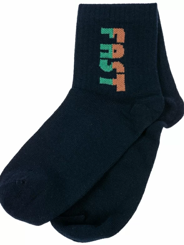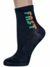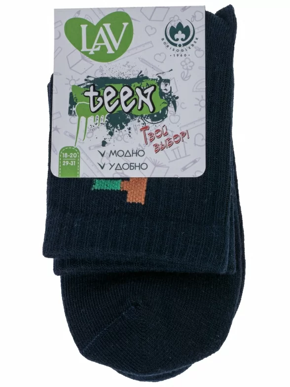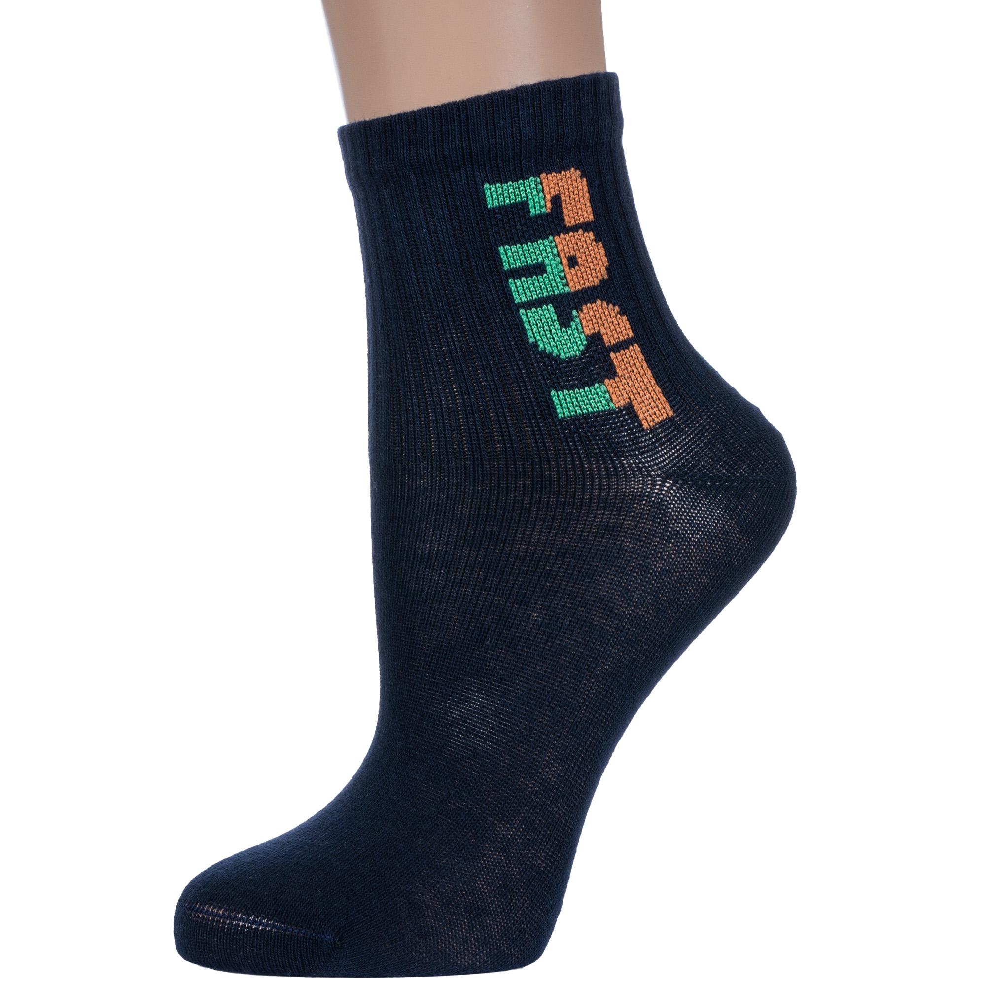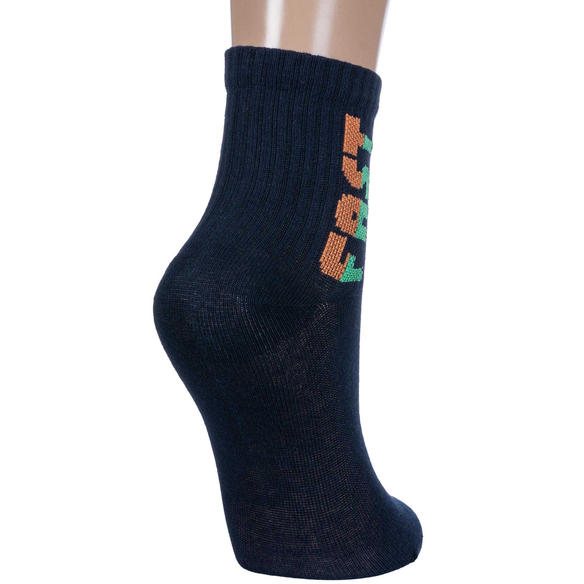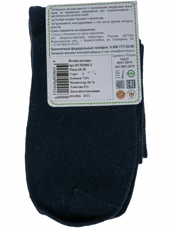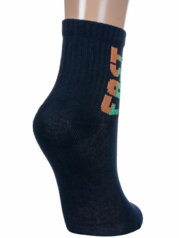 Круглогодичные укороченные детские носки, цвет темно-синий, спортивные, повседневные, шов кеттельный (бесшовная технология), принт (рисунок): надписи, в рубчик, небольшой рисунок, состав: 71% хлопок, 26% полиэстер, 3% эластан, арт. 8СМ1002/2. Производитель «АО Борисоглебский трикотаж, Воронежская обл, Россия» под брендом «Борисоглебский трикотаж».
