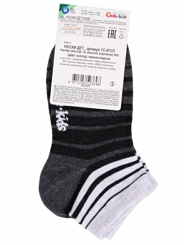 Круглогодичные укороченные детские носки, цвет темно-серый, спортивные, состав: 72% хлопок, 25.5% полиамид, 2.5% эластан, фабричный артикул 7С-97СП. Производитель «Conte, Беларусь» под брендом «Conte».
