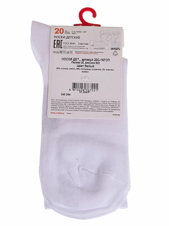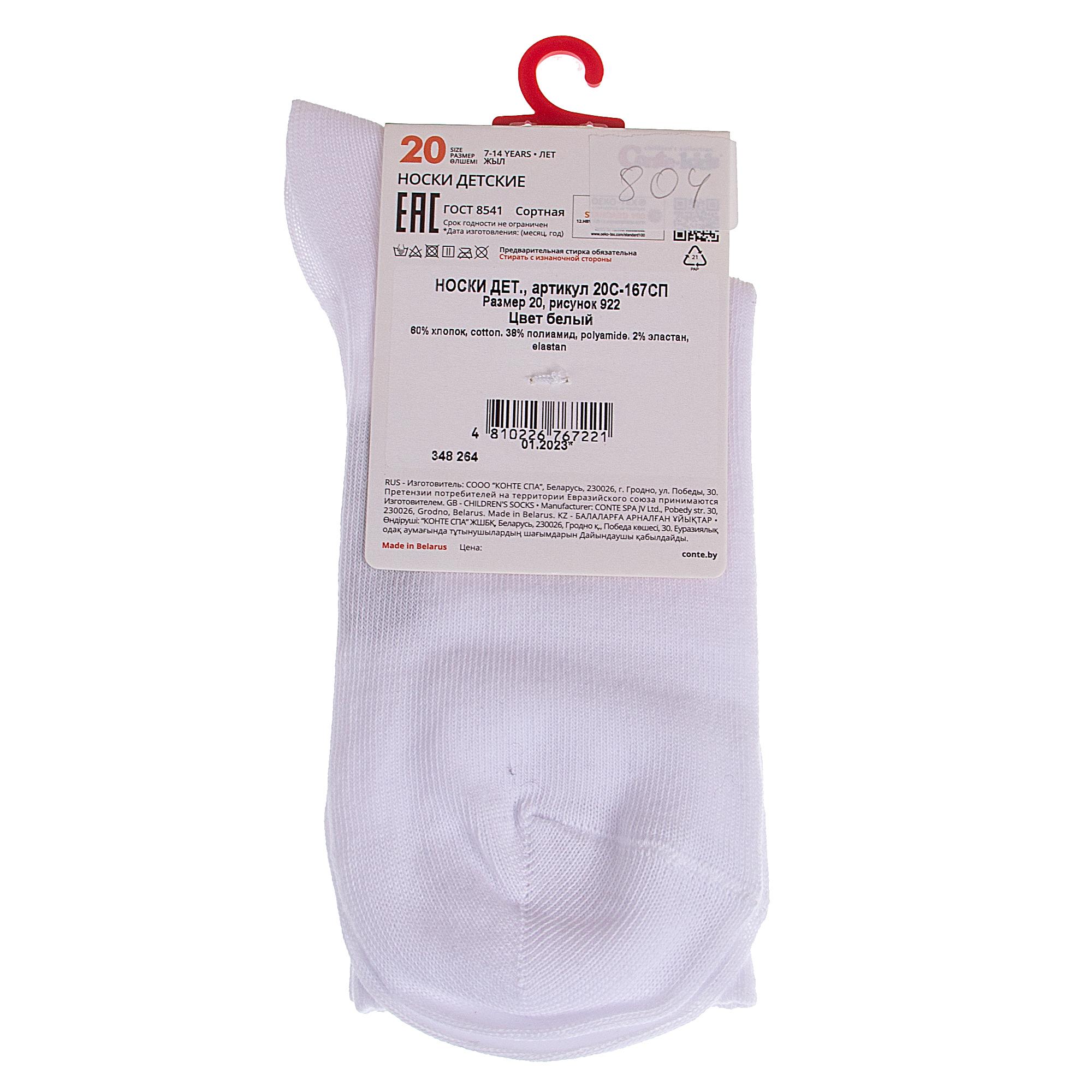 Круглогодичные средней длины детские носки, цвет белый, спортивные, состав: 60% хлопок, 38% полиамид, 2% эластан, фабричный артикул 20С-167СП. Производитель «Conte, Беларусь» под брендом «Conte».