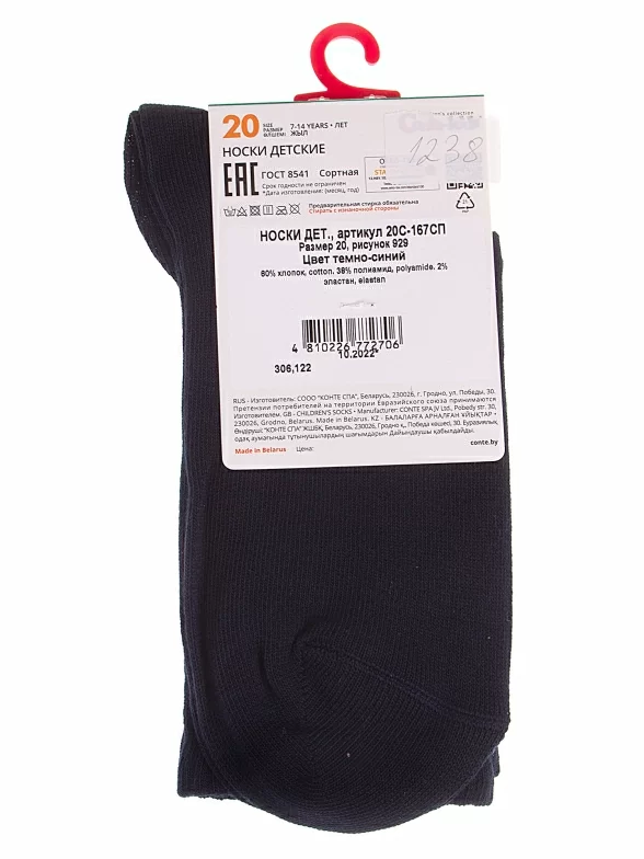 Круглогодичные средней длины детские носки, цвет темно-синий, спортивные, состав: 60% хлопок, 38% полиамид, 2% эластан, фабричный артикул 20С-167СП. Производитель «Conte, Беларусь» под брендом «Conte».