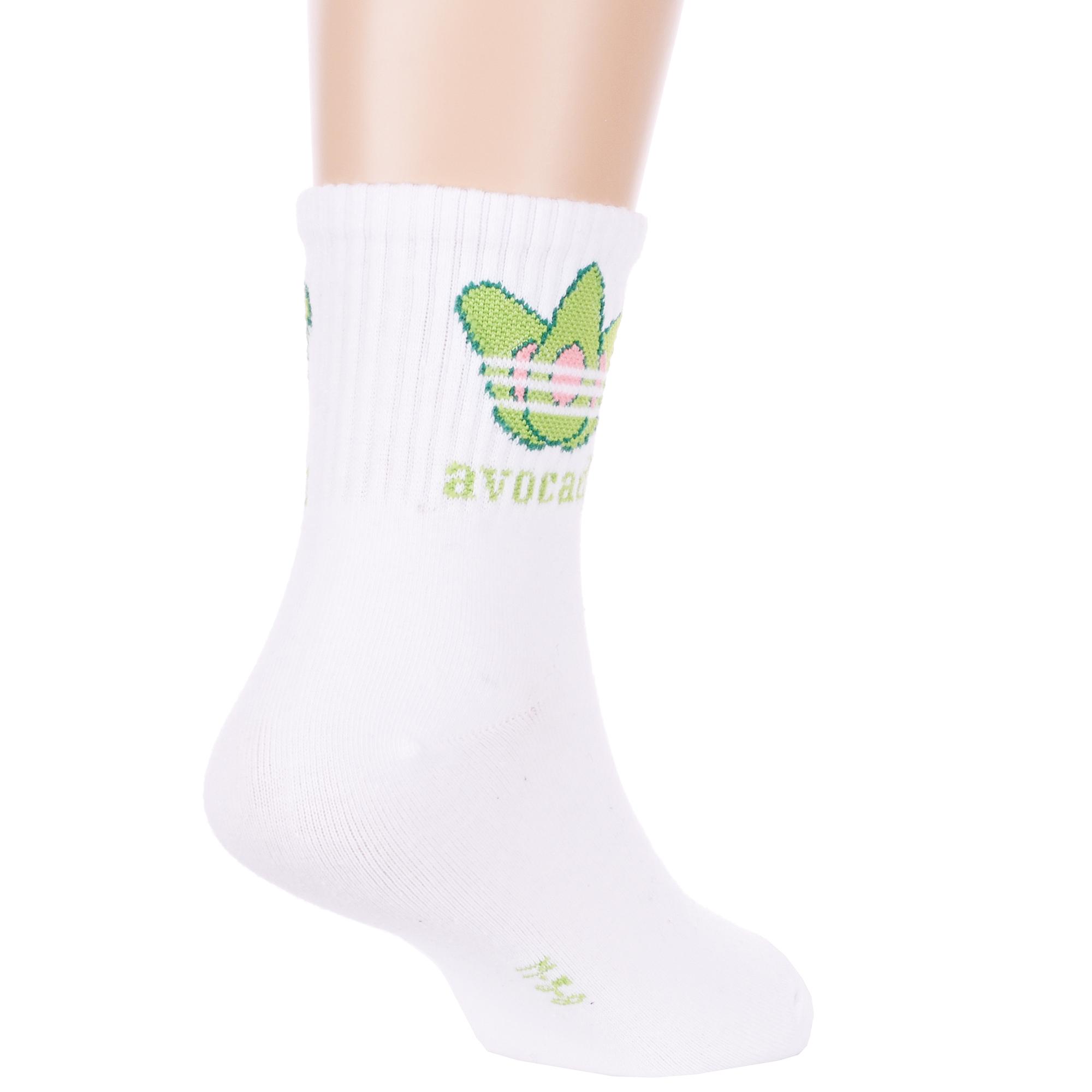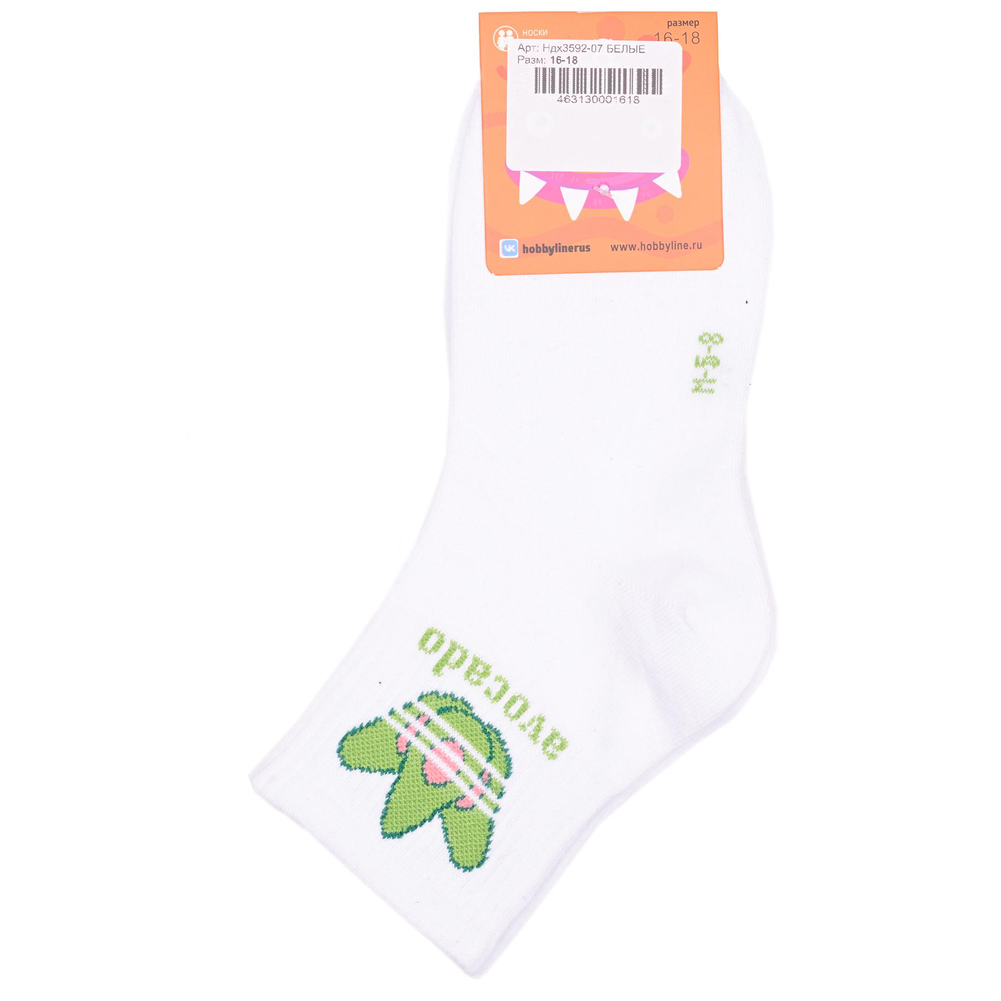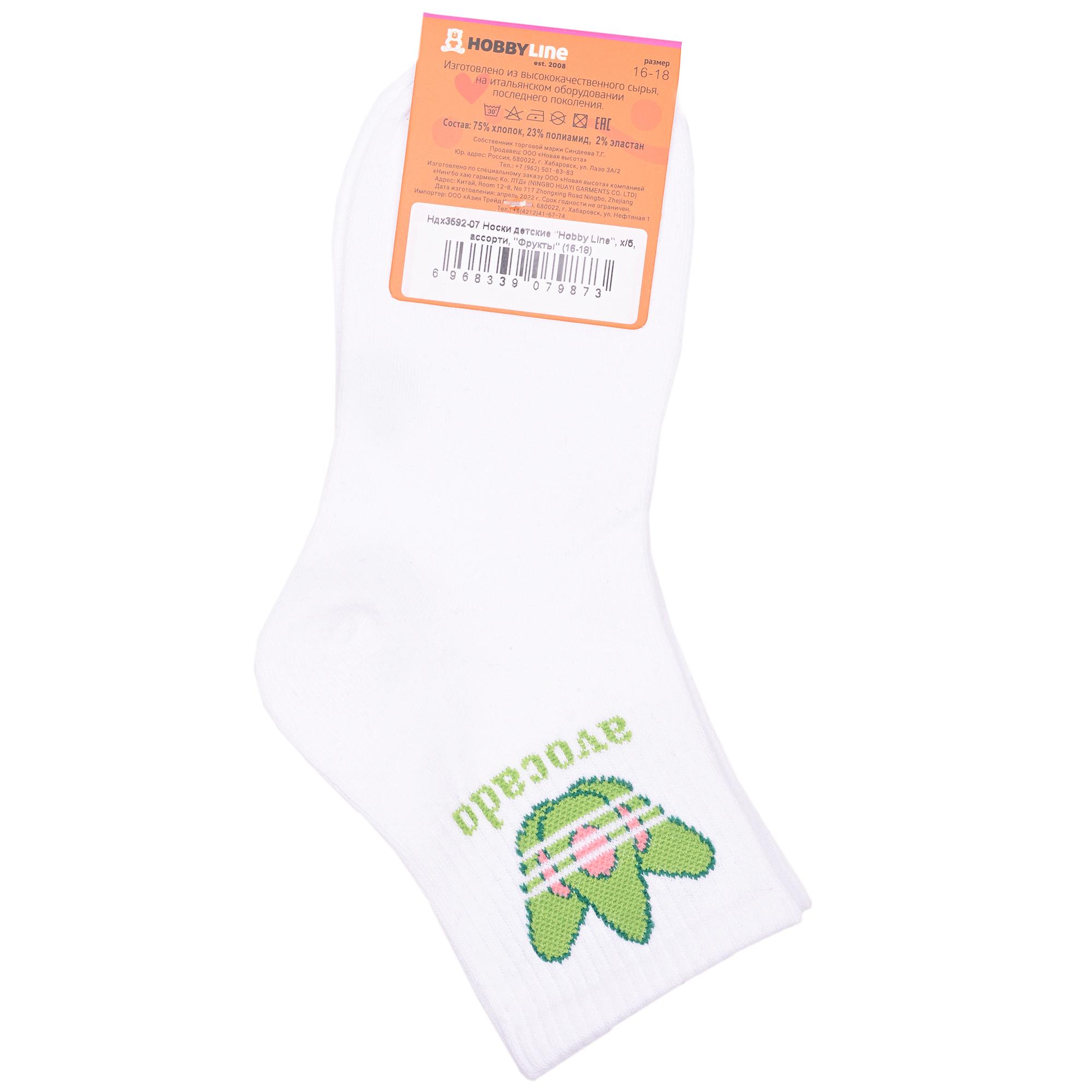 Круглогодичные укороченные детские носки, цвет белый, спортивные, повседневные, шов обычный (не бесшовные), принт (рисунок): овощи / фрукты / ягоды, надписи, еда и напитки, с узором, состав: 75% хлопок, 23% полиамид, 2% эластан, арт. Ндх3592-07. Производитель «Китай, страна бренда - Россия» под брендом «Hobby line».