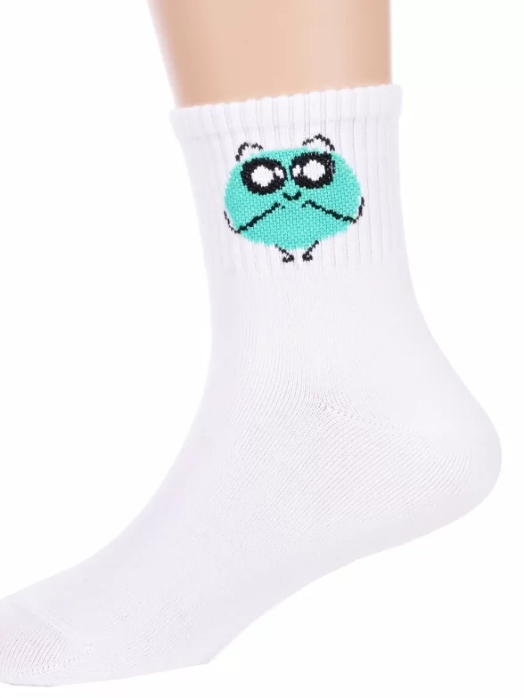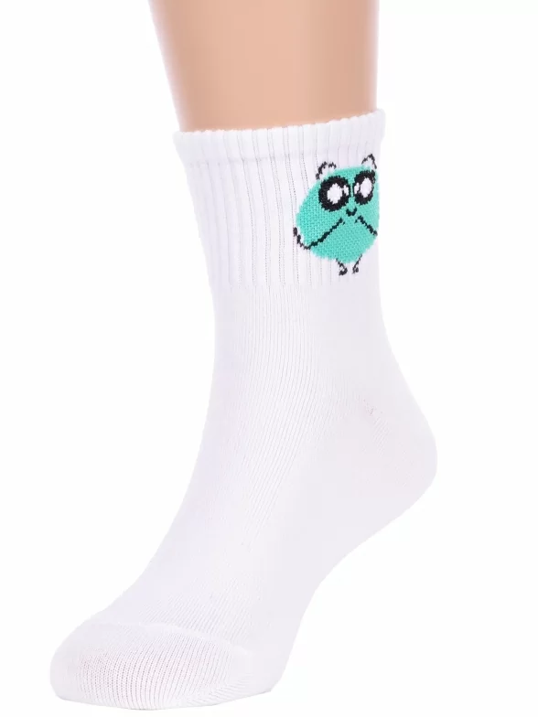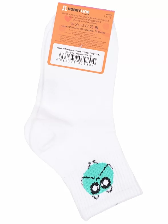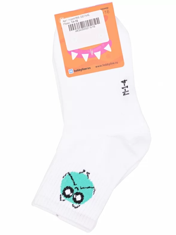 Круглогодичные укороченные детские носки, цвет белый, спортивные, с вышивкой, шов обычный (не бесшовные), принт (рисунок): животные, с узором, состав: 75% хлопок, 23% полиамид, 2% эластан, арт. Ндх4366. Производитель «Китай, страна бренда - Россия» под брендом «Hobby line».