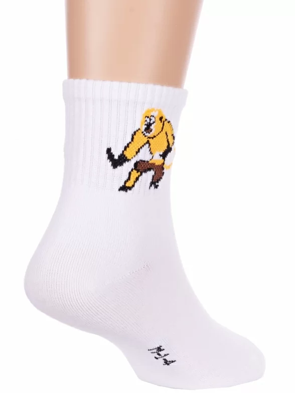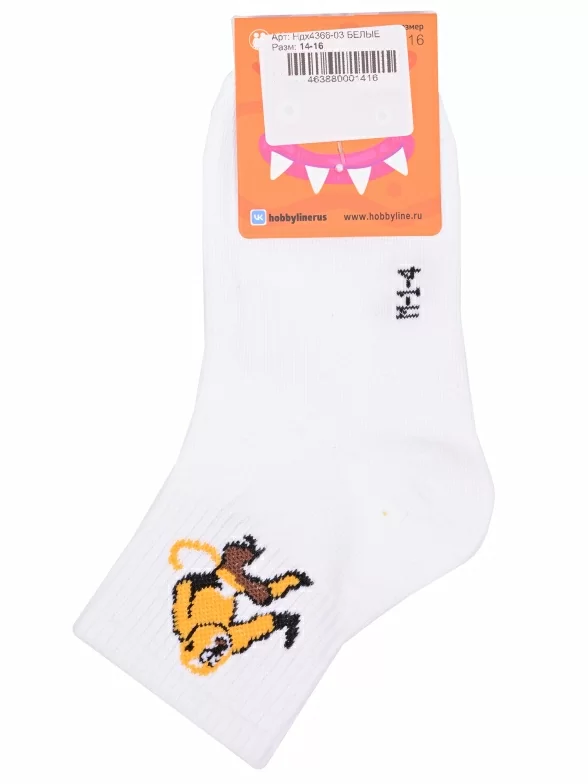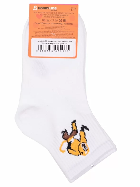 Круглогодичные укороченные детские носки, цвет белый, спортивные, с вышивкой, шов обычный (не бесшовные), принт (рисунок): животные, с узором, состав: 75% хлопок, 23% полиамид, 2% эластан, арт. Ндх4366-03. Производитель «Китай, страна бренда - Россия» под брендом «Hobby line».