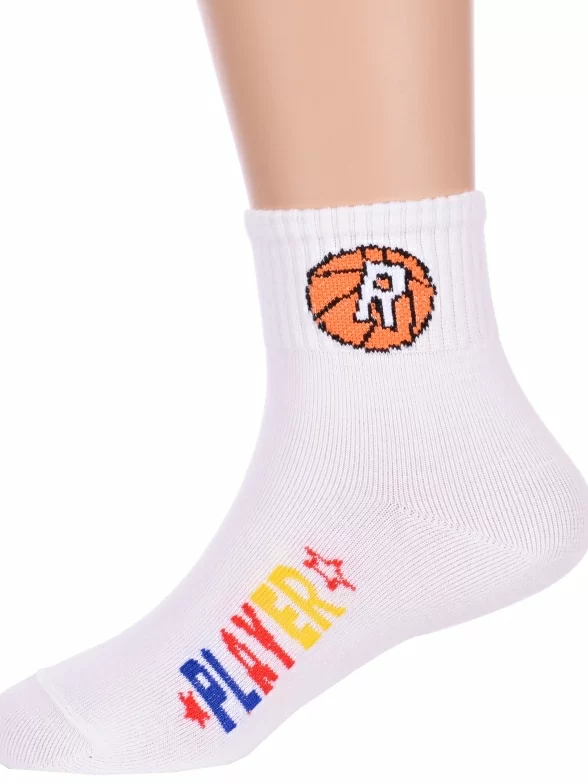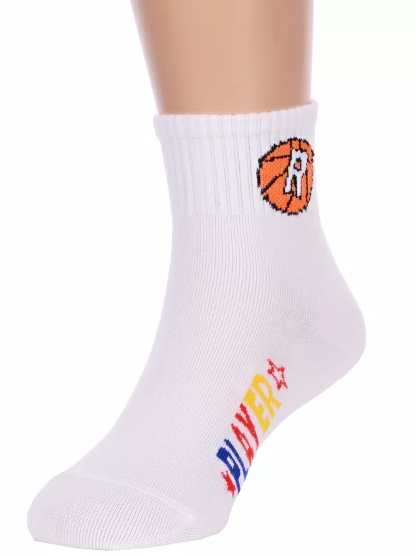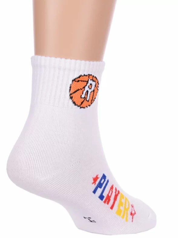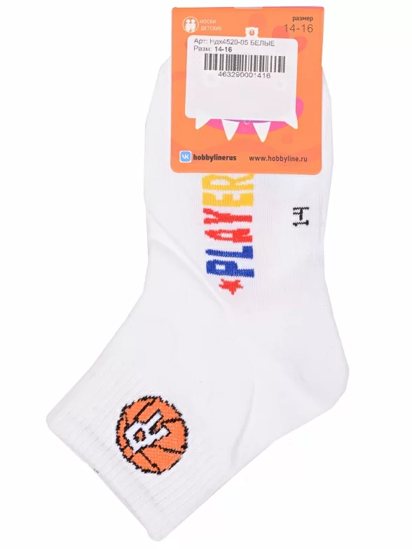 Круглогодичные укороченные детские носки, цвет белый, спортивные, повседневные, шов обычный (не бесшовные), принт (рисунок): спортивные, надписи, игры, с узором, состав: 75% хлопок, 23% полиамид, 2% эластан, арт. Ндх4520-05. Производитель «Китай, страна бренда - Россия» под брендом «Hobby line».