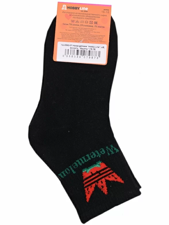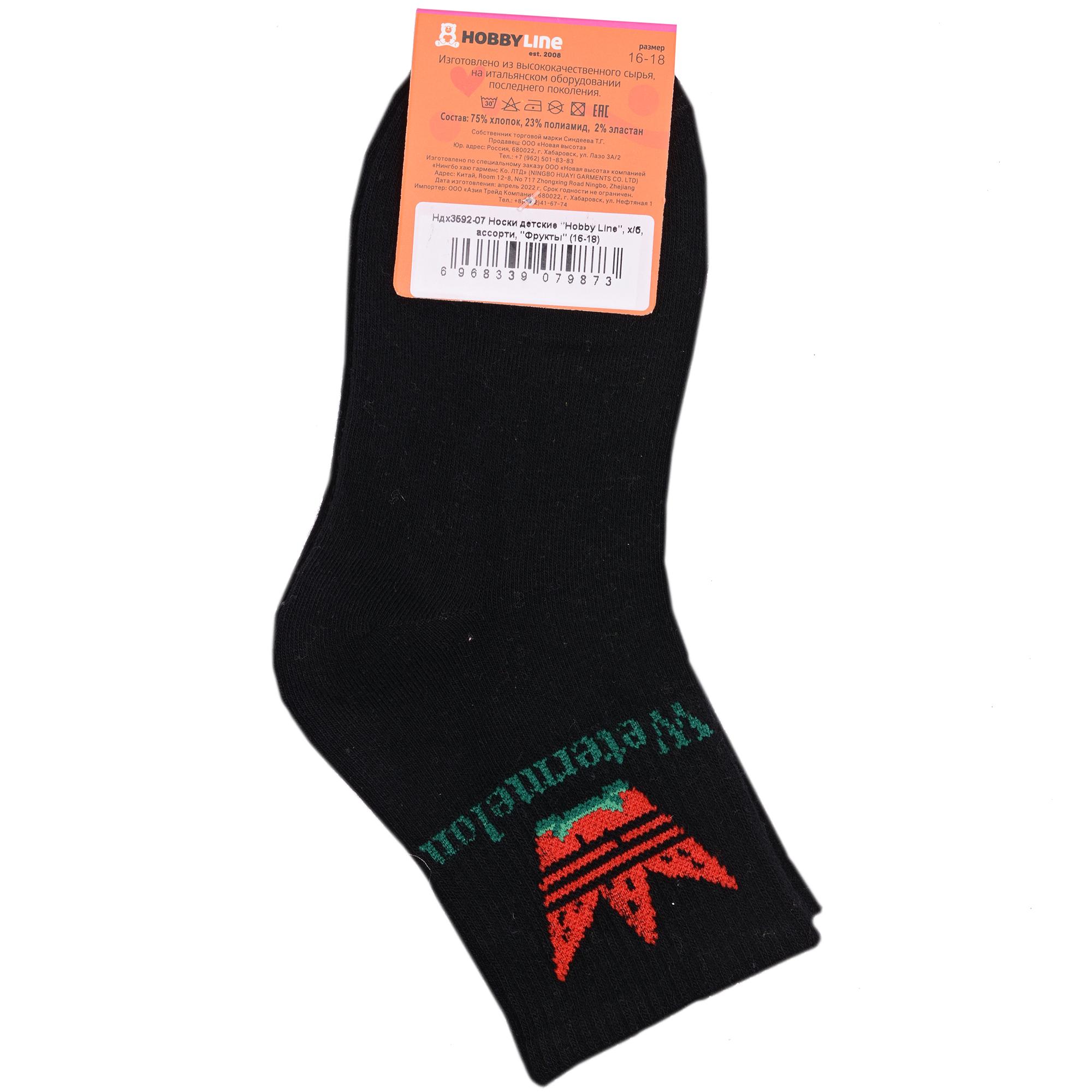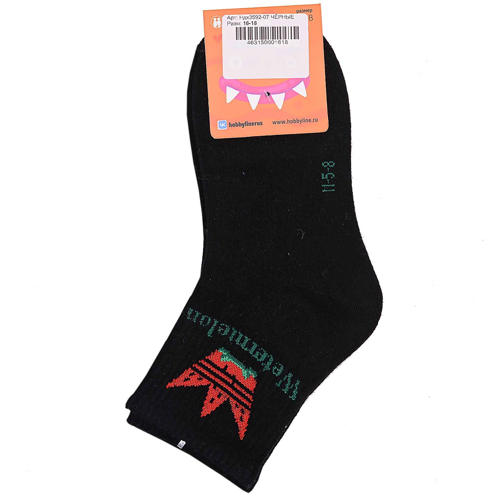 Круглогодичные укороченные детские носки, цвет черный, спортивные, повседневные, шов обычный (не бесшовные), принт (рисунок): овощи / фрукты / ягоды, надписи, еда и напитки, с узором, состав: 75% хлопок, 23% полиамид, 2% эластан, арт. Ндх3592-07. Производитель «Китай, страна бренда - Россия» под брендом «Hobby line».