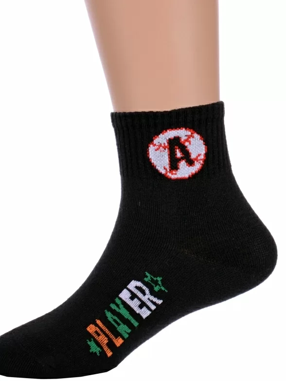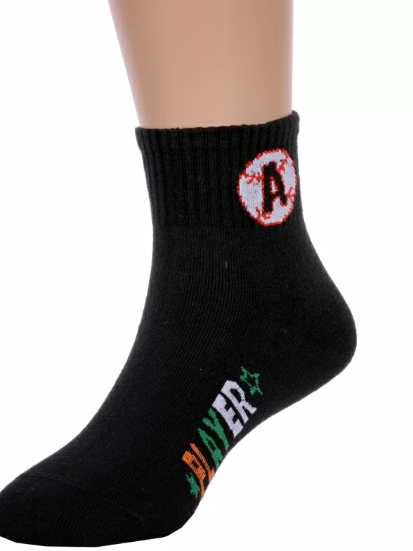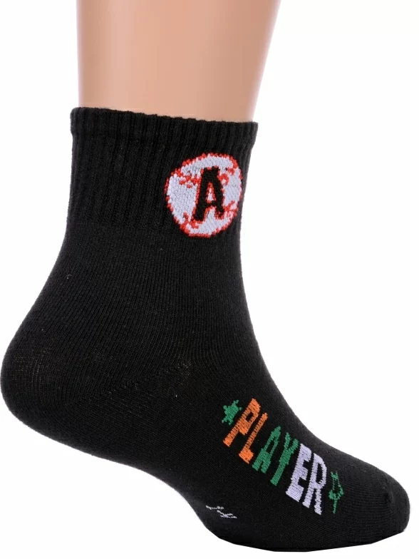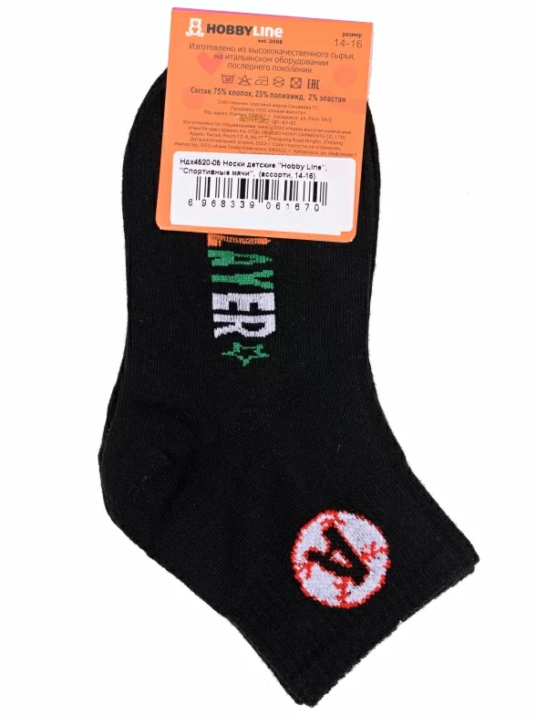 Круглогодичные укороченные детские носки, цвет черный, спортивные, повседневные, шов обычный (не бесшовные), принт (рисунок): спортивные, надписи, игры, с узором, состав: 75% хлопок, 23% полиамид, 2% эластан, арт. Ндх4520-05. Производитель «Китай, страна бренда - Россия» под брендом «Hobby line».