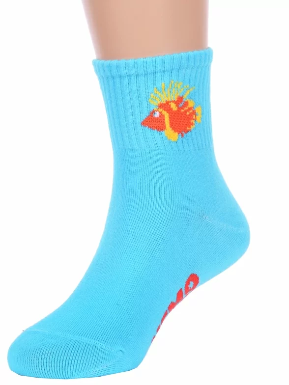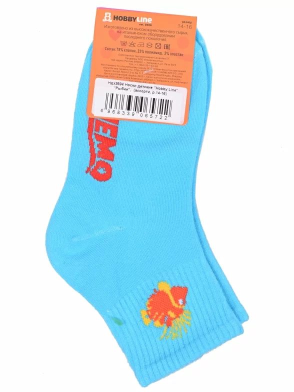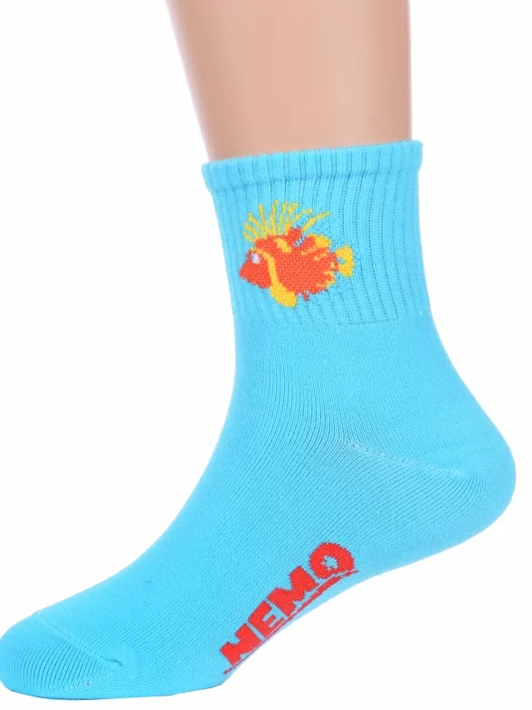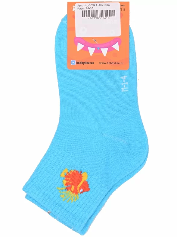 Круглогодичные укороченные детские носки, цвет голубой, спортивные, с вышивкой, шов обычный (не бесшовные), принт (рисунок): фильмы / сериалы / мультики, надписи, животные, с узором, состав: 75% хлопок, 23% полиамид, 2% эластан, арт. Ндх3594. Производитель «Китай, страна бренда - Россия» под брендом «Hobby line».