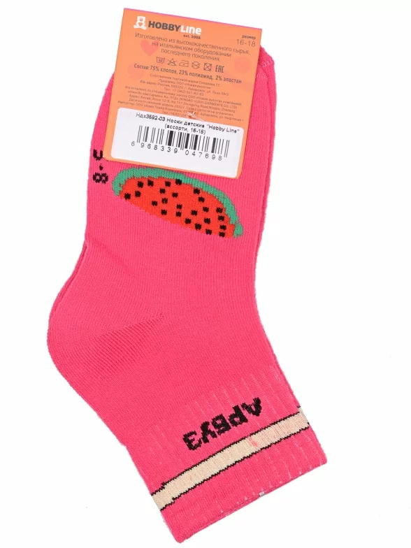 Круглогодичные укороченные детские носки, цвет розовый, спортивные, повседневные, необычные, шов обычный (не бесшовные), принт (рисунок): овощи / фрукты / ягоды, надписи, с узором, состав: 75% хлопок, 23% полиамид, 2% эластан, арт. Ндх3592-03. Производитель «Китай, страна бренда - Россия» под брендом «Hobby line».