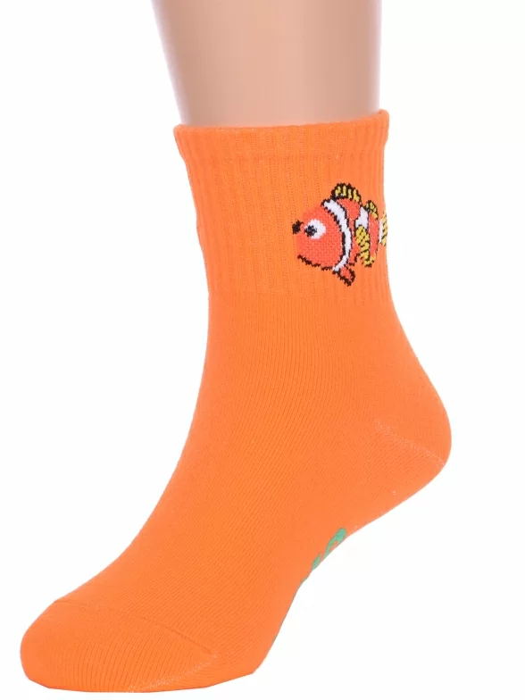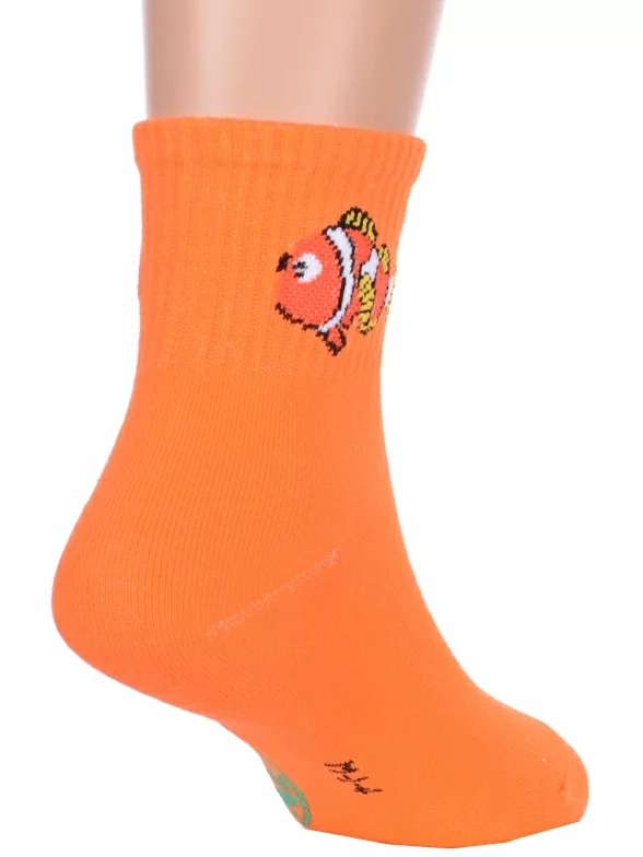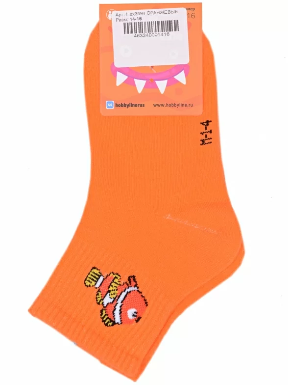 Круглогодичные укороченные детские носки, цвет оранжевый, спортивные, с вышивкой, шов обычный (не бесшовные), принт (рисунок): фильмы / сериалы / мультики, надписи, животные, с узором, состав: 75% хлопок, 23% полиамид, 2% эластан, арт. Ндх3594. Производитель «Китай, страна бренда - Россия» под брендом «Hobby line».