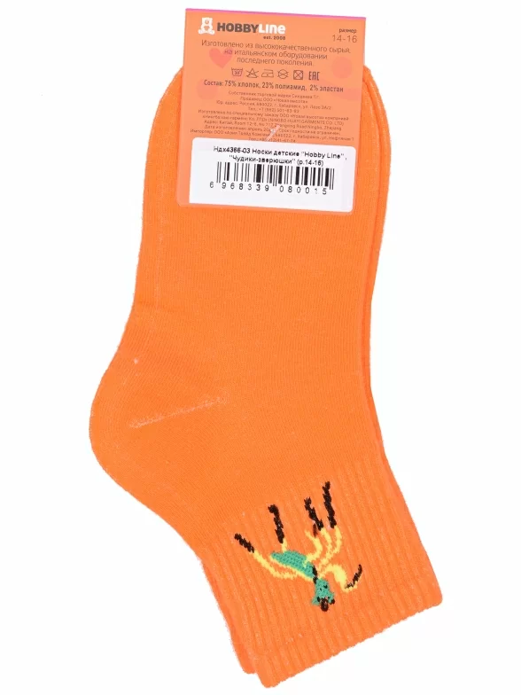 Круглогодичные укороченные детские носки, цвет оранжевый, спортивные, с вышивкой, шов обычный (не бесшовные), принт (рисунок): животные, с узором, состав: 75% хлопок, 23% полиамид, 2% эластан, арт. Ндх4366-03. Производитель «Китай, страна бренда - Россия» под брендом «Hobby line».