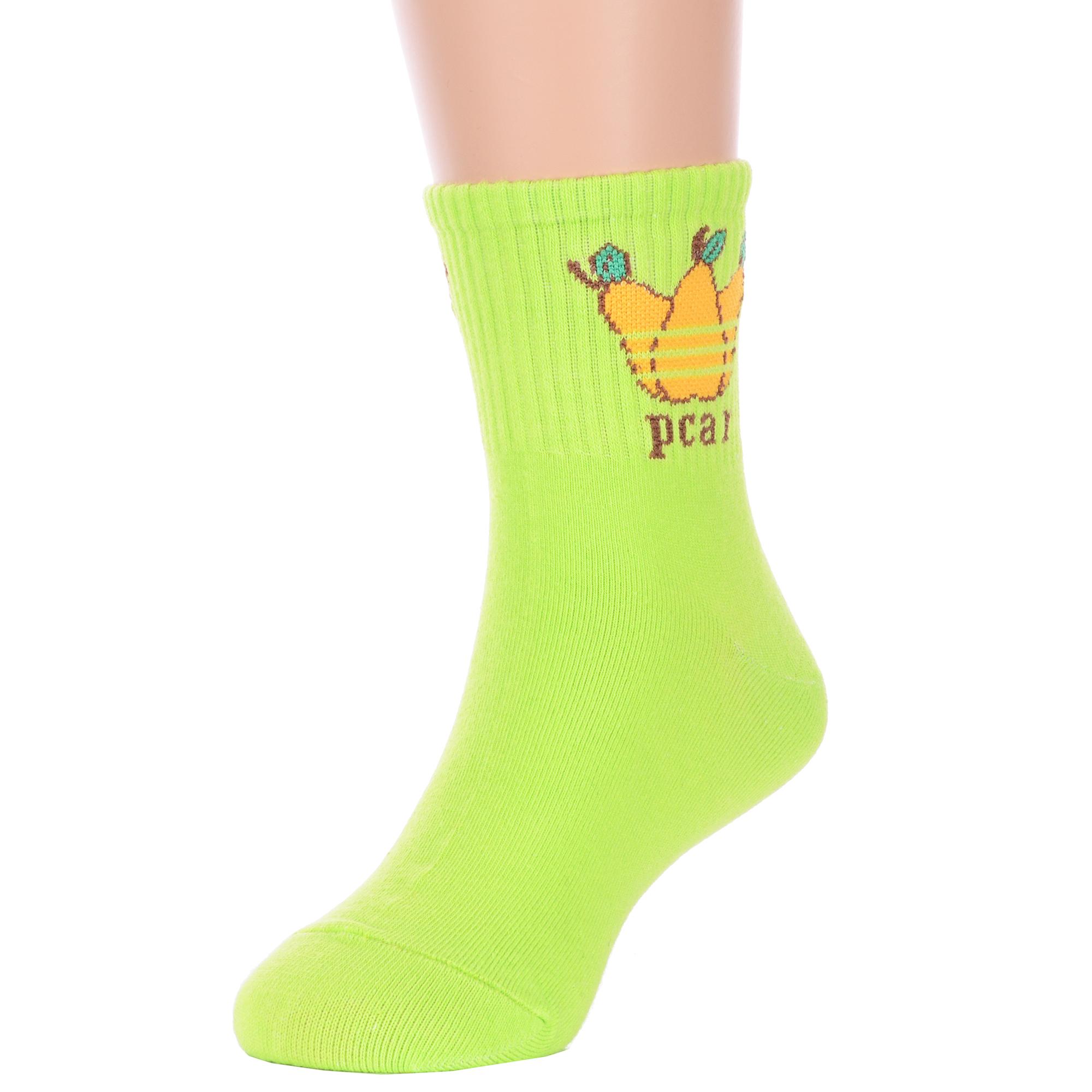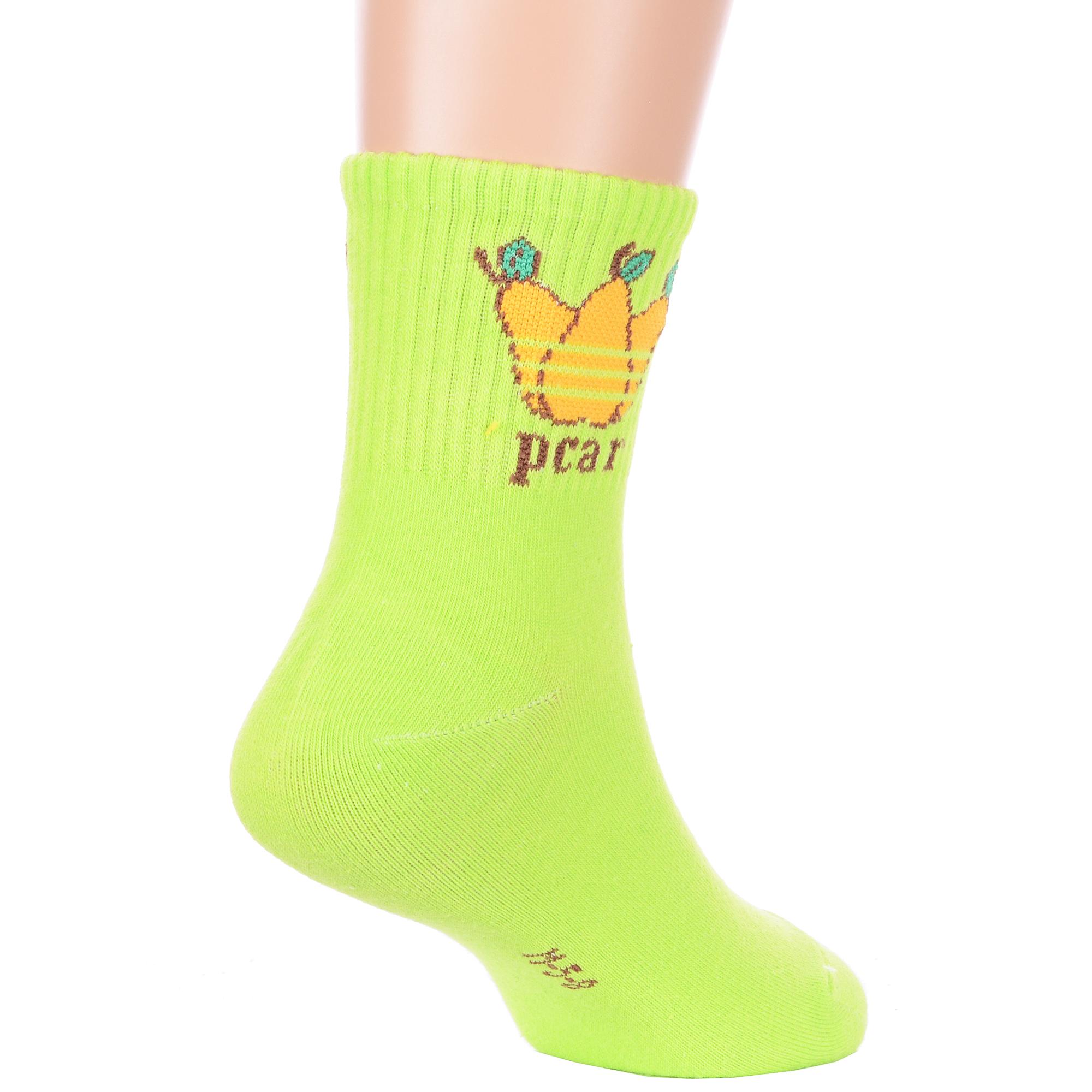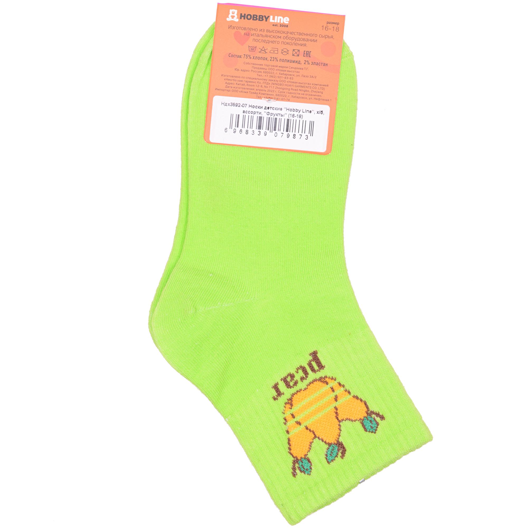 Круглогодичные укороченные детские носки, цвет салатовый, спортивные, повседневные, шов обычный (не бесшовные), принт (рисунок): овощи / фрукты / ягоды, надписи, еда и напитки, с узором, состав: 75% хлопок, 23% полиамид, 2% эластан, арт. Ндх3592-07. Производитель «Китай, страна бренда - Россия» под брендом «Hobby line».