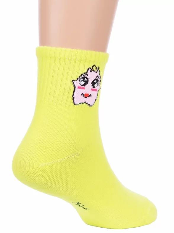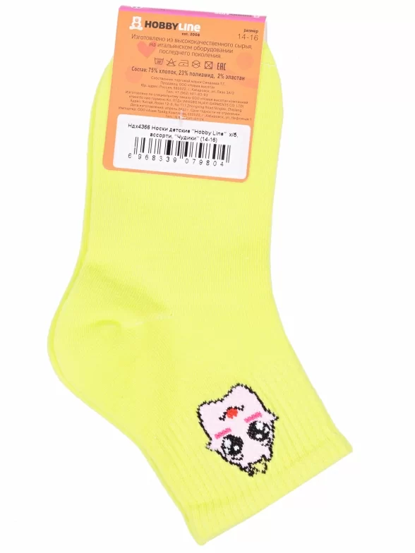 Круглогодичные укороченные детские носки, цвет салатовый, спортивные, с вышивкой, шов обычный (не бесшовные), принт (рисунок): животные, с узором, состав: 75% хлопок, 23% полиамид, 2% эластан, арт. Ндх4366. Производитель «Китай, страна бренда - Россия» под брендом «Hobby line».