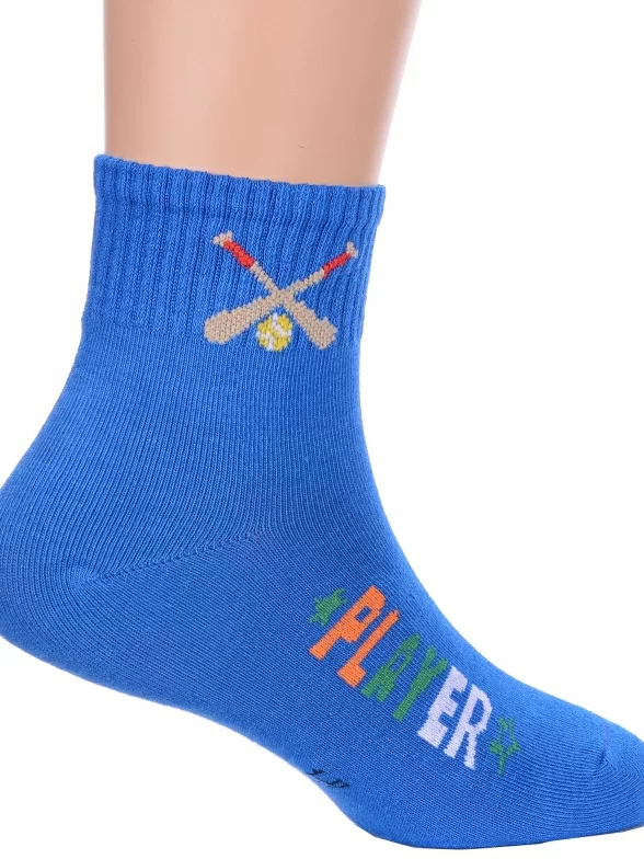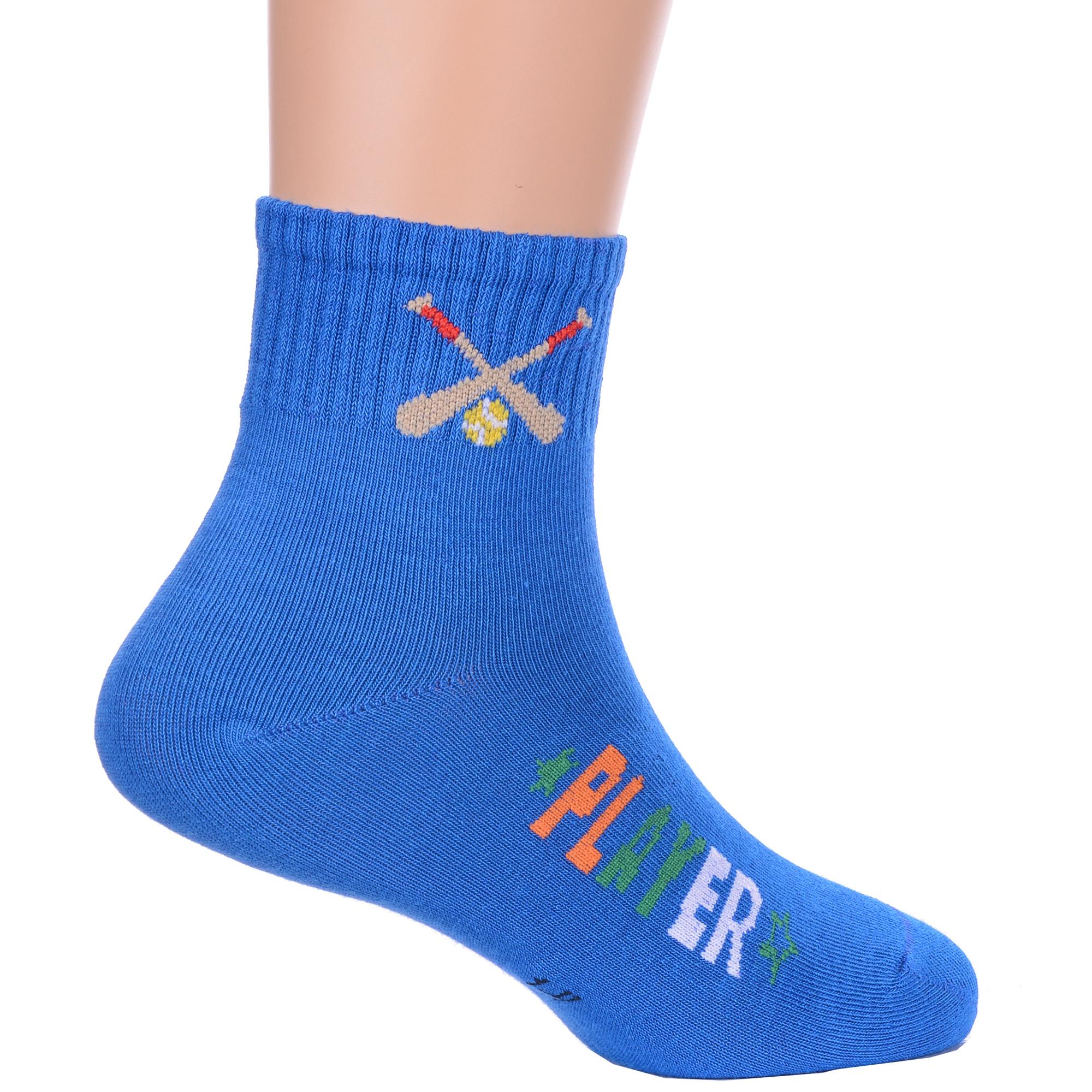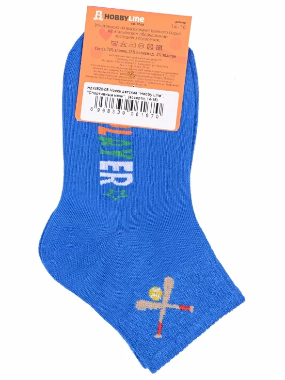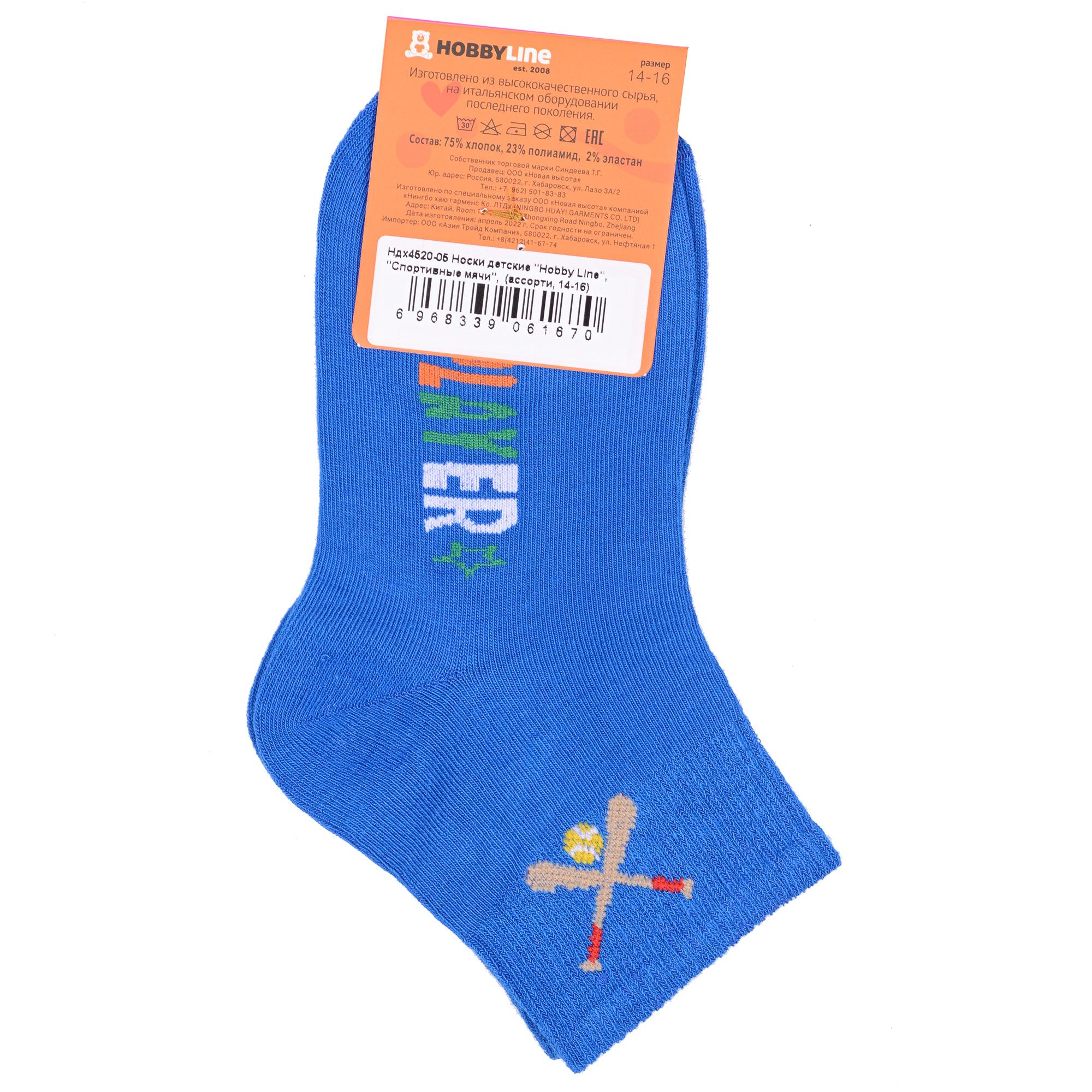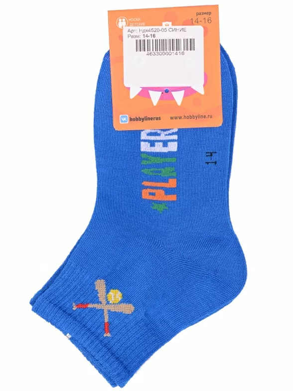 Круглогодичные укороченные детские носки, цвет синий, спортивные, повседневные, шов обычный (не бесшовные), принт (рисунок): спортивные, надписи, игры, с узором, состав: 75% хлопок, 23% полиамид, 2% эластан, арт. Ндх4520-05. Производитель «Китай, страна бренда - Россия» под брендом «Hobby line».