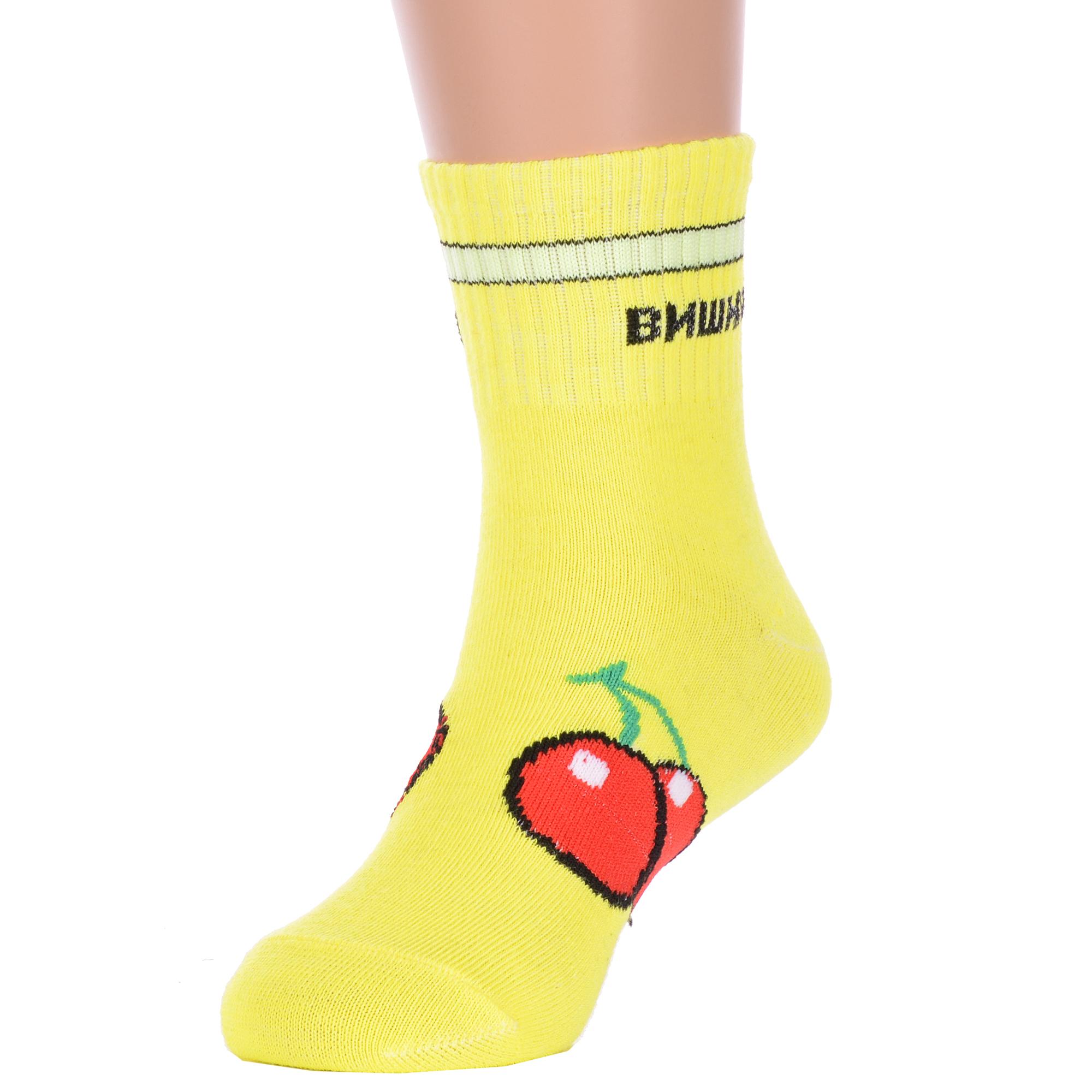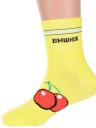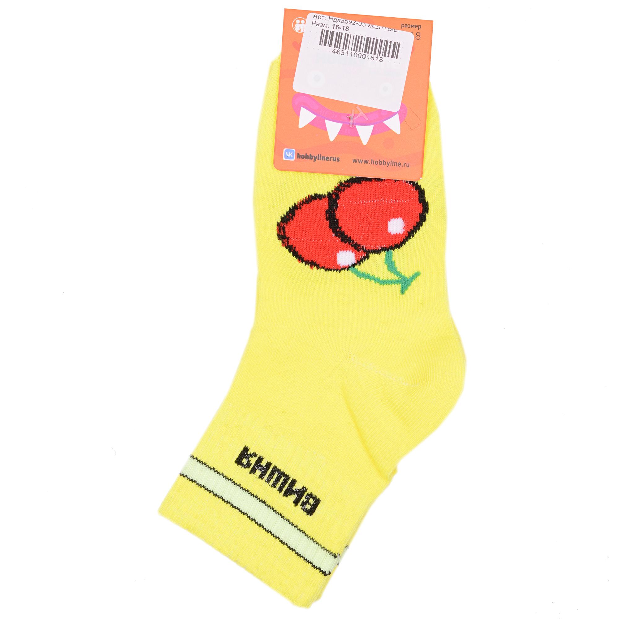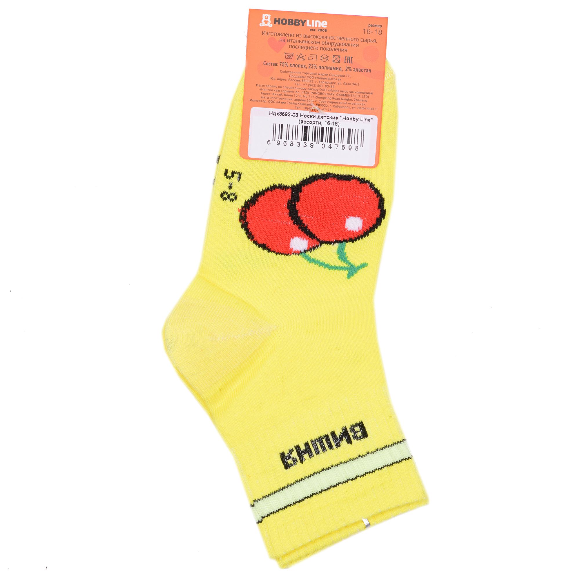 Круглогодичные укороченные детские носки, цвет желтый, спортивные, повседневные, необычные, шов обычный (не бесшовные), принт (рисунок): овощи / фрукты / ягоды, надписи, еда и напитки, с узором, состав: 75% хлопок, 23% полиамид, 2% эластан, арт. Ндх3592-03. Производитель «Китай, страна бренда - Россия» под брендом «Hobby line».