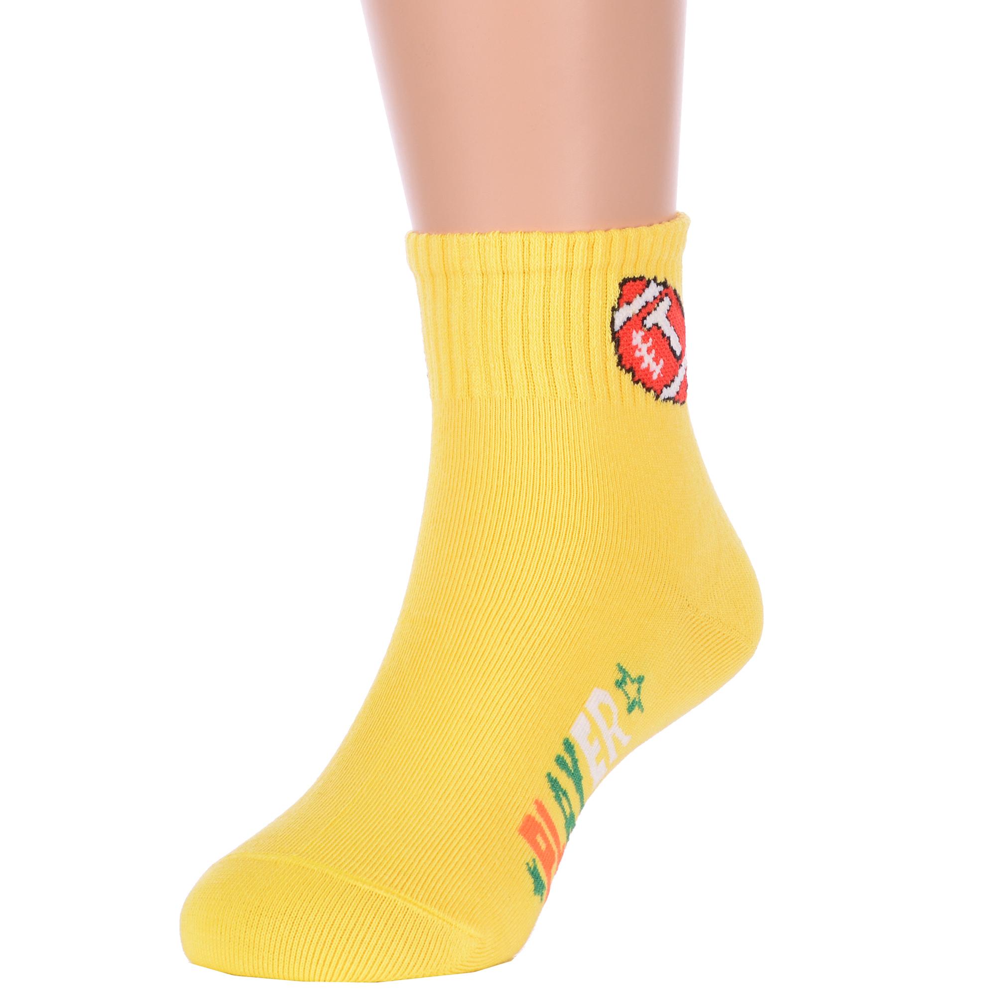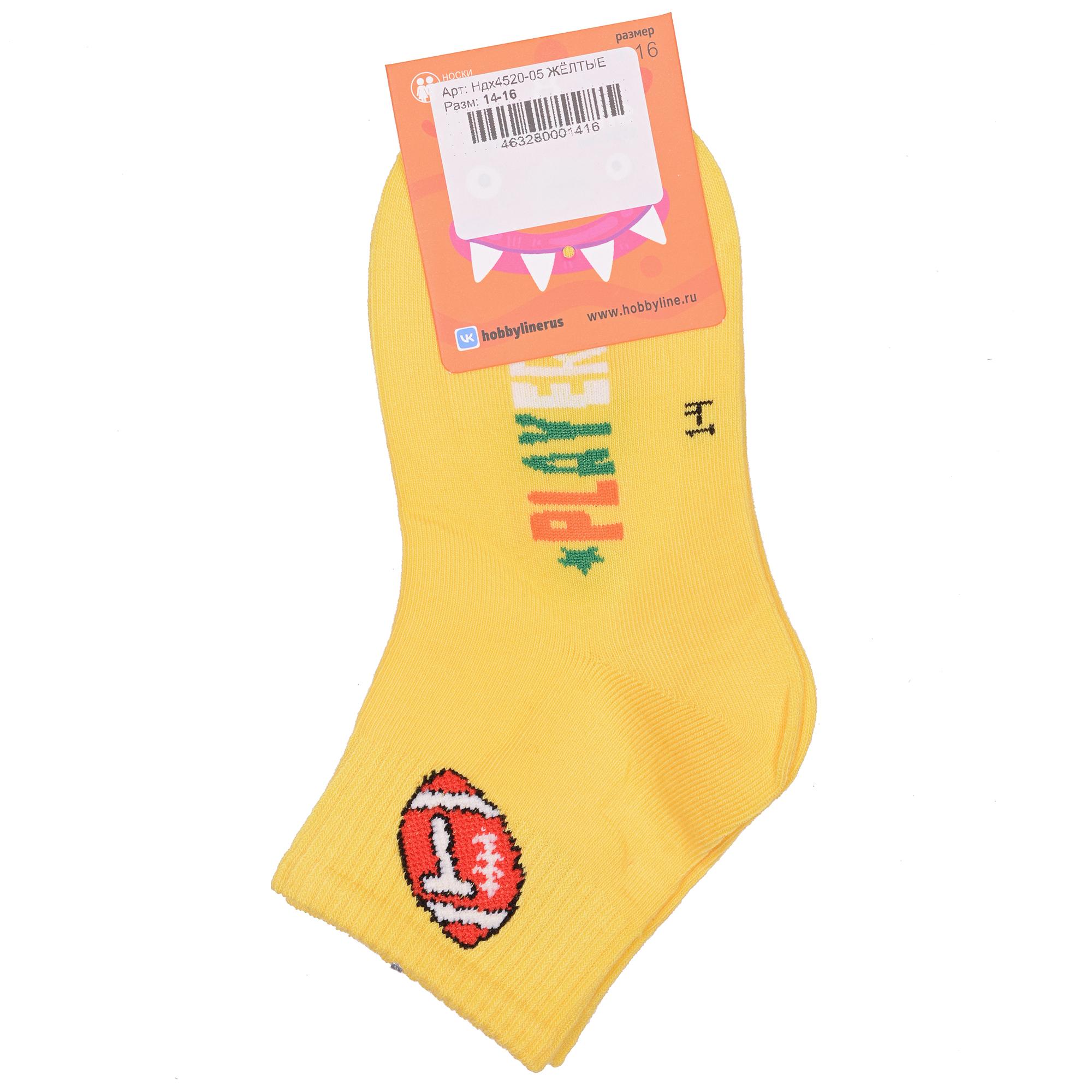 Круглогодичные укороченные детские носки, цвет желтый, спортивные, повседневные, шов обычный (не бесшовные), принт (рисунок): спортивные, надписи, игры, с узором, состав: 75% хлопок, 23% полиамид, 2% эластан, арт. Ндх4520-05. Производитель «Китай, страна бренда - Россия» под брендом «Hobby line».