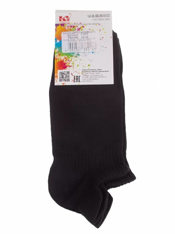 Круглогодичные короткие детские носки, цвет черный, спортивные, состав: 73% хлопок, 21% полиамид, 6% эластан, фабричный артикул С-533. Производитель «КРАСНАЯ ВЕТКА» Россия под брендом «Красная ветка».