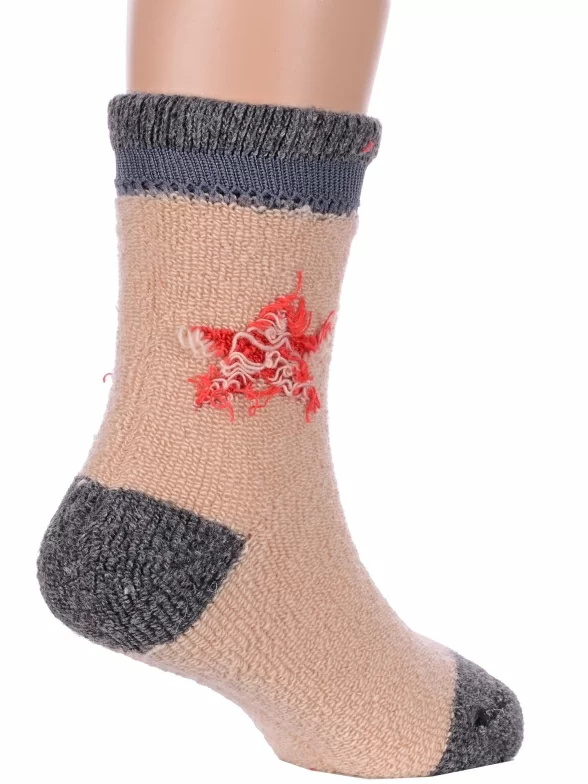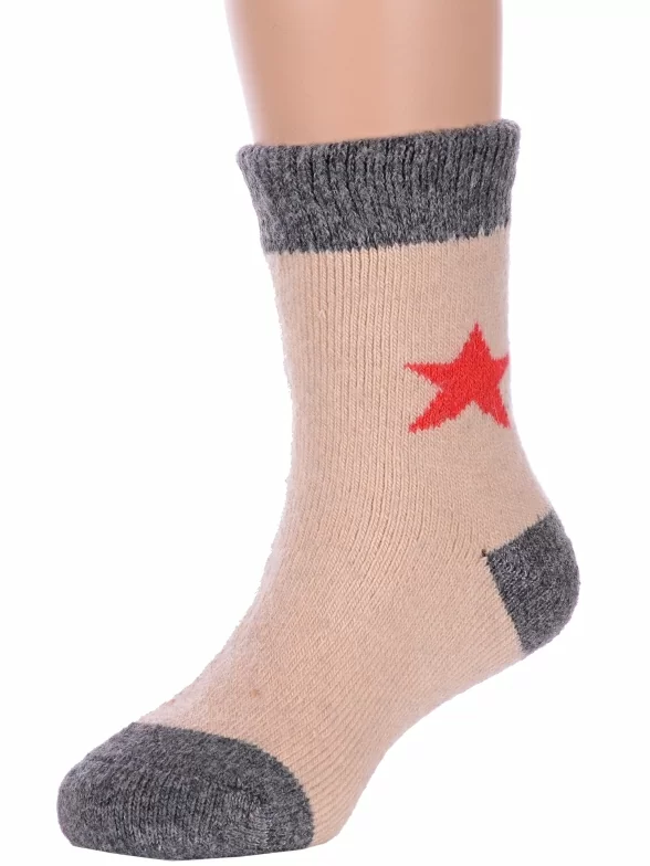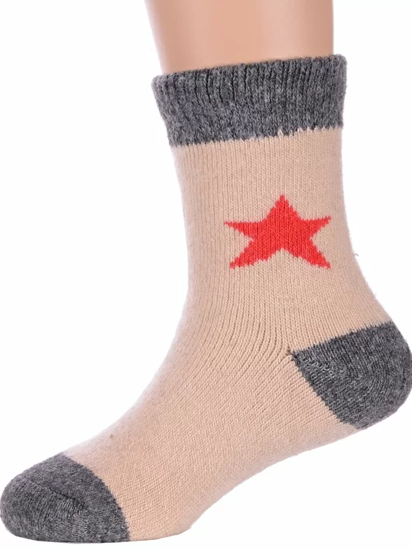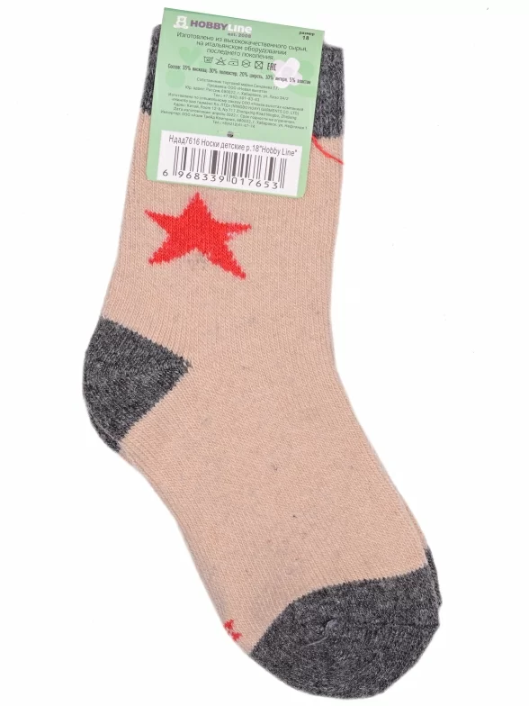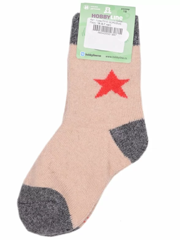 Зимние укороченные детские носки, цвет бежевый, теплые, повседневные, махровые, шов обычный (не бесшовные), принт (рисунок): контрастные пятка / мысок / резинка, звезды / небо, с узором, состав: 35% вискоза, 20% шерсть, 10% ангора, 30% полиэстер, 5% эластан, арт. Ндад7616. Производитель «Китай, страна бренда - Россия» под брендом «Hobby line».