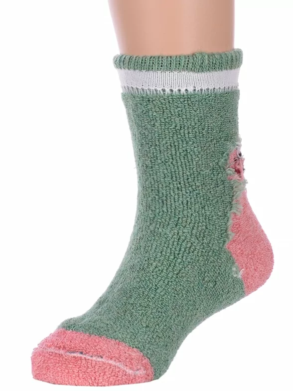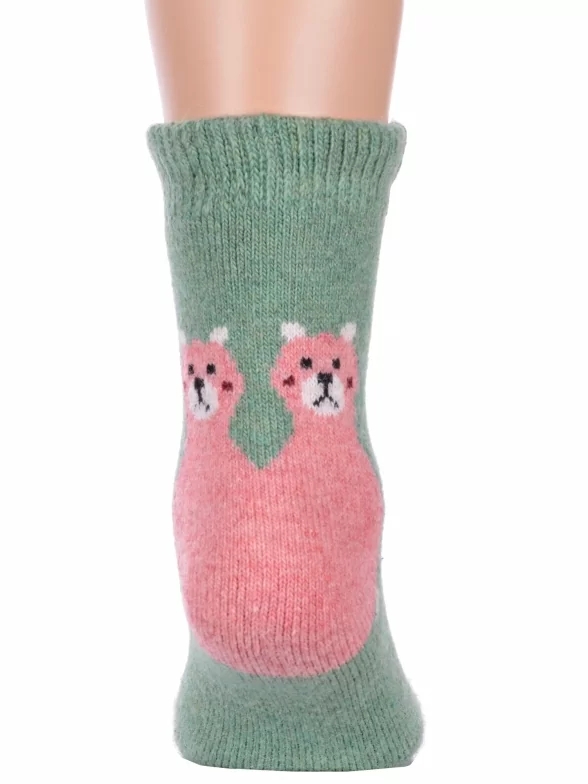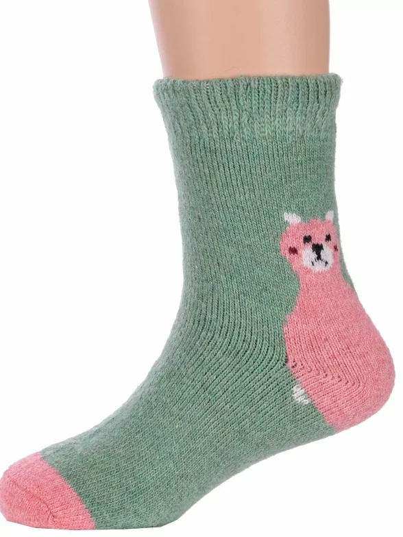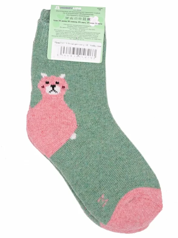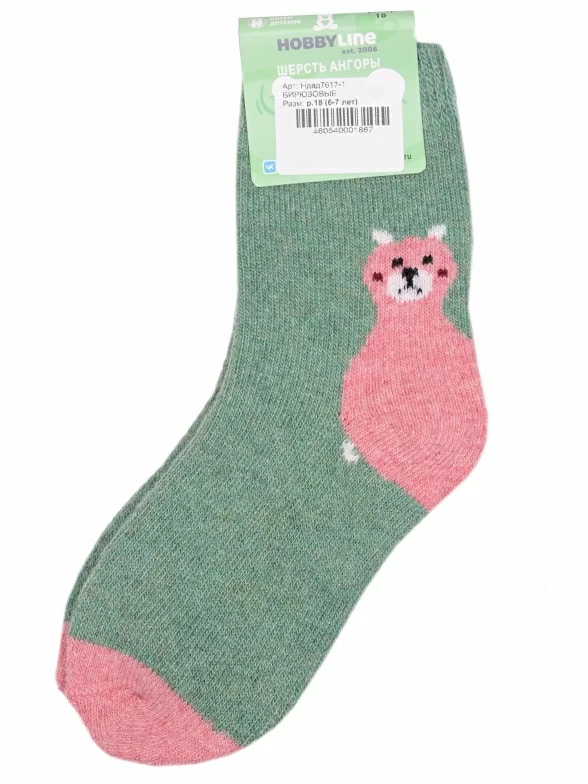 Зимние укороченные детские носки, цвет бирюзовый, теплые, повседневные, махровые, шов обычный (не бесшовные), принт (рисунок): контрастные пятка / мысок / резинка, животные, с узором, состав: 35% вискоза, 20% шерсть, 10% ангора, 30% полиэстер, 5% эластан, арт. Ндад7617-1. Производитель «Китай, страна бренда - Россия» под брендом «Hobby line».