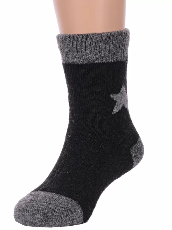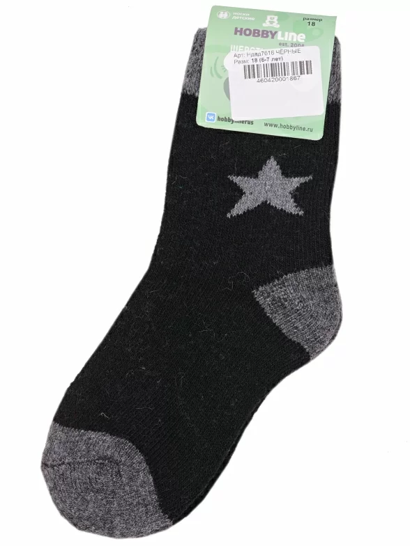 Зимние укороченные детские носки, цвет черный, теплые, повседневные, махровые, шов обычный (не бесшовные), принт (рисунок): контрастные пятка / мысок / резинка, звезды / небо, с узором, состав: 35% вискоза, 20% шерсть, 10% ангора, 30% полиэстер, 5% эластан, арт. Ндад7616. Производитель «Китай, страна бренда - Россия» под брендом «Hobby line».
