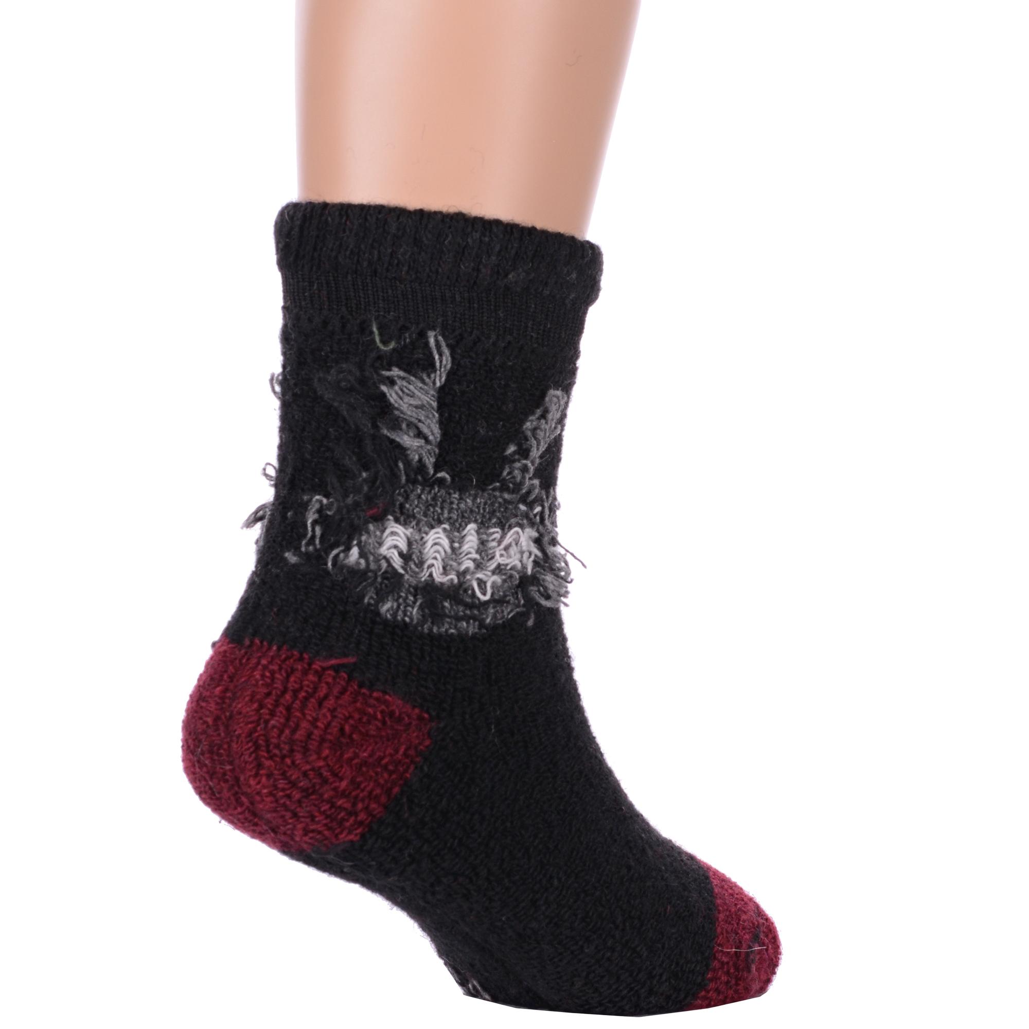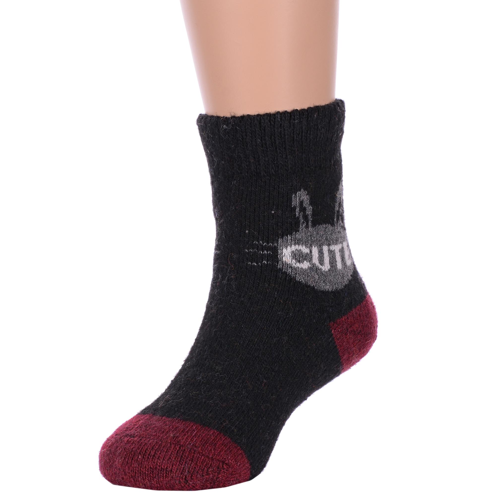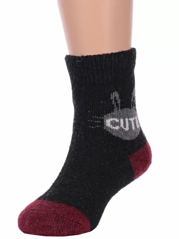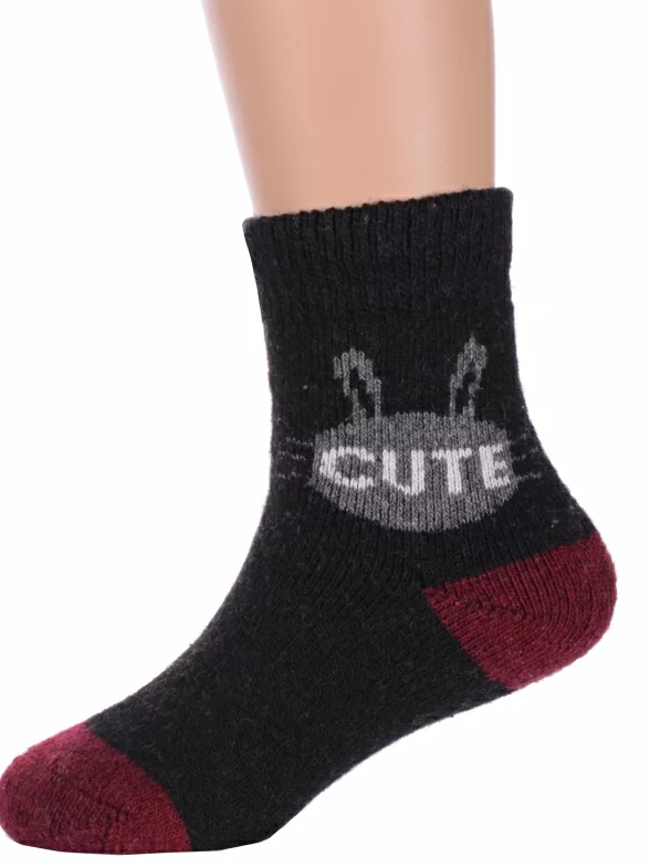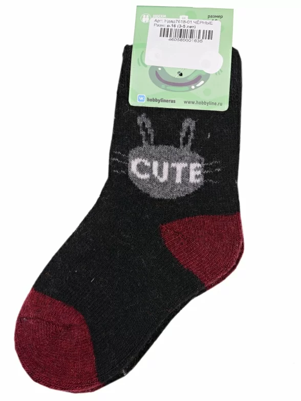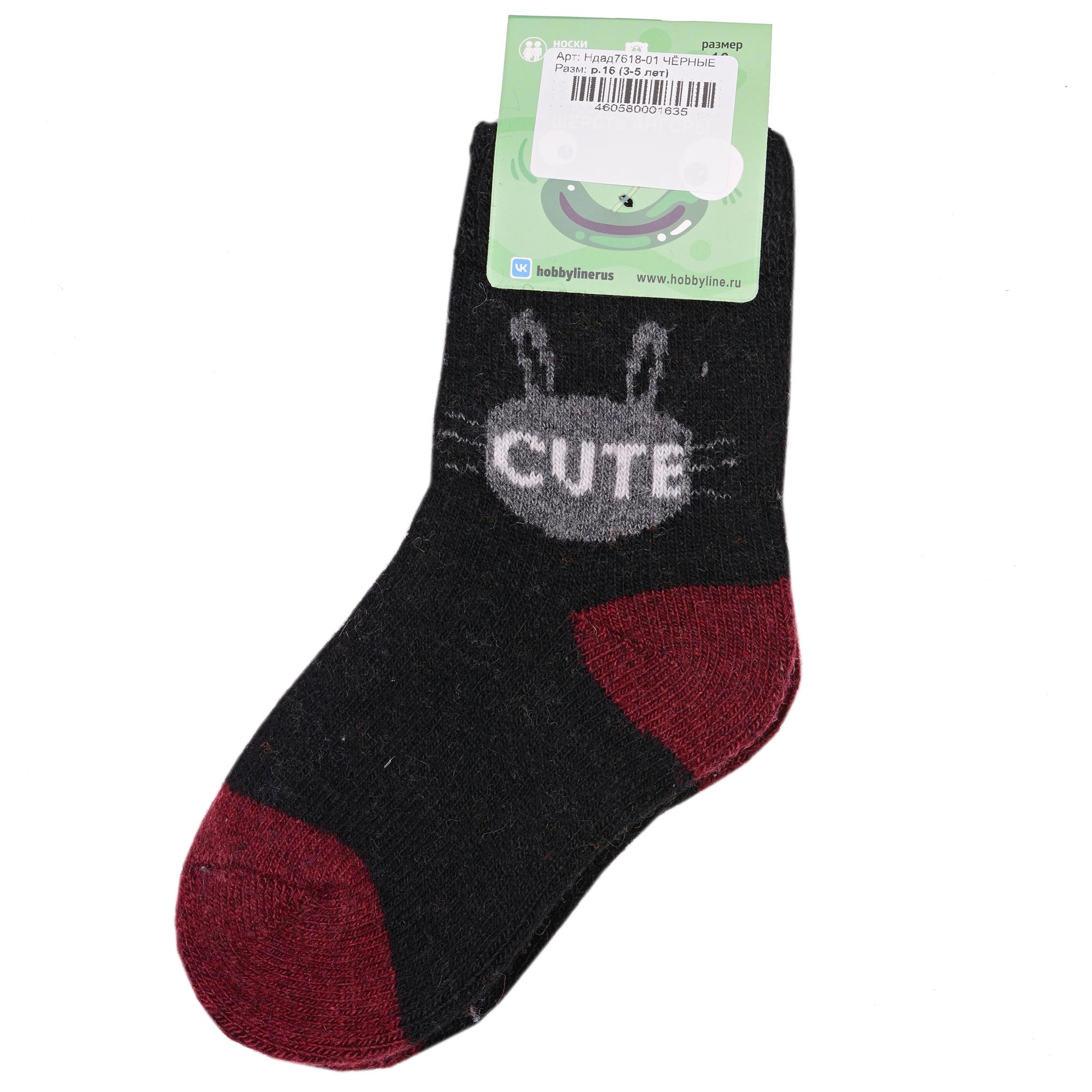 Зимние укороченные детские носки, цвет черный, теплые, повседневные, махровые, шов обычный (не бесшовные), принт (рисунок): надписи, контрастные пятка / мысок / резинка, животные, с узором, состав: 35% вискоза, 20% шерсть, 10% ангора, 30% полиэстер, 5% эластан, арт. Ндад7618-01. Производитель «Китай, страна бренда - Россия» под брендом «Hobby line».