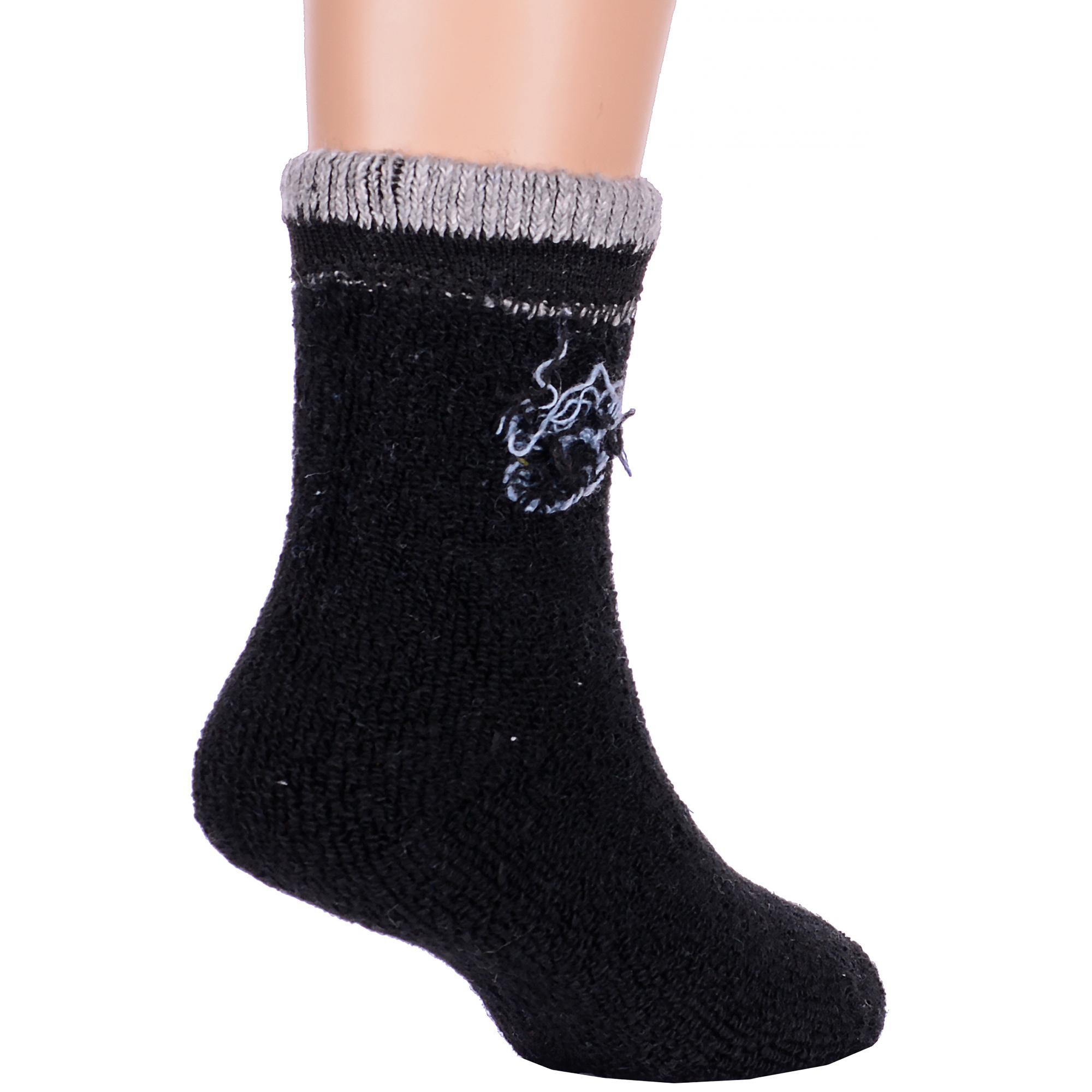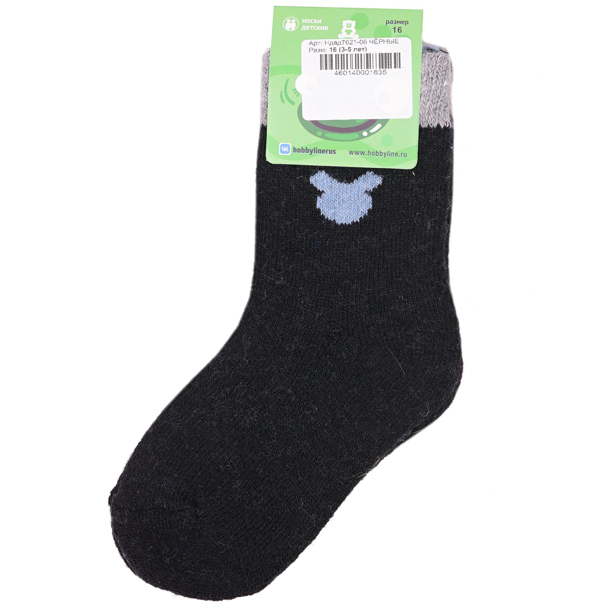 Зимние укороченные детские носки, цвет черный, теплые, повседневные, махровые, шов обычный (не бесшовные), принт (рисунок): контрастные пятка / мысок / резинка, животные, с узором, состав: 35% вискоза, 20% шерсть, 10% ангора, 30% полиэстер, 5% эластан, арт. Ндад7621-06. Производитель «Китай, страна бренда - Россия» под брендом «Hobby line».