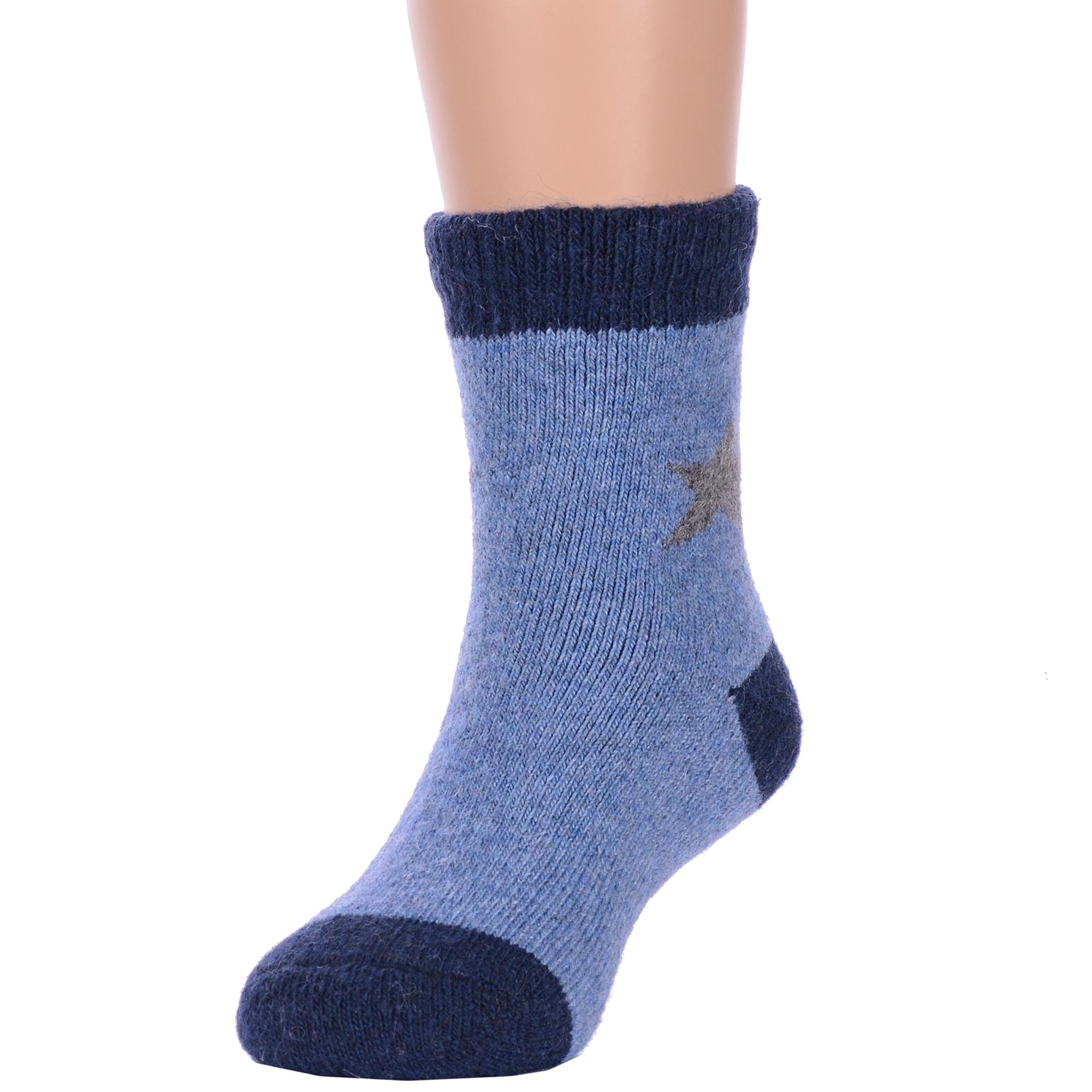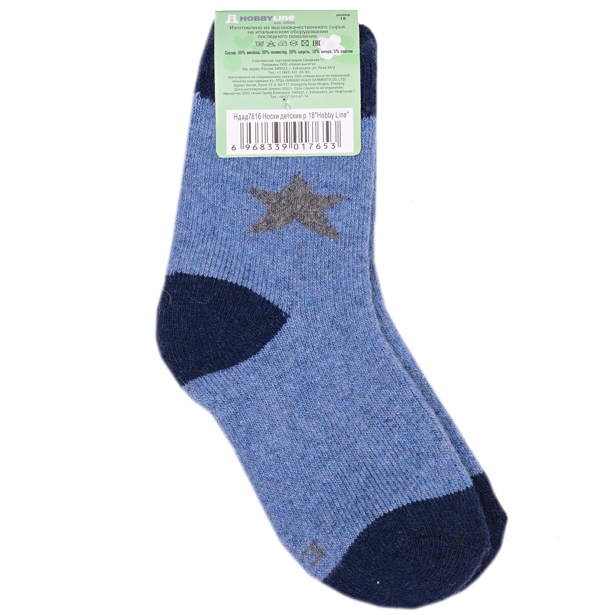 Зимние укороченные детские носки, цвет джинс, теплые, повседневные, махровые, шов обычный (не бесшовные), принт (рисунок): контрастные пятка / мысок / резинка, звезды / небо, с узором, состав: 35% вискоза, 20% шерсть, 10% ангора, 30% полиэстер, 5% эластан, арт. Ндад7616. Производитель «Китай, страна бренда - Россия» под брендом «Hobby line».