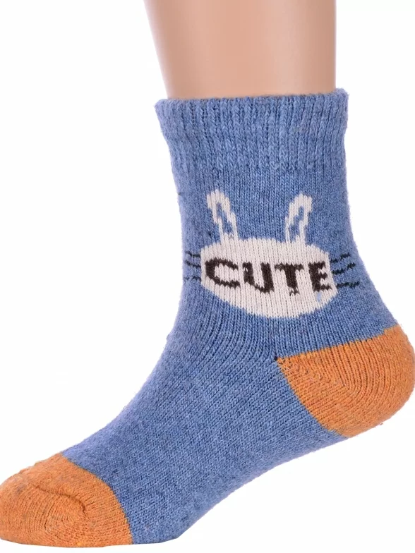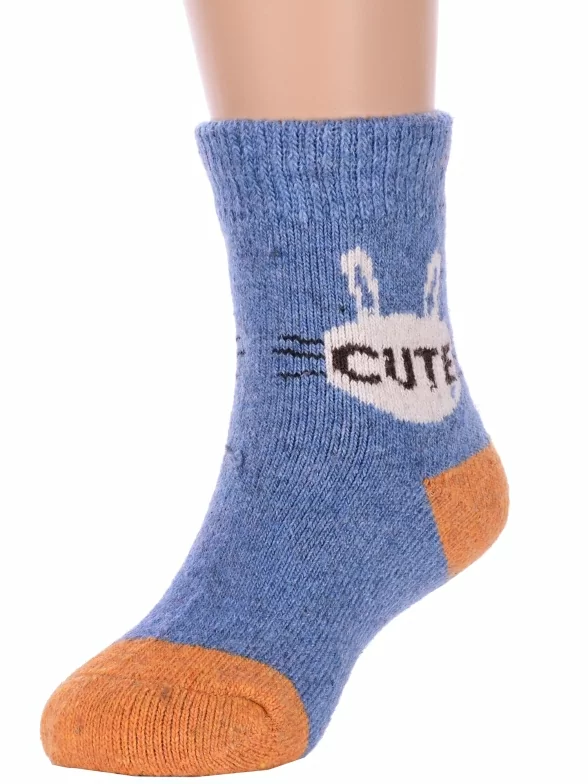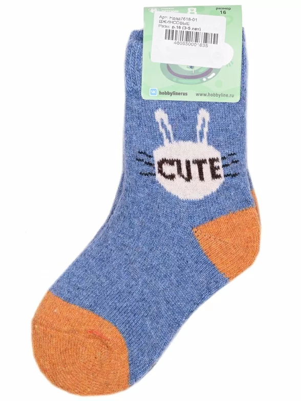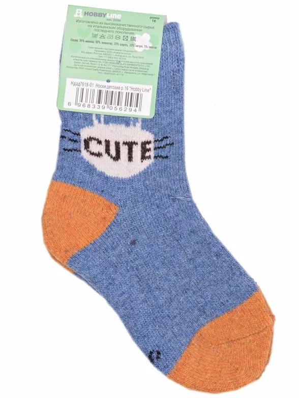 Зимние укороченные детские носки, цвет джинс, теплые, повседневные, махровые, шов обычный (не бесшовные), принт (рисунок): надписи, контрастные пятка / мысок / резинка, животные, с узором, состав: 35% вискоза, 20% шерсть, 10% ангора, 30% полиэстер, 5% эластан, арт. Ндад7618-01. Производитель «Китай, страна бренда - Россия» под брендом «Hobby line».