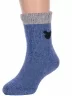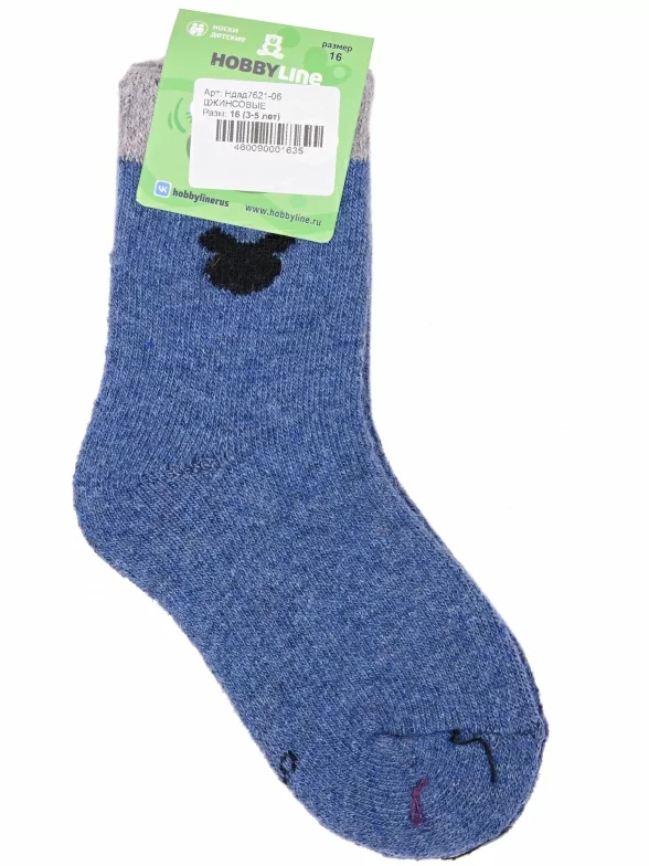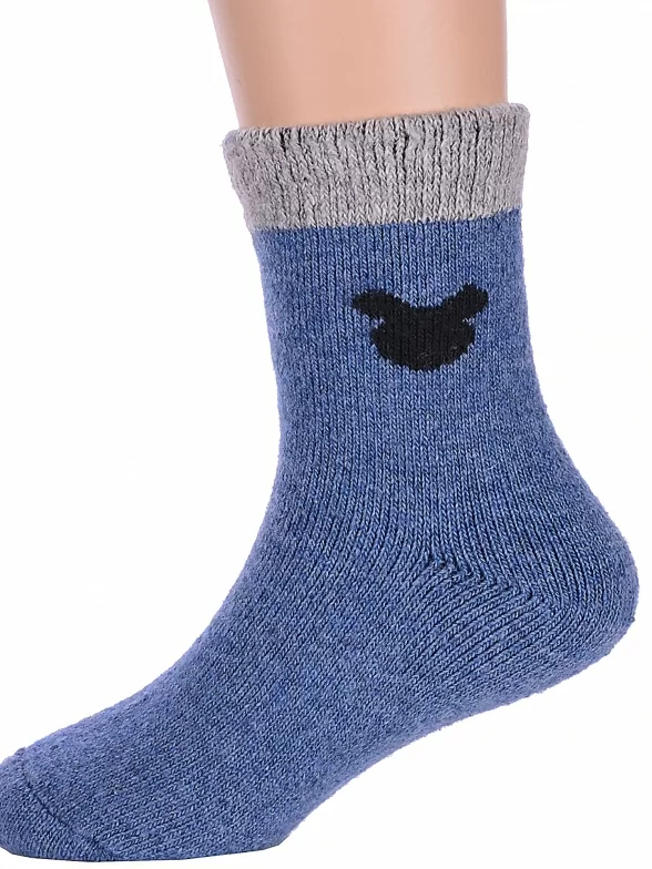 Зимние укороченные детские носки, цвет джинс, теплые, повседневные, махровые, шов обычный (не бесшовные), принт (рисунок): контрастные пятка / мысок / резинка, животные, с узором, состав: 35% вискоза, 20% шерсть, 10% ангора, 30% полиэстер, 5% эластан, арт. Ндад7621-06. Производитель «Китай, страна бренда - Россия» под брендом «Hobby line».