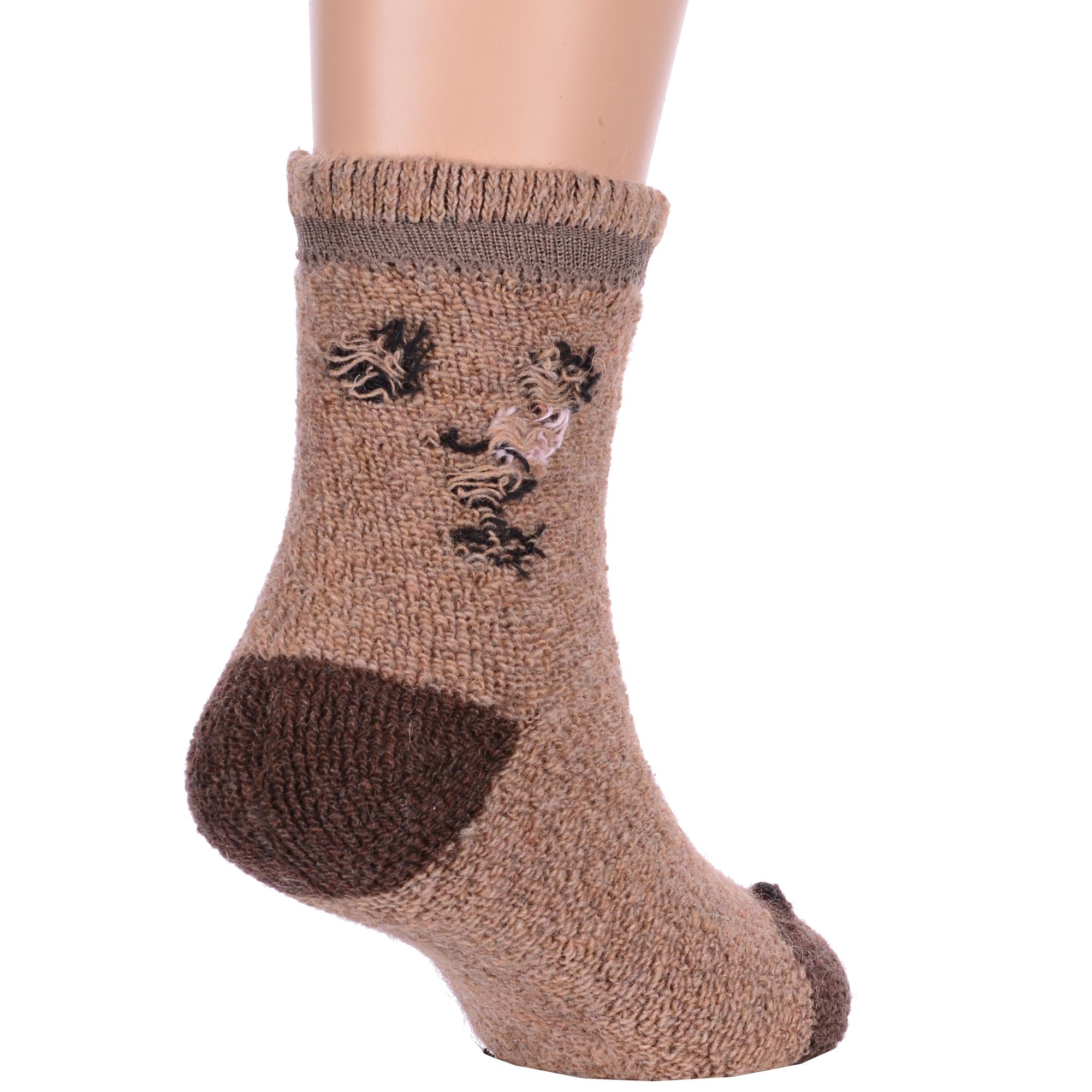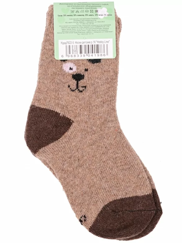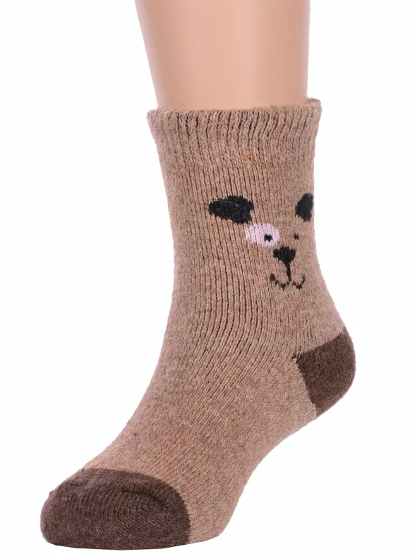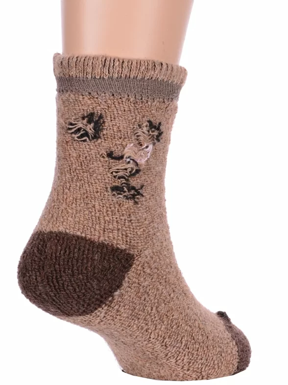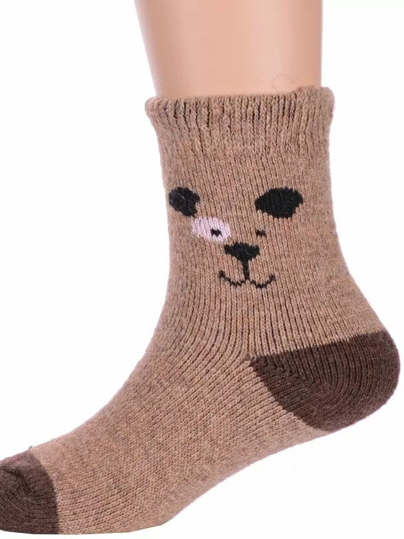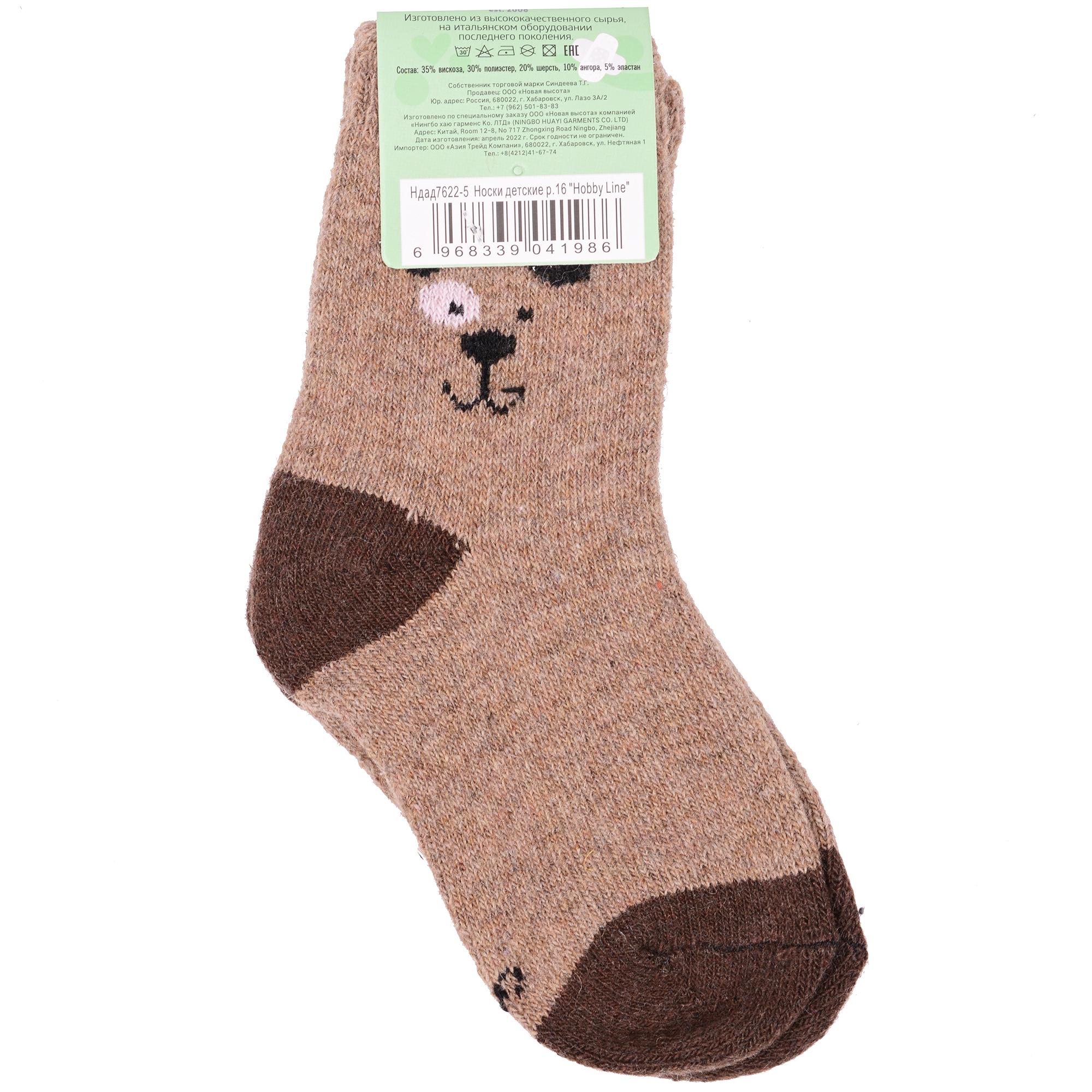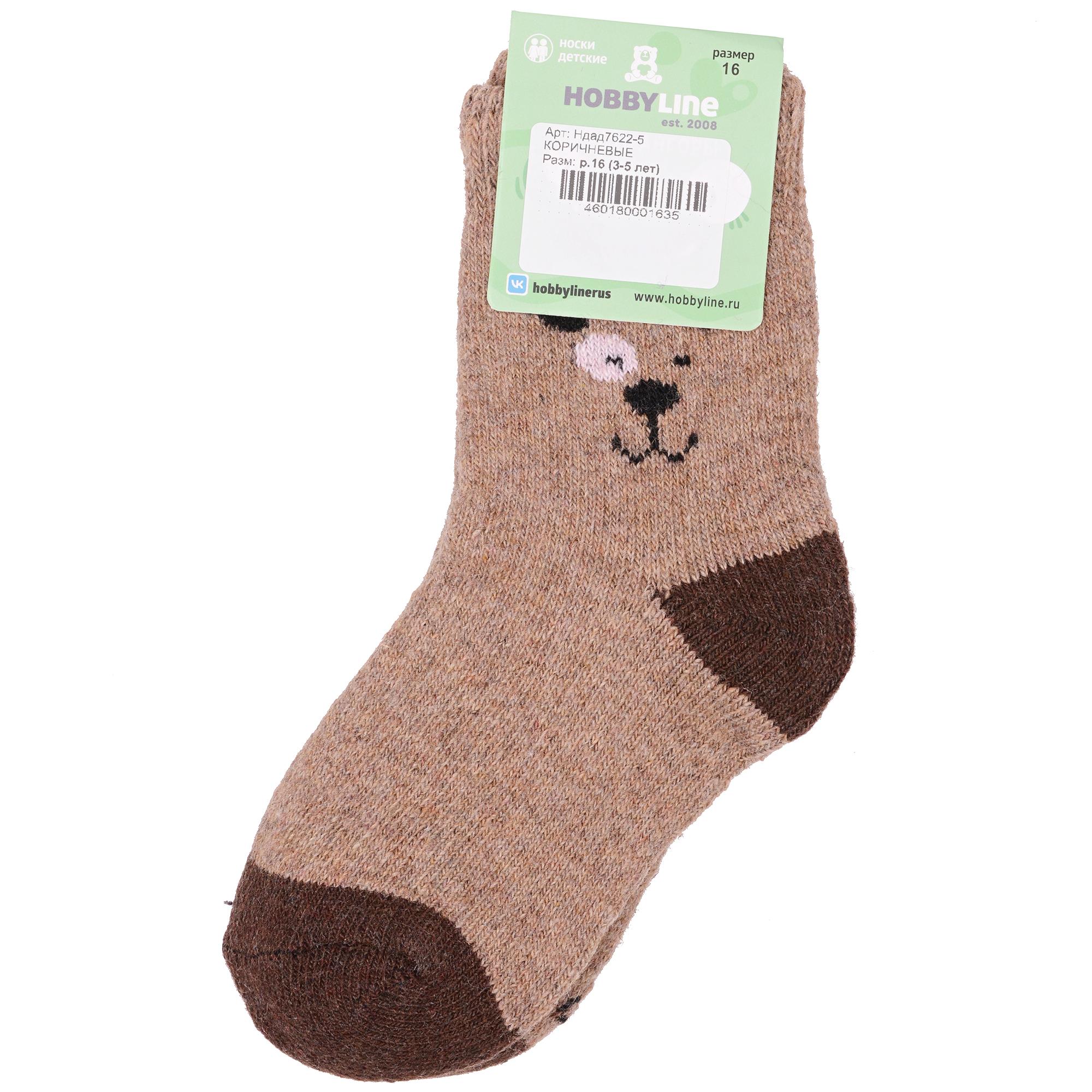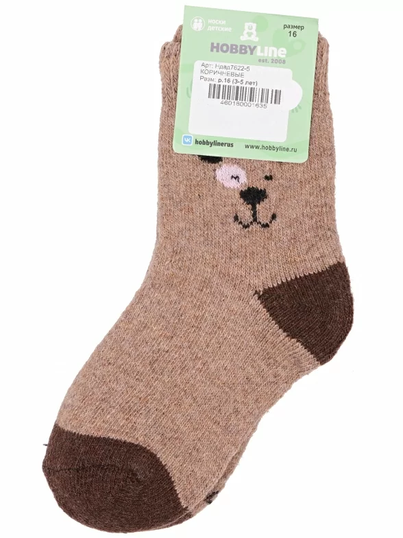 Зимние укороченные детские носки, цвет коричневый, теплые, повседневные, махровые, шов обычный (не бесшовные), принт (рисунок): контрастные пятка / мысок / резинка, животные, с узором, состав: 35% вискоза, 20% шерсть, 10% ангора, 30% полиэстер, 5% эластан, арт. Ндад7622-5. Производитель «Китай, страна бренда - Россия» под брендом «Hobby line».