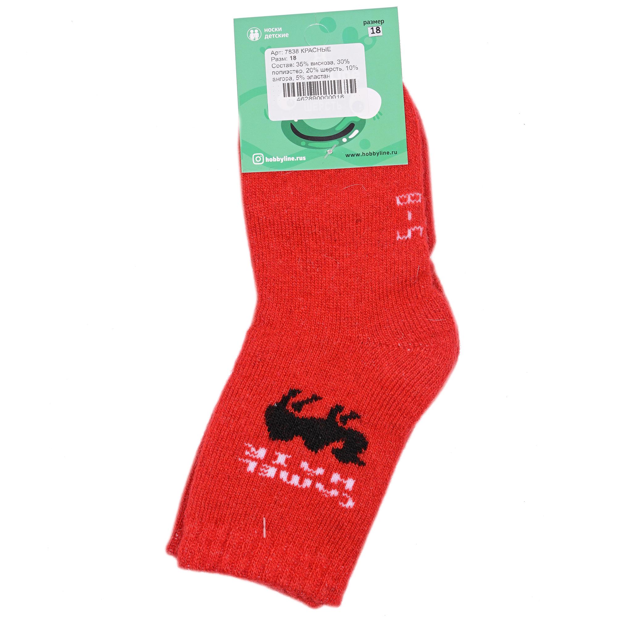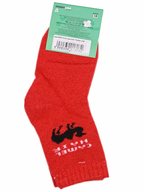 Зимние укороченные детские носки, цвет красный, теплые, махровые, шов обычный (не бесшовные), принт (рисунок): надписи, животные, с узором, состав: 35% вискоза, 20% шерсть, 10% ангора, 30% полиэстер, 5% эластан, арт. 7838. Производитель «Китай, страна бренда - Россия» под брендом «Hobby line».