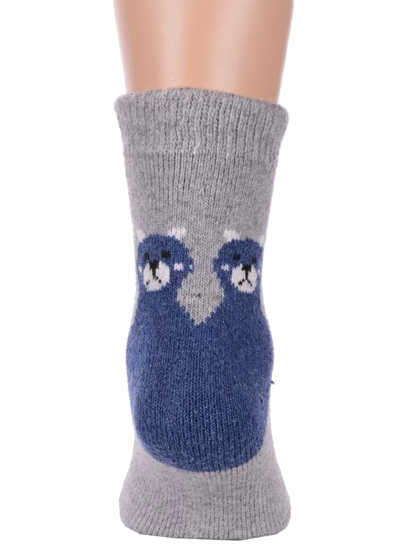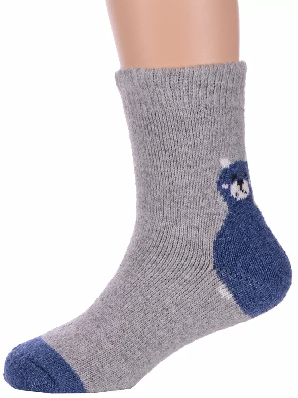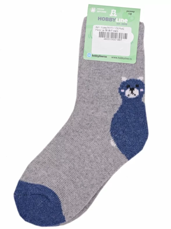 Зимние укороченные детские носки, цвет серый, теплые, повседневные, махровые, шов обычный (не бесшовные), принт (рисунок): контрастные пятка / мысок / резинка, животные, с узором, состав: 35% вискоза, 20% шерсть, 10% ангора, 30% полиэстер, 5% эластан, арт. Ндад7617-1. Производитель «Китай, страна бренда - Россия» под брендом «Hobby line».