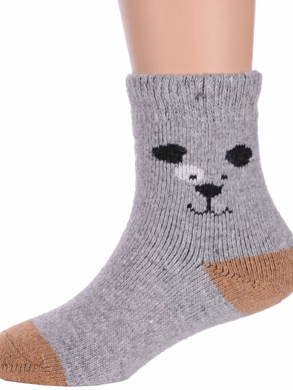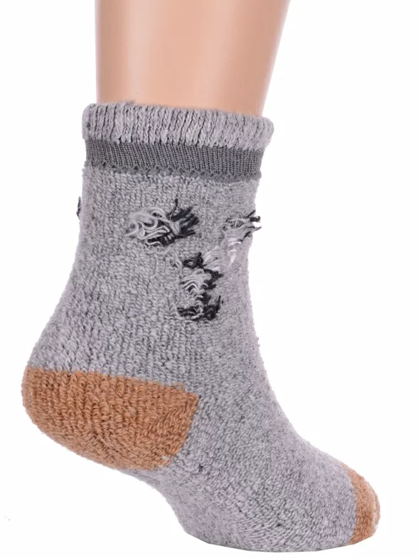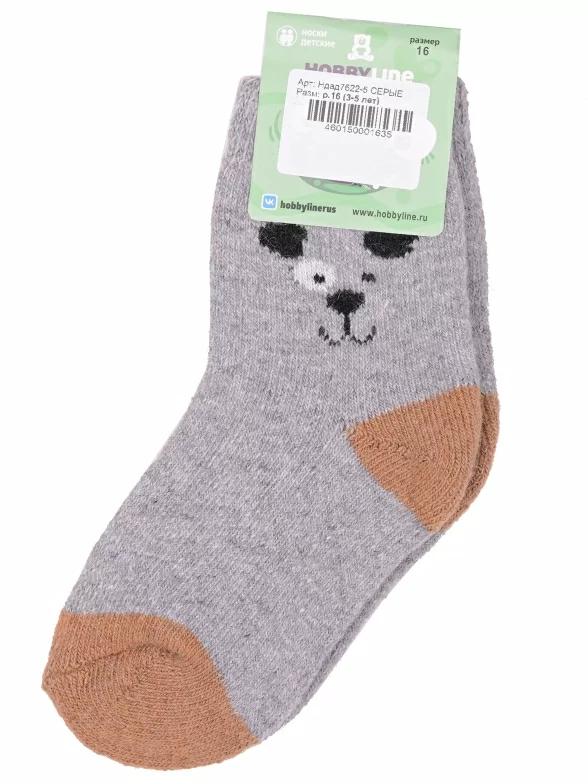 Зимние укороченные детские носки, цвет серый, теплые, повседневные, махровые, шов обычный (не бесшовные), принт (рисунок): контрастные пятка / мысок / резинка, животные, с узором, состав: 35% вискоза, 20% шерсть, 10% ангора, 30% полиэстер, 5% эластан, арт. Ндад7622-5. Производитель «Китай, страна бренда - Россия» под брендом «Hobby line».