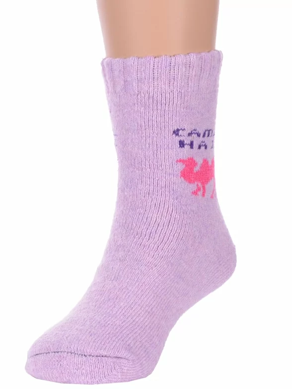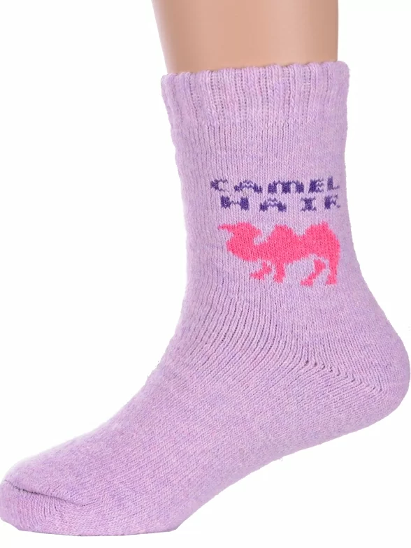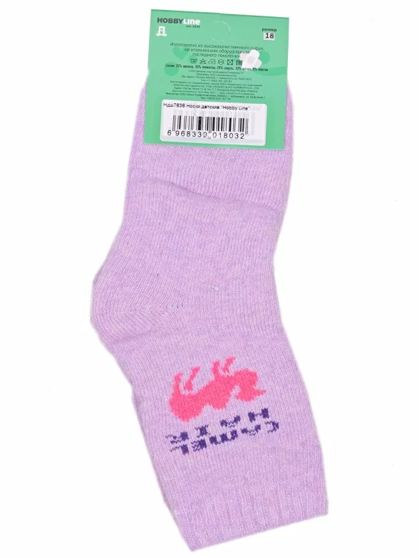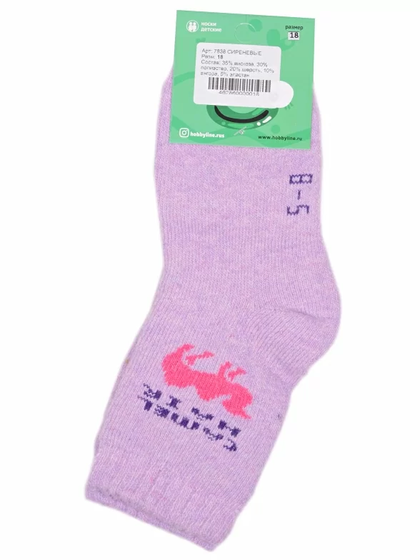 Зимние укороченные детские носки, цвет сиреневый, теплые, махровые, шов обычный (не бесшовные), принт (рисунок): с узором, животные, надписи, состав: 35% вискоза, 20% шерсть, 10% ангора, 30% полиэстер, 5% эластан, арт. 7838. Производитель «Китай, страна бренда - Россия» под брендом «Hobby line».