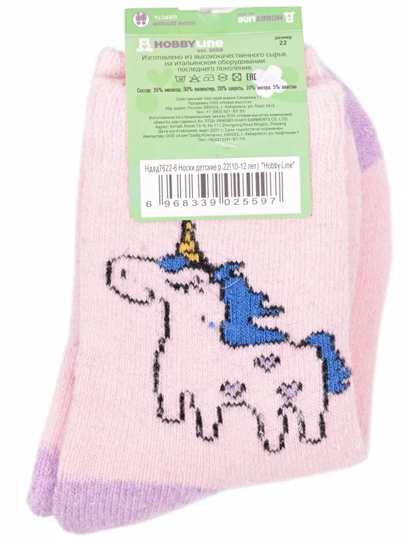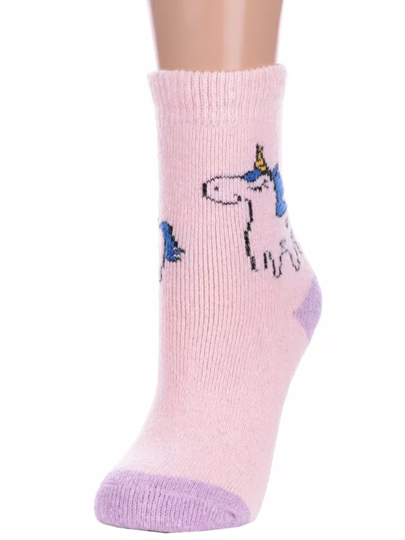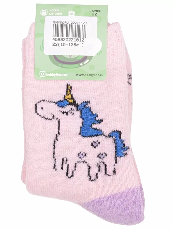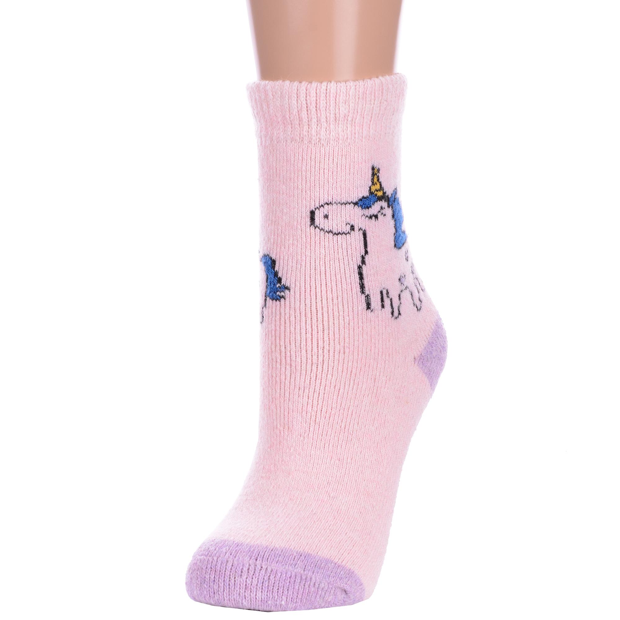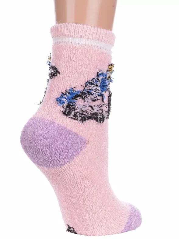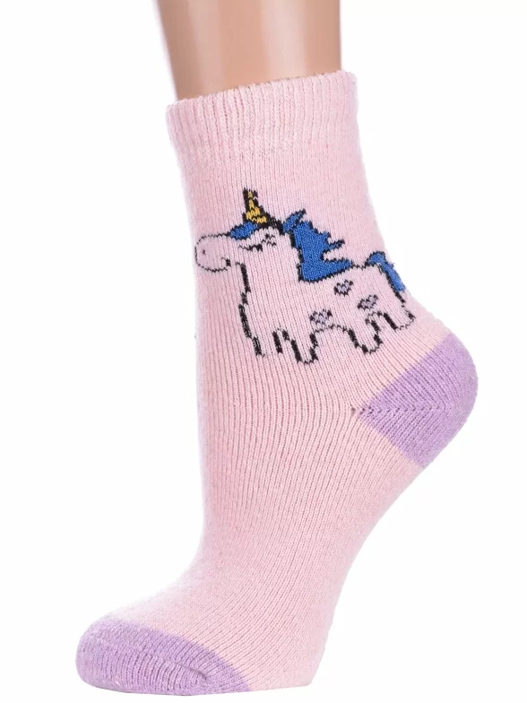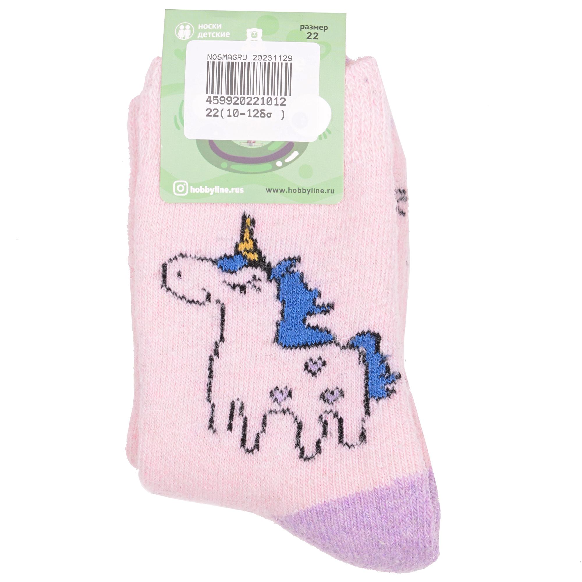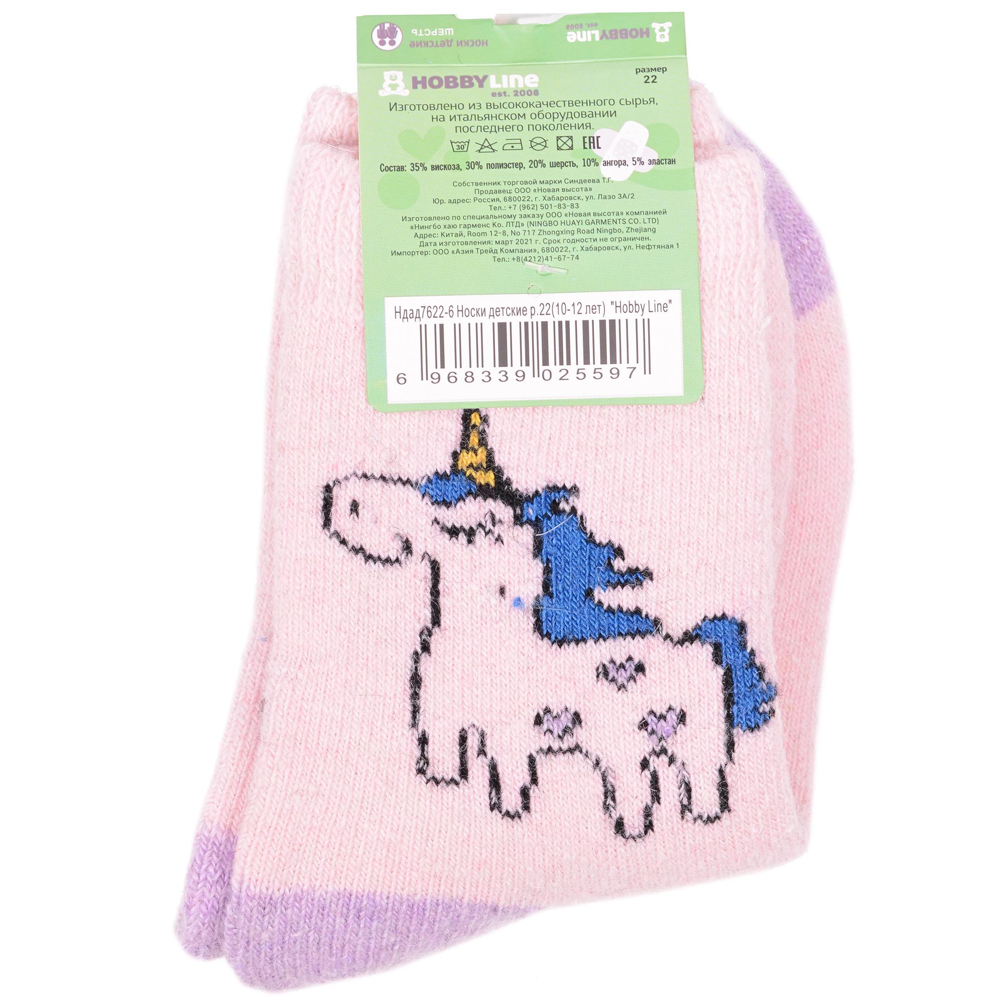 Зимние укороченные детские носки, цвет сиреневый-розовый, теплые, повседневные, махровые, шов обычный (не бесшовные), принт (рисунок): контрастные пятка / мысок / резинка, животные, с узором, состав: 35% вискоза, 20% шерсть, 10% ангора, 30% полиэстер, 5% эластан, арт. Ндад7622-6. Производитель «Китай, страна бренда - Россия» под брендом «Hobby line».