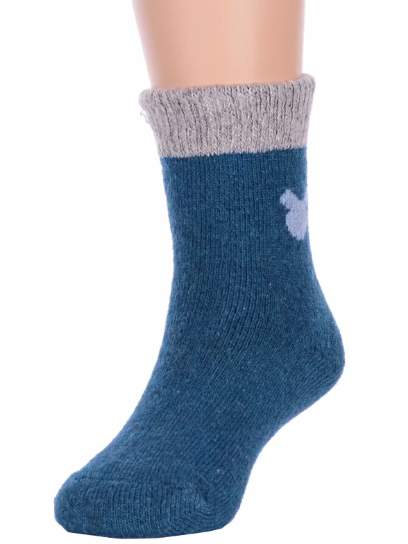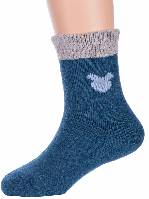 Зимние укороченные детские носки, цвет темно-синий, теплые, повседневные, махровые, шов обычный (не бесшовные), принт (рисунок): контрастные пятка / мысок / резинка, животные, с узором, состав: 35% вискоза, 20% шерсть, 10% ангора, 30% полиэстер, 5% эластан, арт. Ндад7621-06. Производитель «Китай, страна бренда - Россия» под брендом «Hobby line».