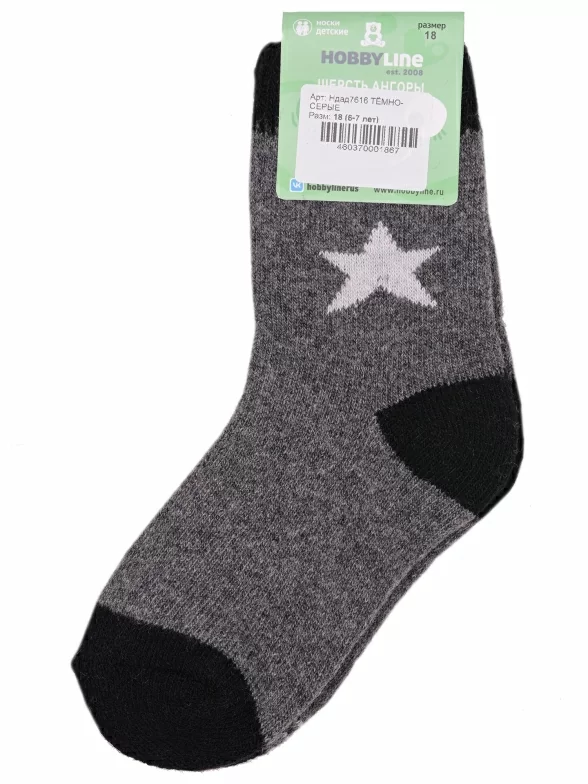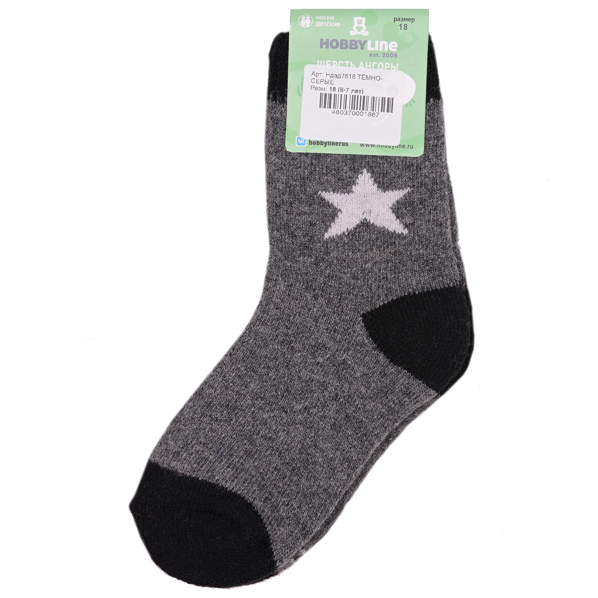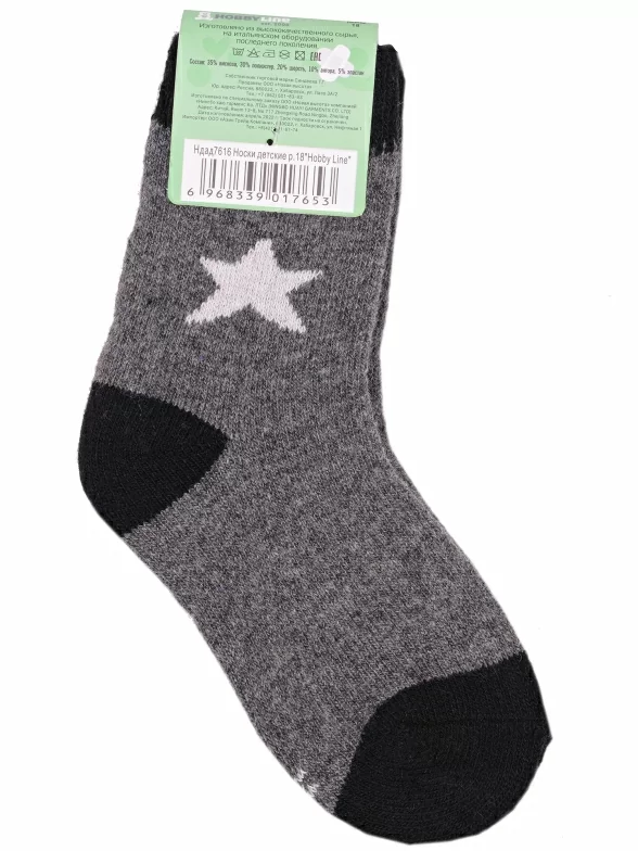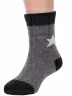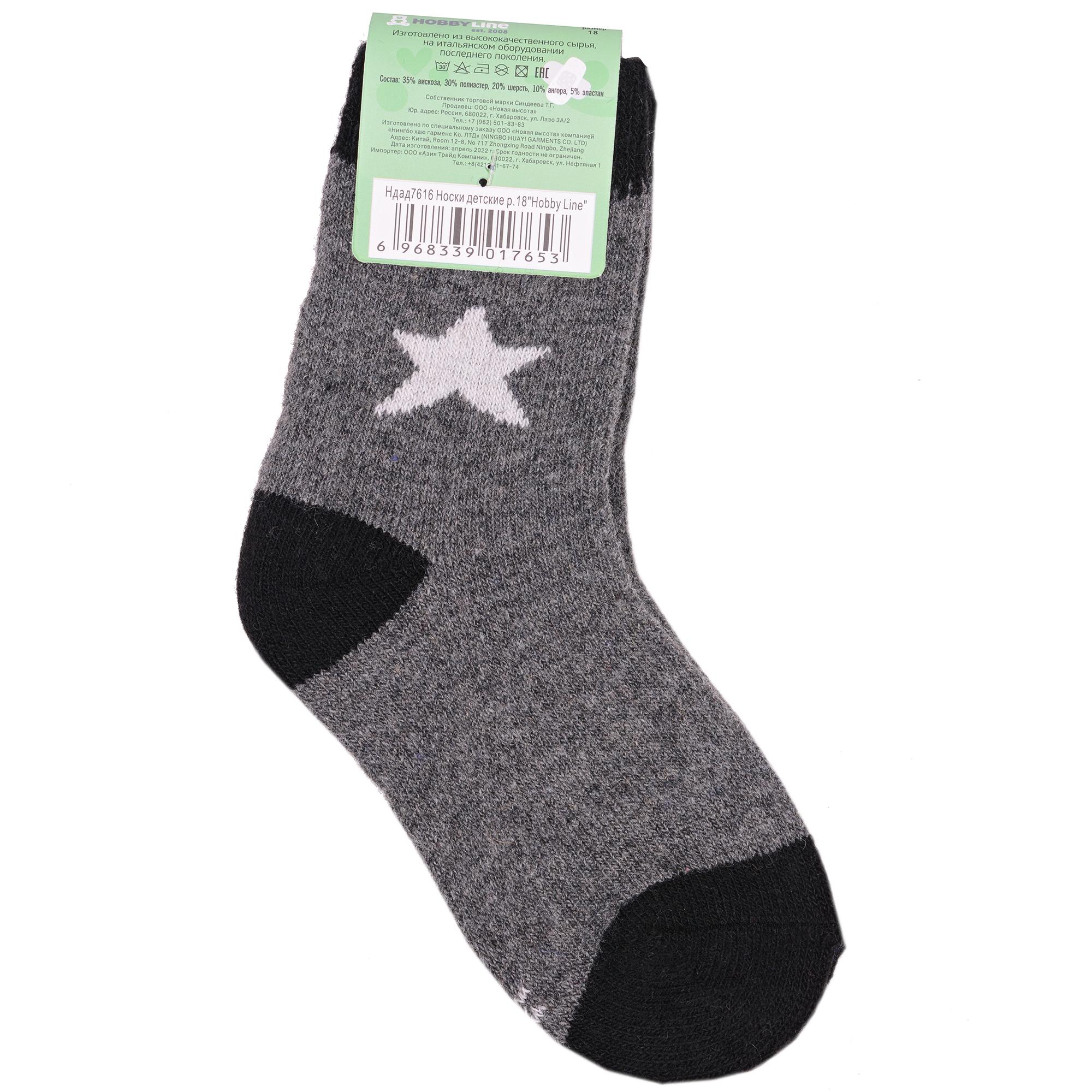 Зимние укороченные детские носки, цвет темно-серый, теплые, повседневные, махровые, шов обычный (не бесшовные), принт (рисунок): контрастные пятка / мысок / резинка, звезды / небо, с узором, состав: 35% вискоза, 20% шерсть, 10% ангора, 30% полиэстер, 5% эластан, арт. Ндад7616. Производитель «Китай, страна бренда - Россия» под брендом «Hobby line».
