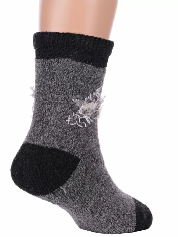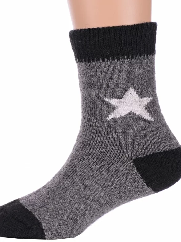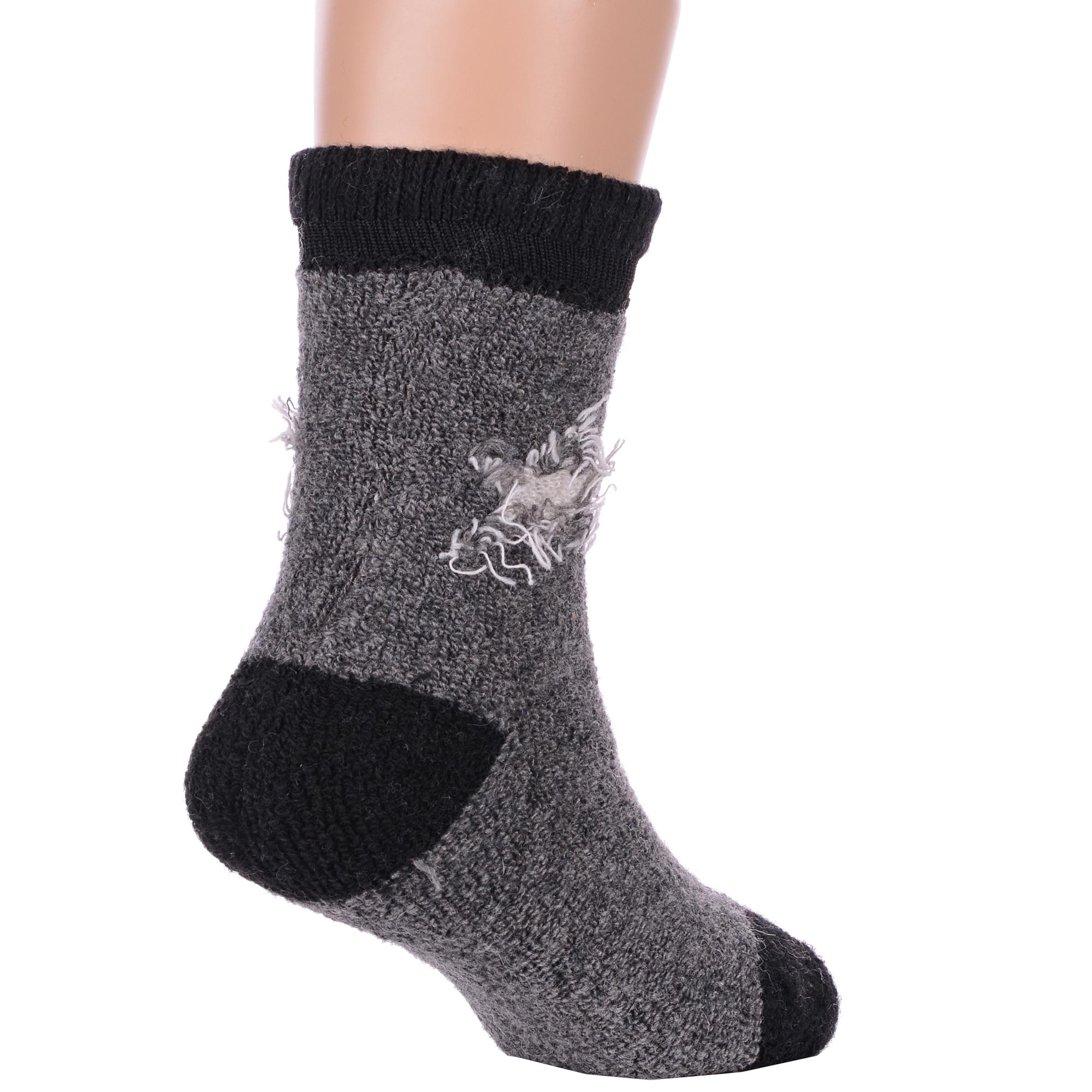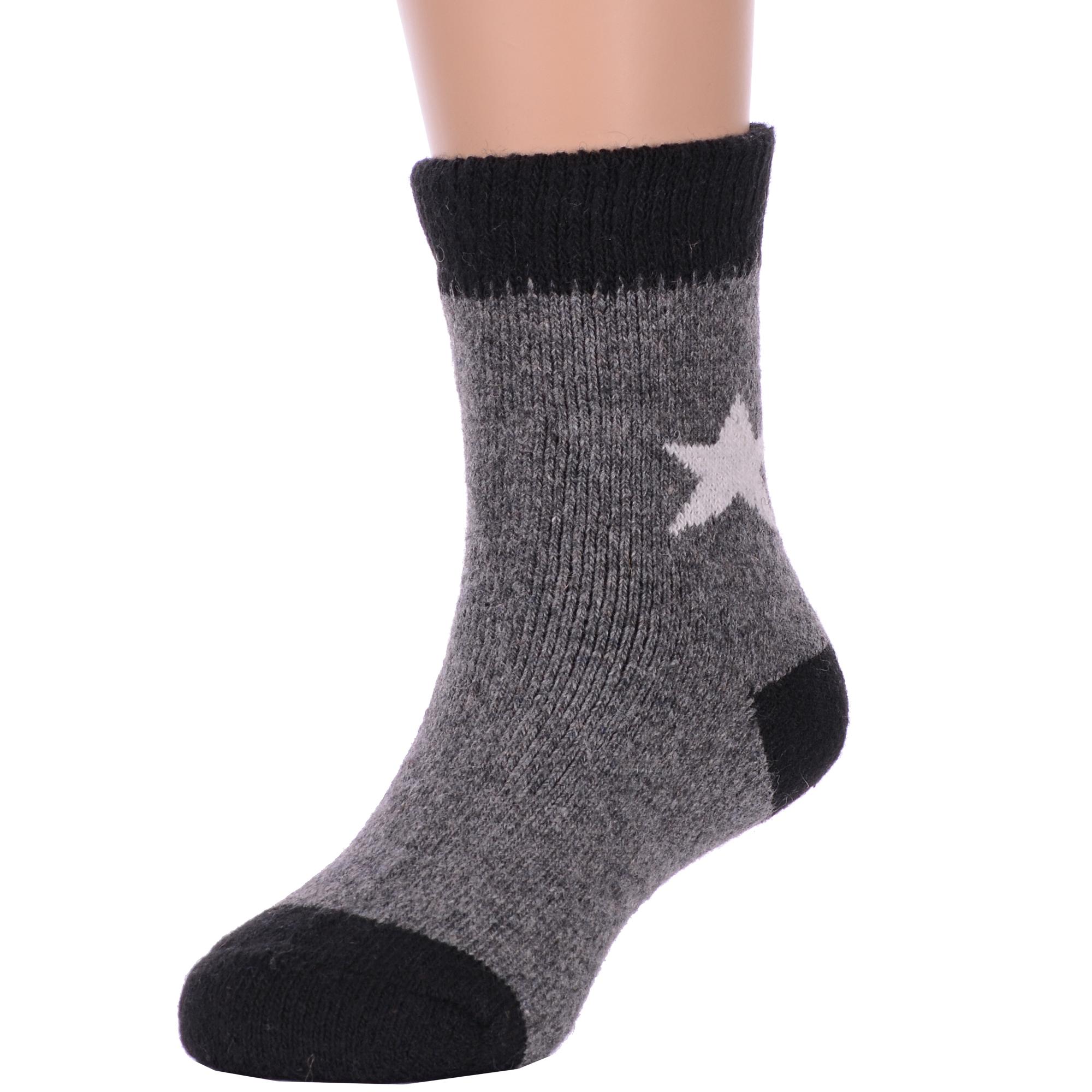 Зимние укороченные детские носки, цвет темно-серый, теплые, повседневные, махровые, шов обычный (не бесшовные), принт (рисунок): контрастные пятка / мысок / резинка, звезды / небо, с узором, состав: 35% вискоза, 20% шерсть, 10% ангора, 30% полиэстер, 5% эластан, арт. Ндад7616. Производитель «Китай, страна бренда - Россия» под брендом «Hobby line».