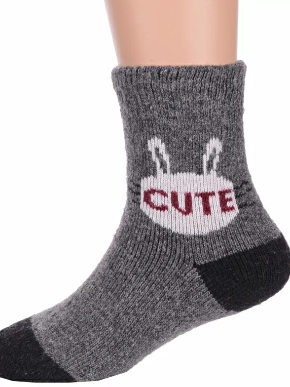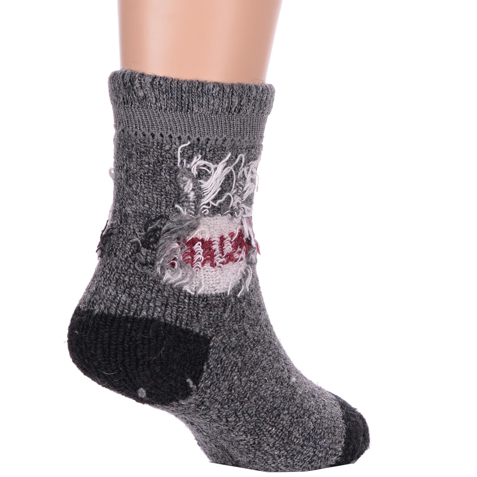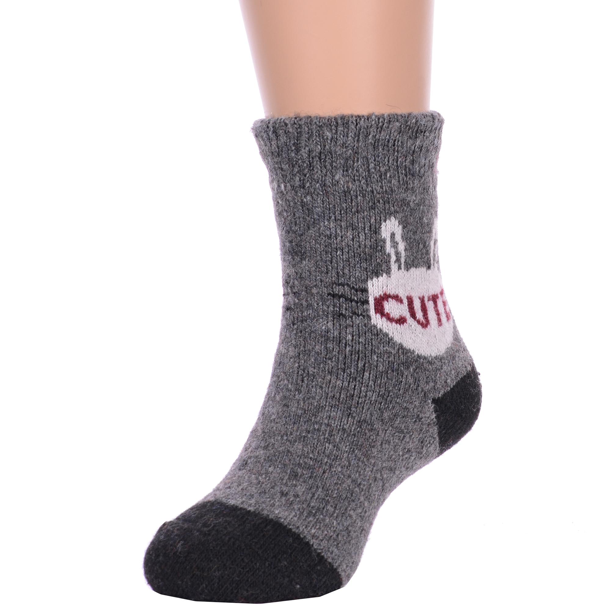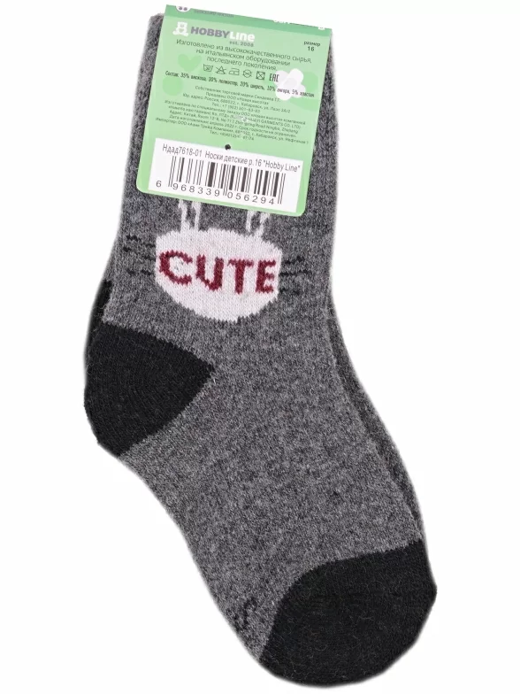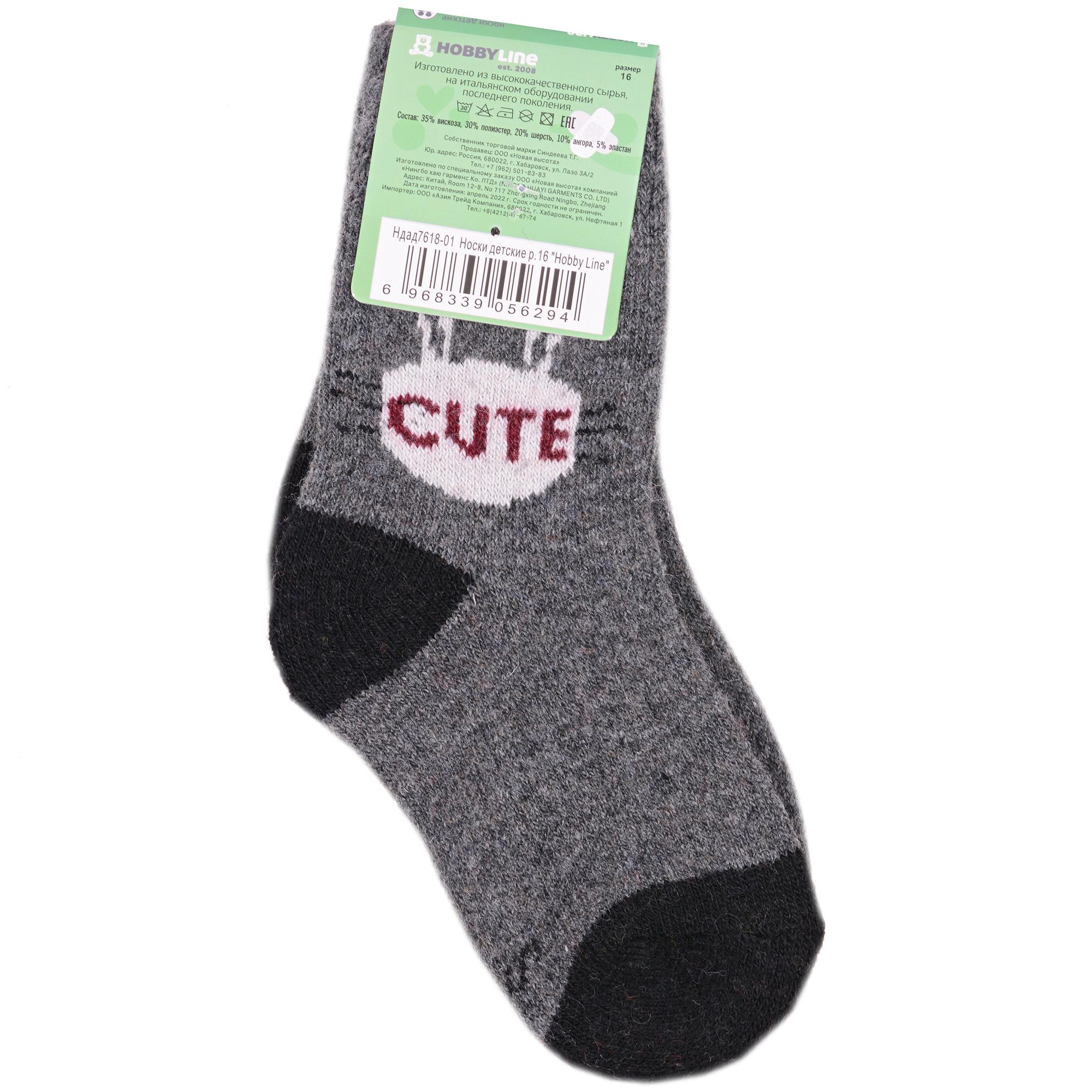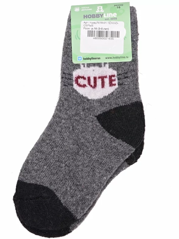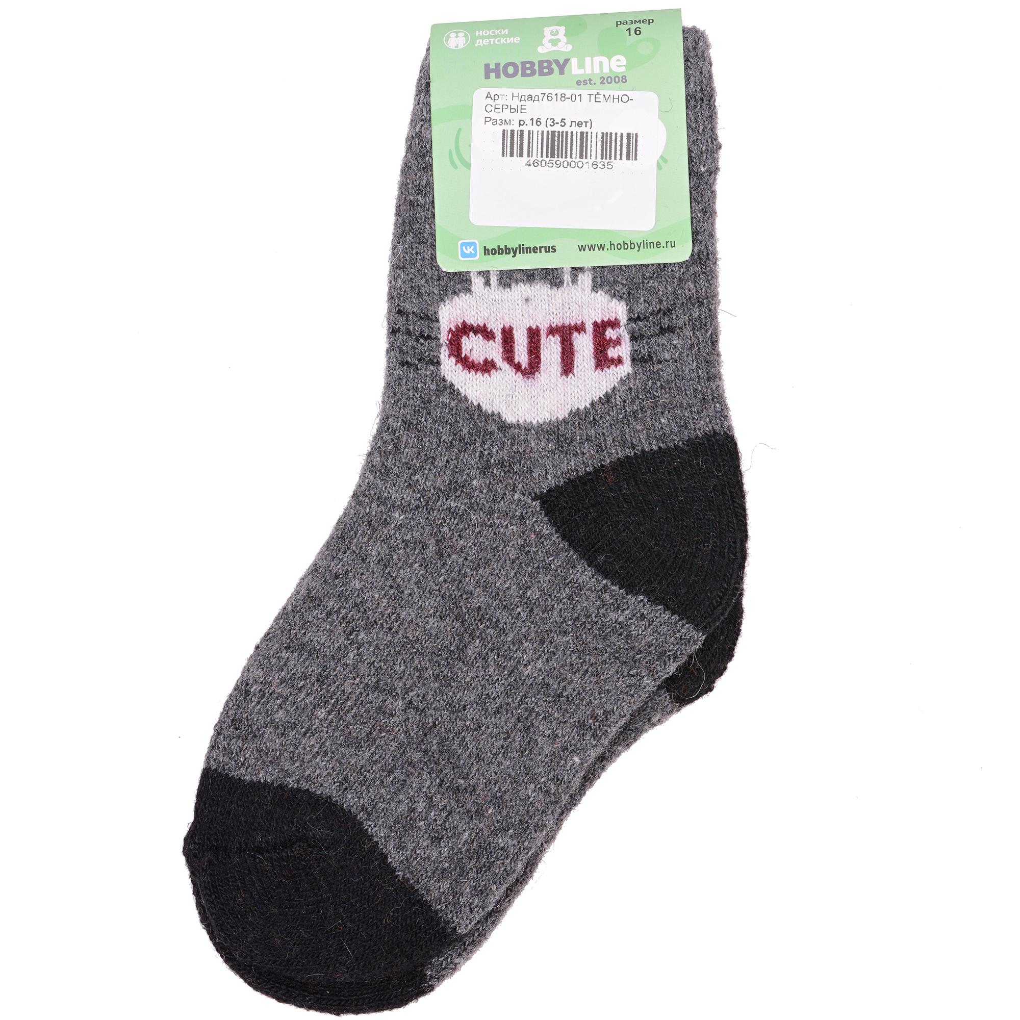 Зимние укороченные детские носки, цвет темно-серый, теплые, повседневные, махровые, шов обычный (не бесшовные), принт (рисунок): надписи, контрастные пятка / мысок / резинка, животные, с узором, состав: 35% вискоза, 20% шерсть, 10% ангора, 30% полиэстер, 5% эластан, арт. Ндад7618-01. Производитель «Китай, страна бренда - Россия» под брендом «Hobby line».