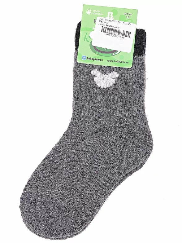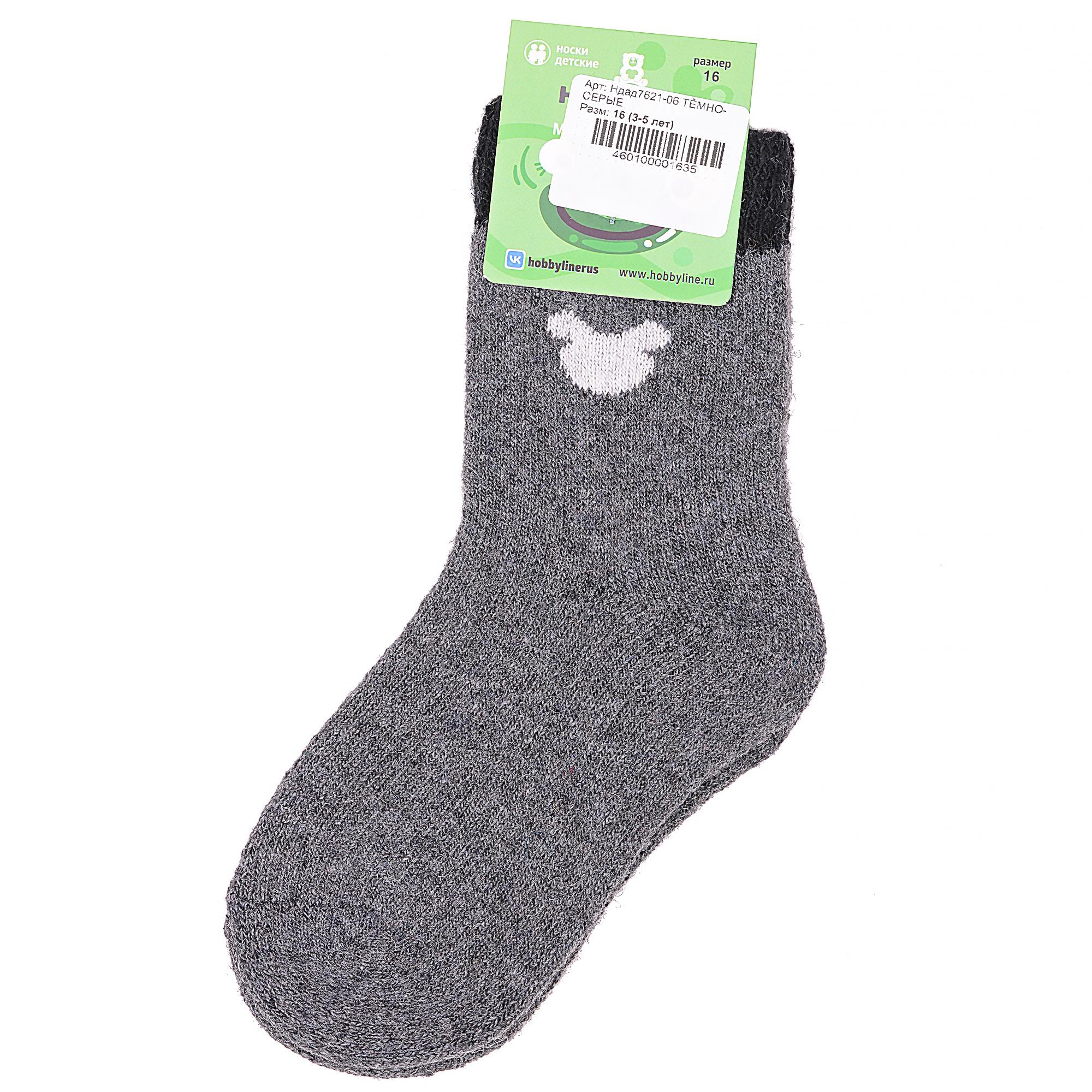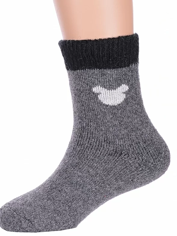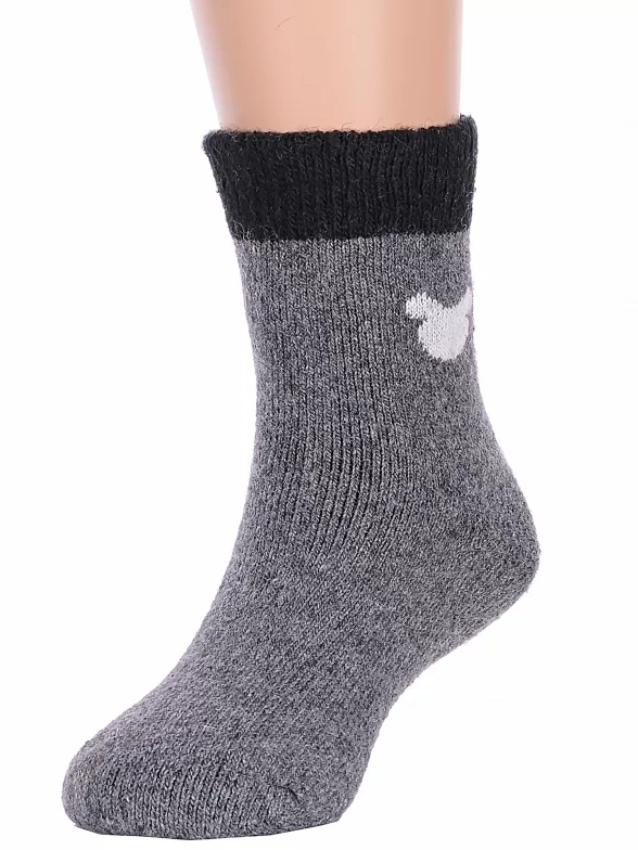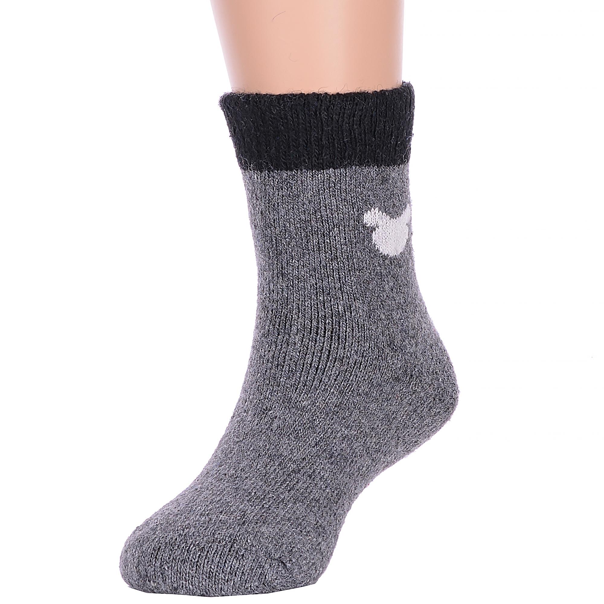 Зимние укороченные детские носки, цвет темно-серый, теплые, повседневные, махровые, шов обычный (не бесшовные), принт (рисунок): контрастные пятка / мысок / резинка, животные, с узором, состав: 35% вискоза, 20% шерсть, 10% ангора, 30% полиэстер, 5% эластан, арт. Ндад7621-06. Производитель «Китай, страна бренда - Россия» под брендом «Hobby line».