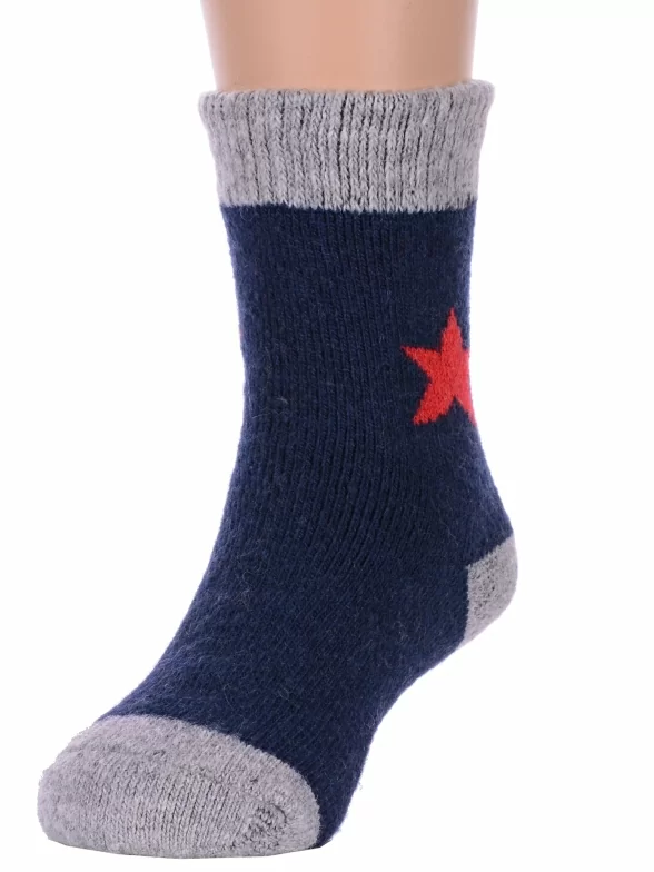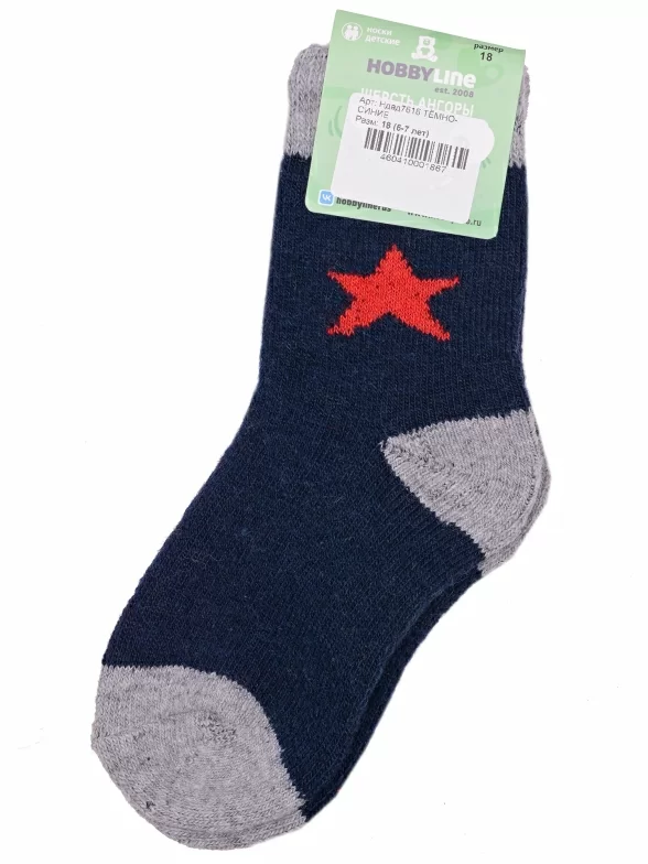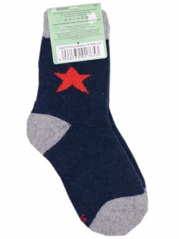 Зимние укороченные детские носки, цвет темно-синий, теплые, повседневные, махровые, шов обычный (не бесшовные), принт (рисунок): контрастные пятка / мысок / резинка, звезды / небо, с узором, состав: 35% вискоза, 20% шерсть, 10% ангора, 30% полиэстер, 5% эластан, арт. Ндад7616. Производитель «Китай, страна бренда - Россия» под брендом «Hobby line».