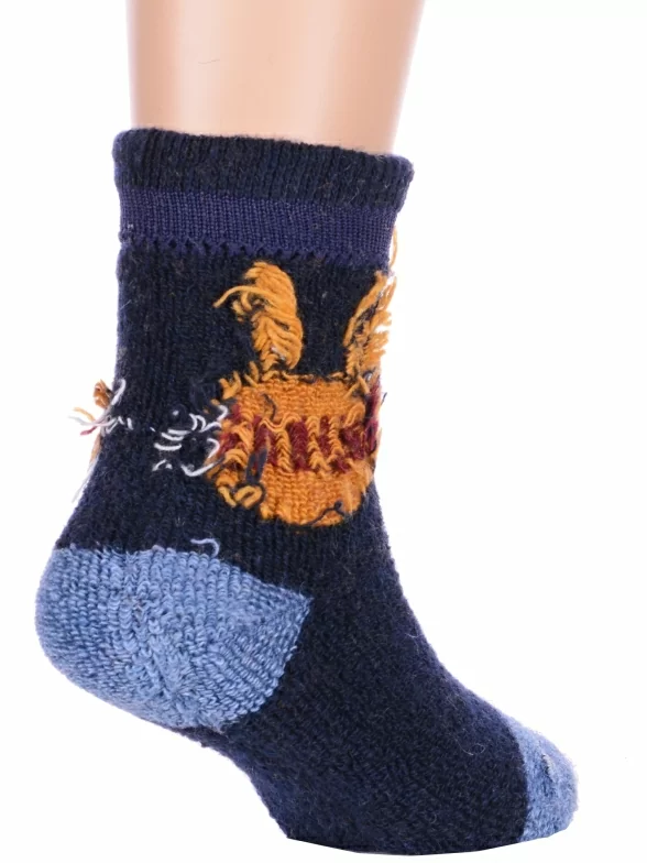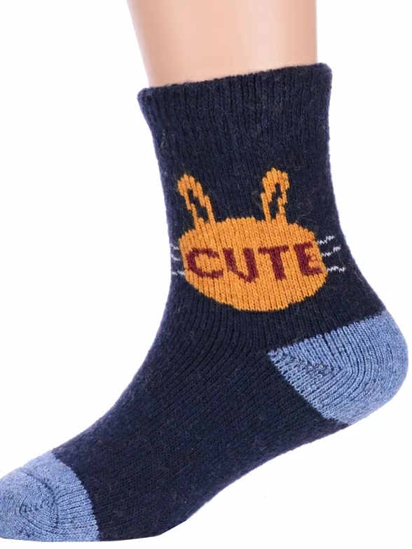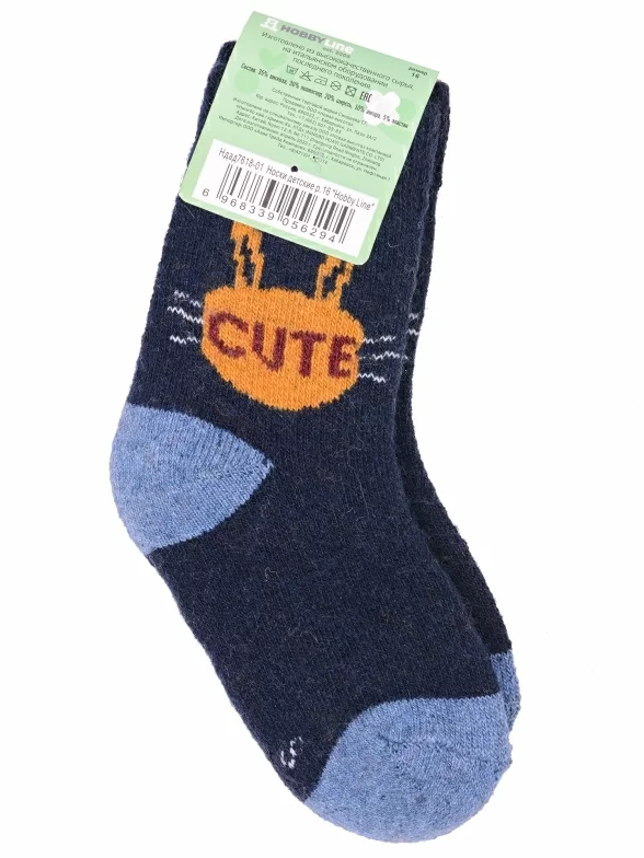 Зимние укороченные детские носки, цвет темно-синий, теплые, повседневные, махровые, шов обычный (не бесшовные), принт (рисунок): надписи, контрастные пятка / мысок / резинка, животные, с узором, состав: 35% вискоза, 20% шерсть, 10% ангора, 30% полиэстер, 5% эластан, арт. Ндад7618-01. Производитель «Китай, страна бренда - Россия» под брендом «Hobby line».