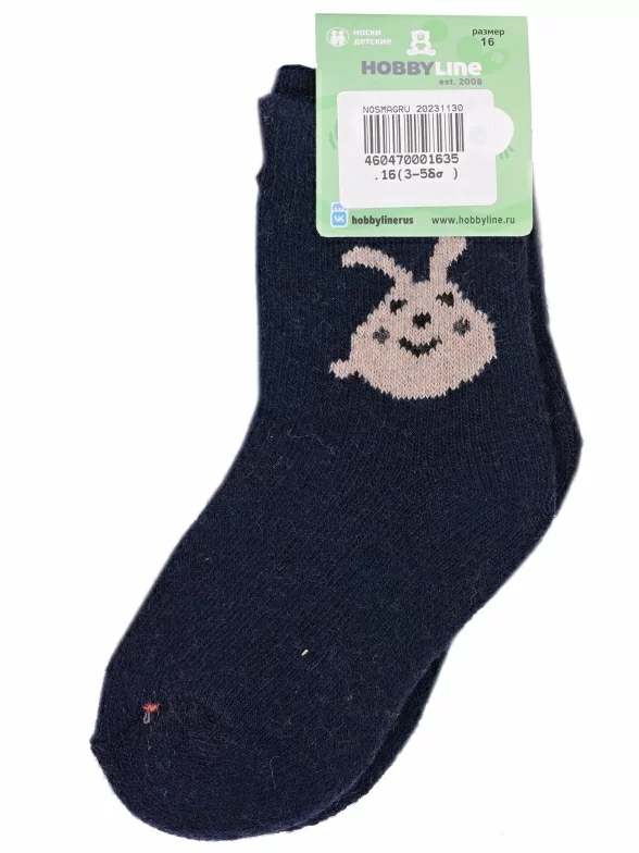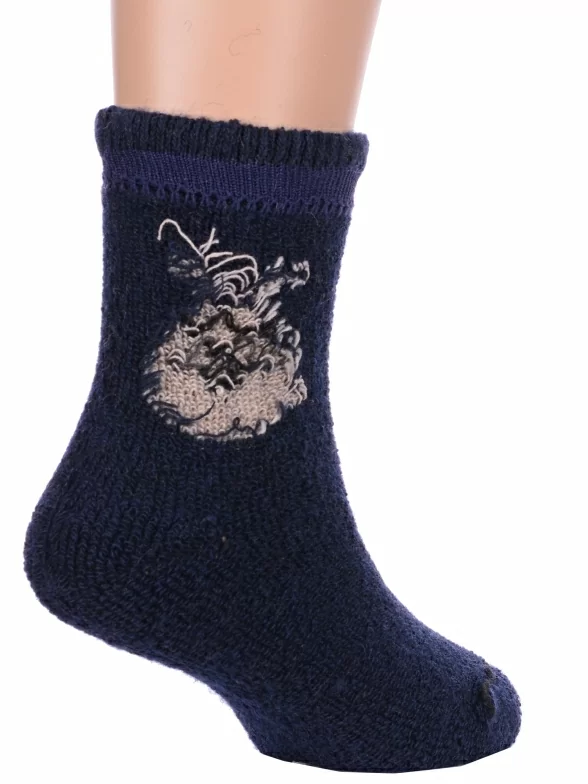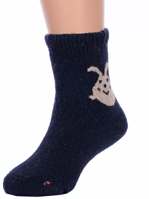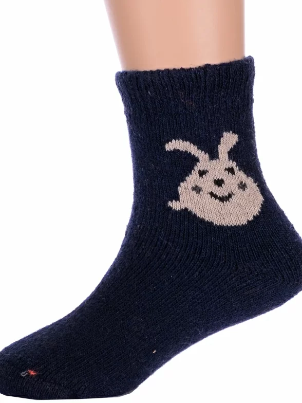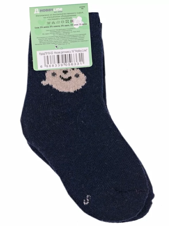 Зимние укороченные детские носки, цвет темно-синий, теплые, повседневные, махровые, шов обычный (не бесшовные), принт (рисунок): животные, с узором, состав: 35% вискоза, 20% шерсть, 10% ангора, 30% полиэстер, 5% эластан, арт. Ндад7618-02. Производитель «Китай, страна бренда - Россия» под брендом «Hobby line».