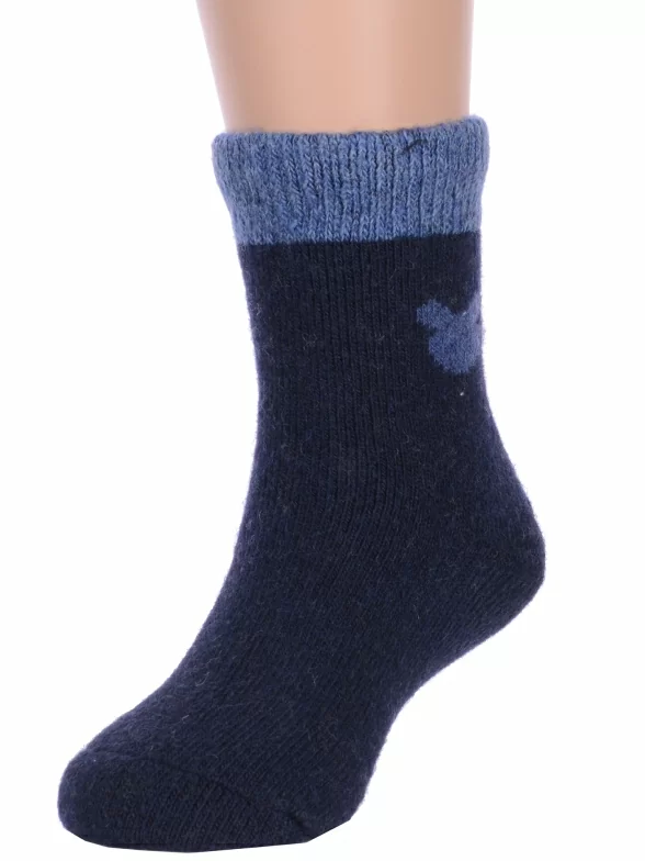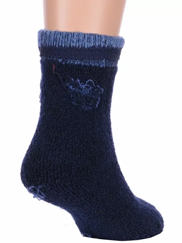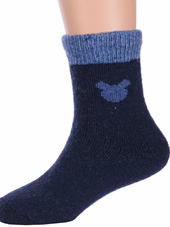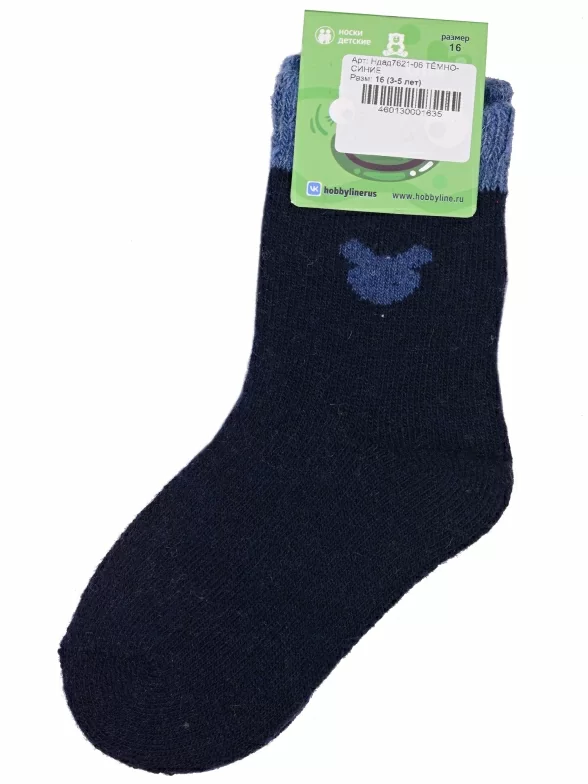 Зимние укороченные детские носки, цвет темно-синий, теплые, повседневные, махровые, шов обычный (не бесшовные), принт (рисунок): контрастные пятка / мысок / резинка, животные, с узором, состав: 35% вискоза, 20% шерсть, 10% ангора, 30% полиэстер, 5% эластан, арт. Ндад7621-06. Производитель «Китай, страна бренда - Россия» под брендом «Hobby line».