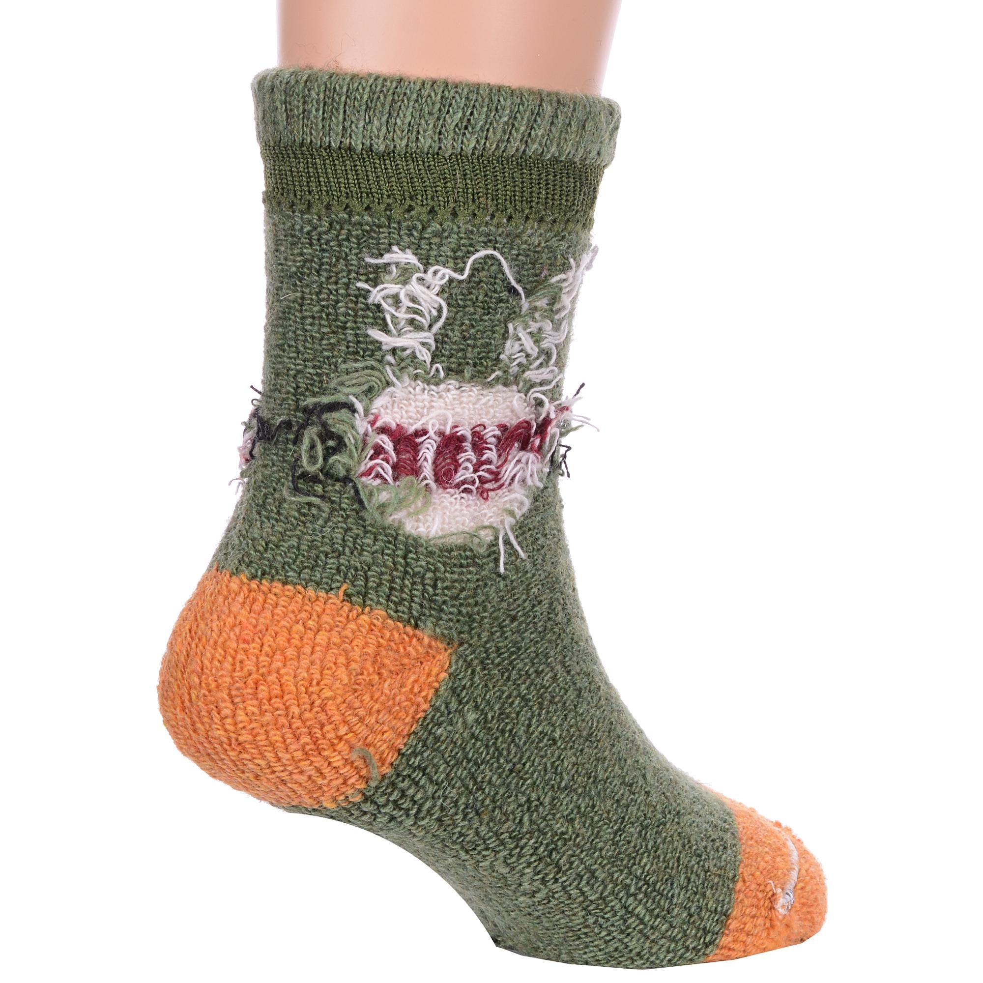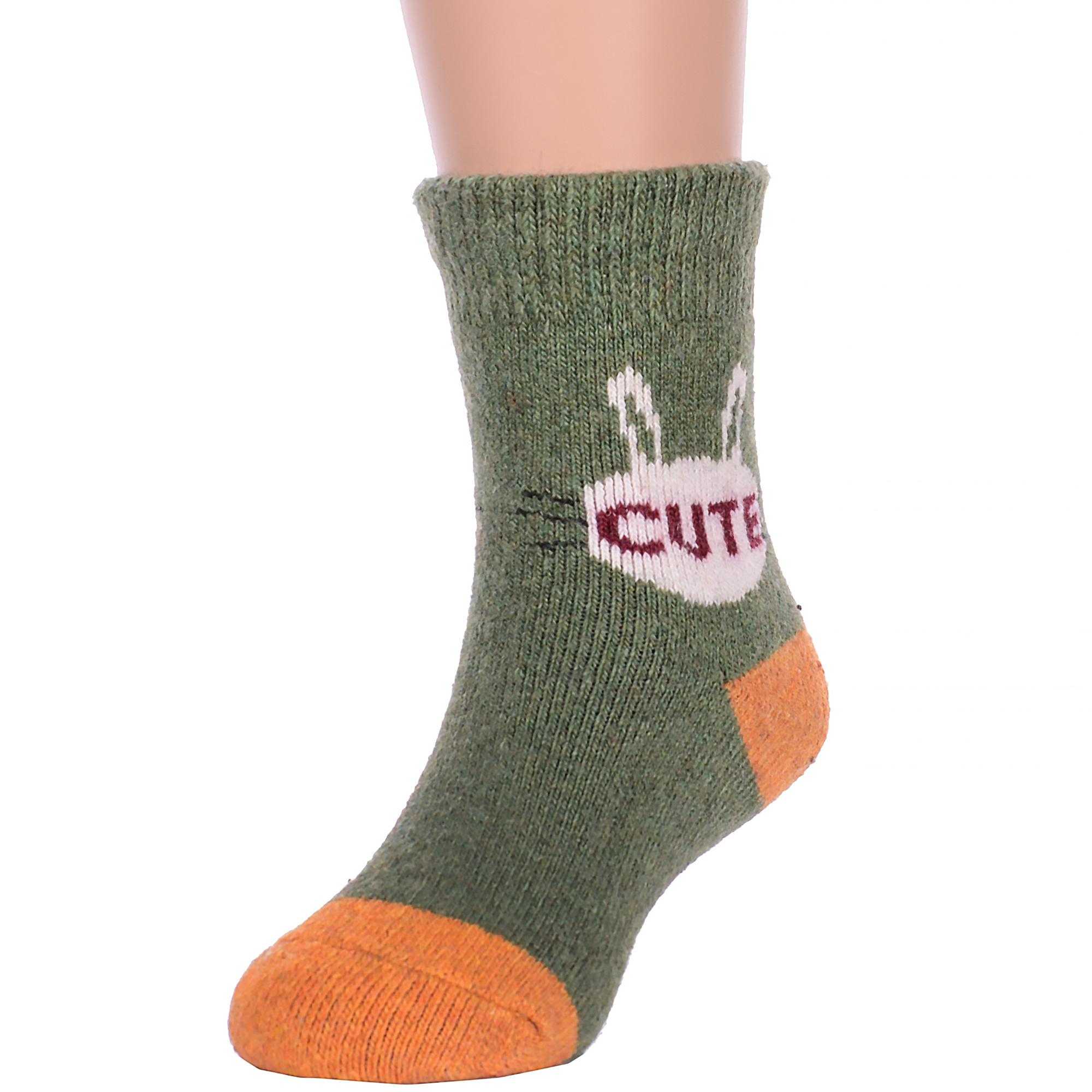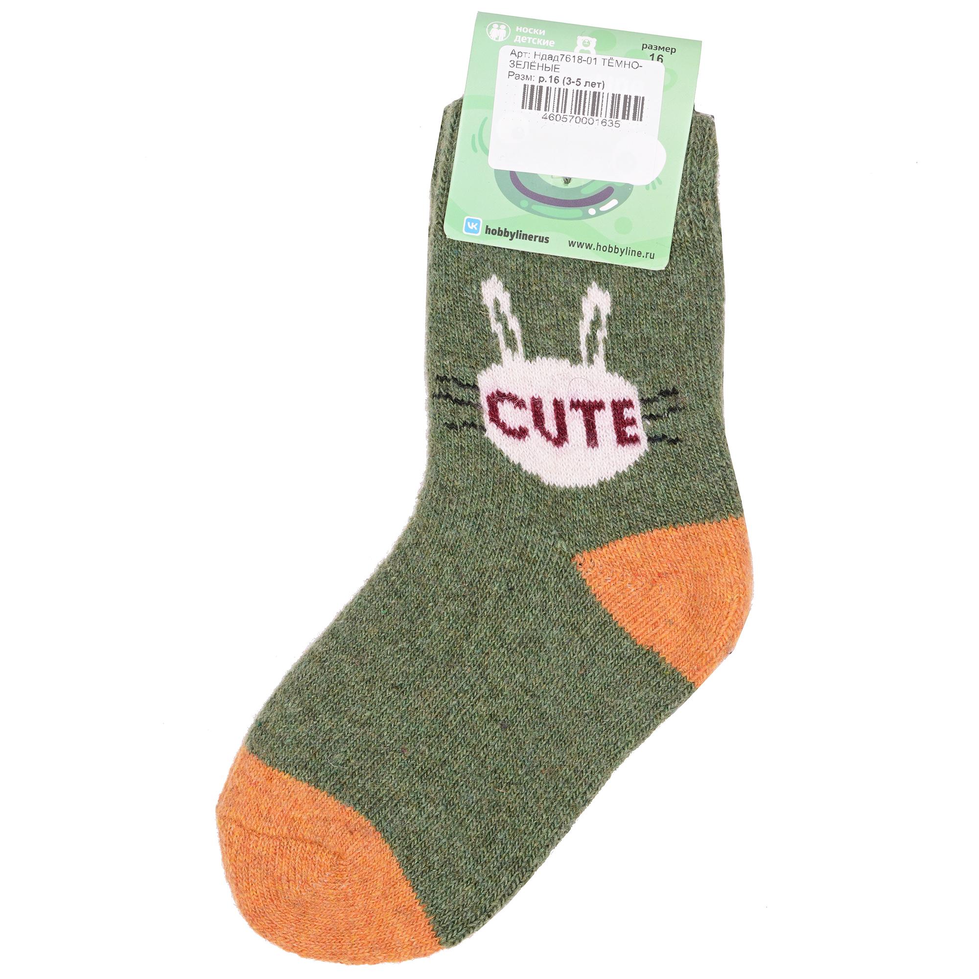Зимние укороченные детские носки, цвет зеленый, теплые, повседневные, махровые, шов обычный (не бесшовные), принт (рисунок): надписи, контрастные пятка / мысок / резинка, животные, с узором, состав: 35% вискоза, 20% шерсть, 10% ангора, 30% полиэстер, 5% эластан, арт. Ндад7618-01. Производитель «Китай, страна бренда - Россия» под брендом «Hobby line».