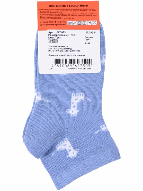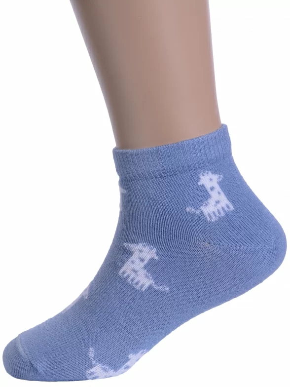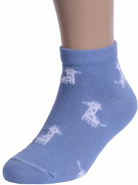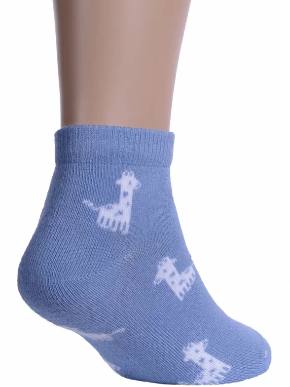 Круглогодичные укороченные детские носки, цвет джинс, шов обычный (не бесшовные), принт (рисунок): животные, состав: 74% хлопок, 24% полиамид, 2% эластан, арт. 15С3085. Производитель «Брестский чулочный комбинат ОАО, Беларусь» под брендом «Брестские (бчк)».