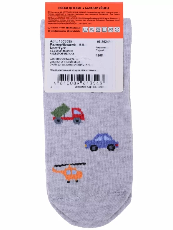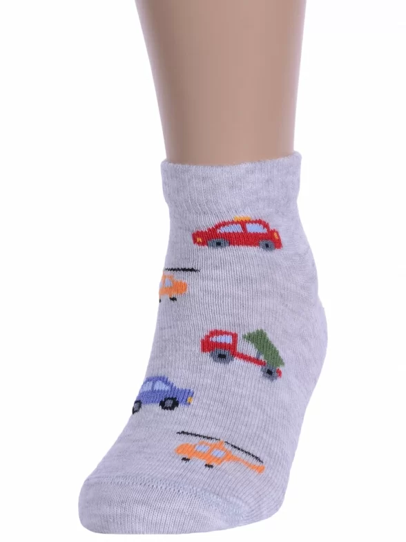 Круглогодичные укороченные детские носки, цвет серый, шов обычный (не бесшовные), принт (рисунок): транспорт, состав: 74% хлопок, 24% полиамид, 2% эластан, арт. 15С3085. Производитель «Брестский чулочный комбинат ОАО, Беларусь» под брендом «Брестские (бчк)».